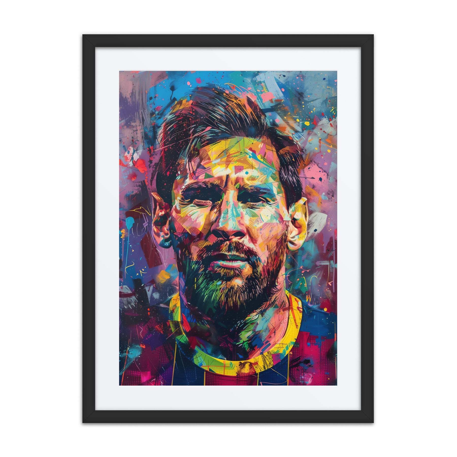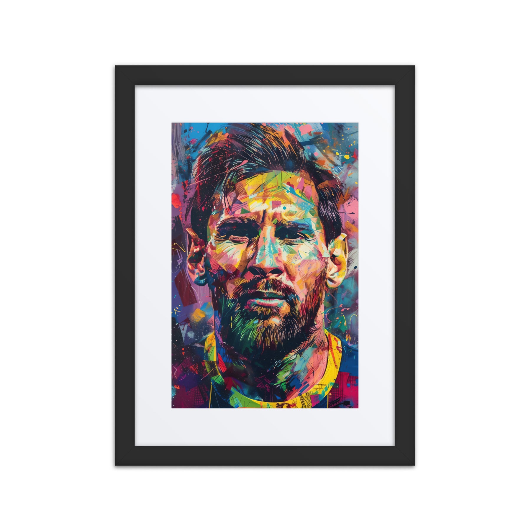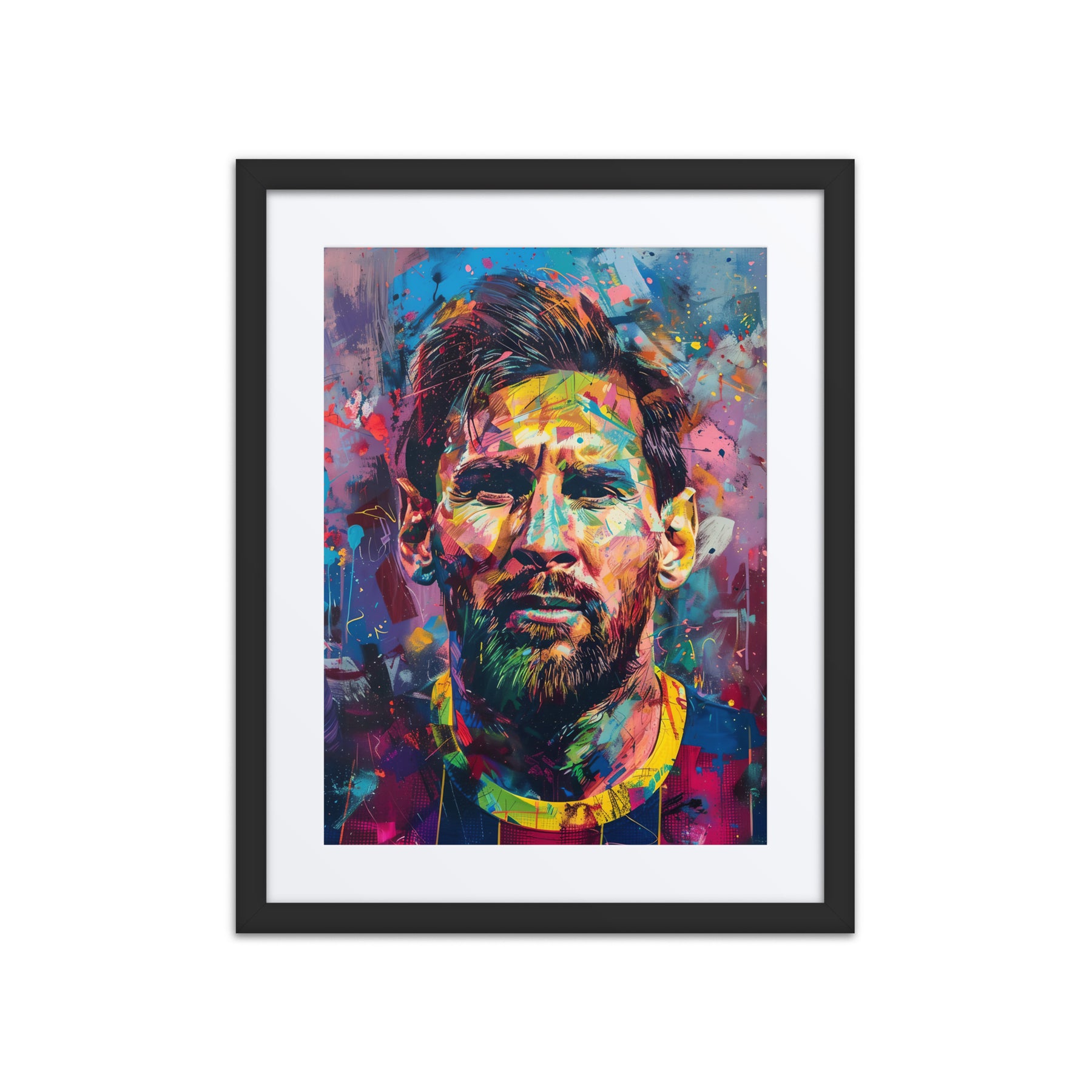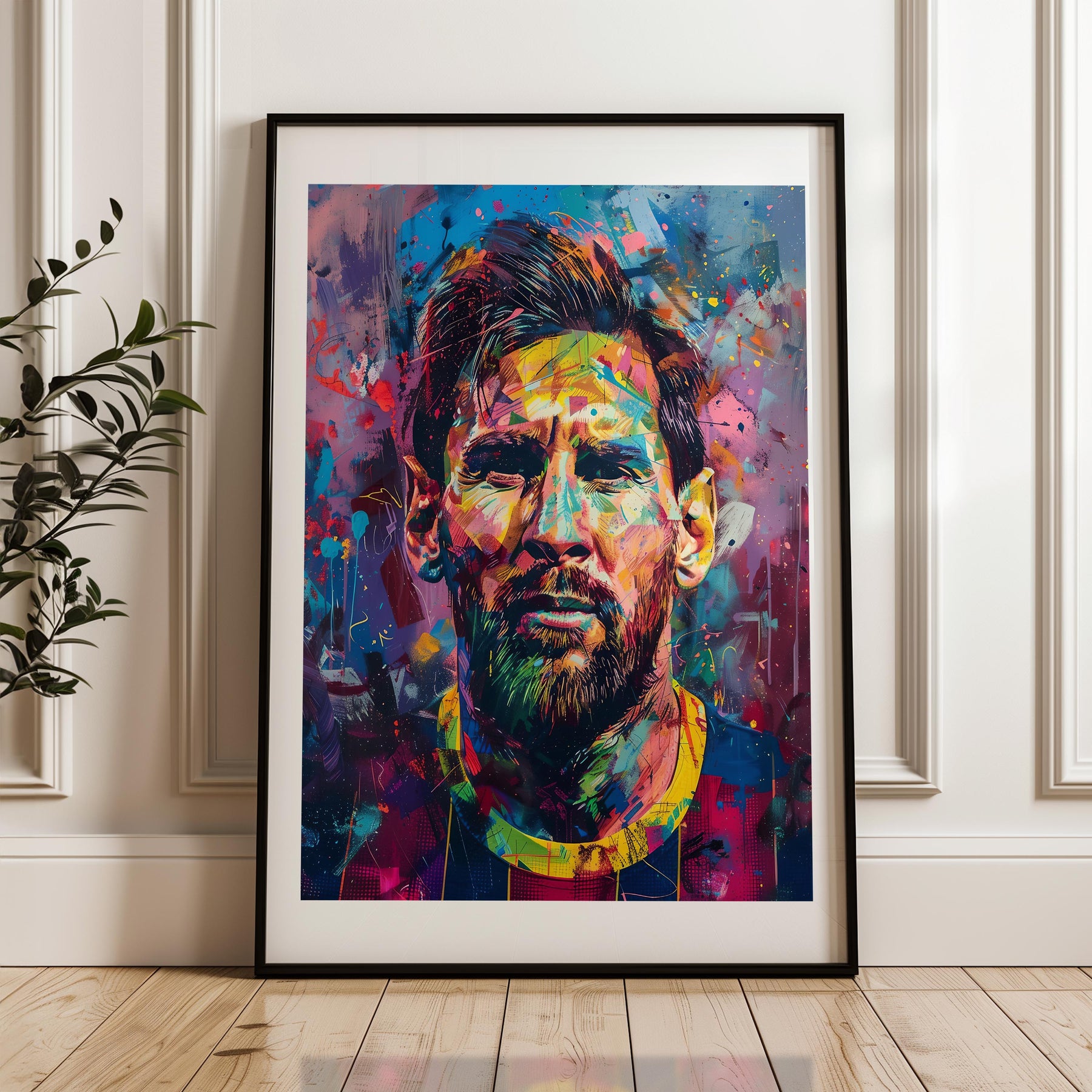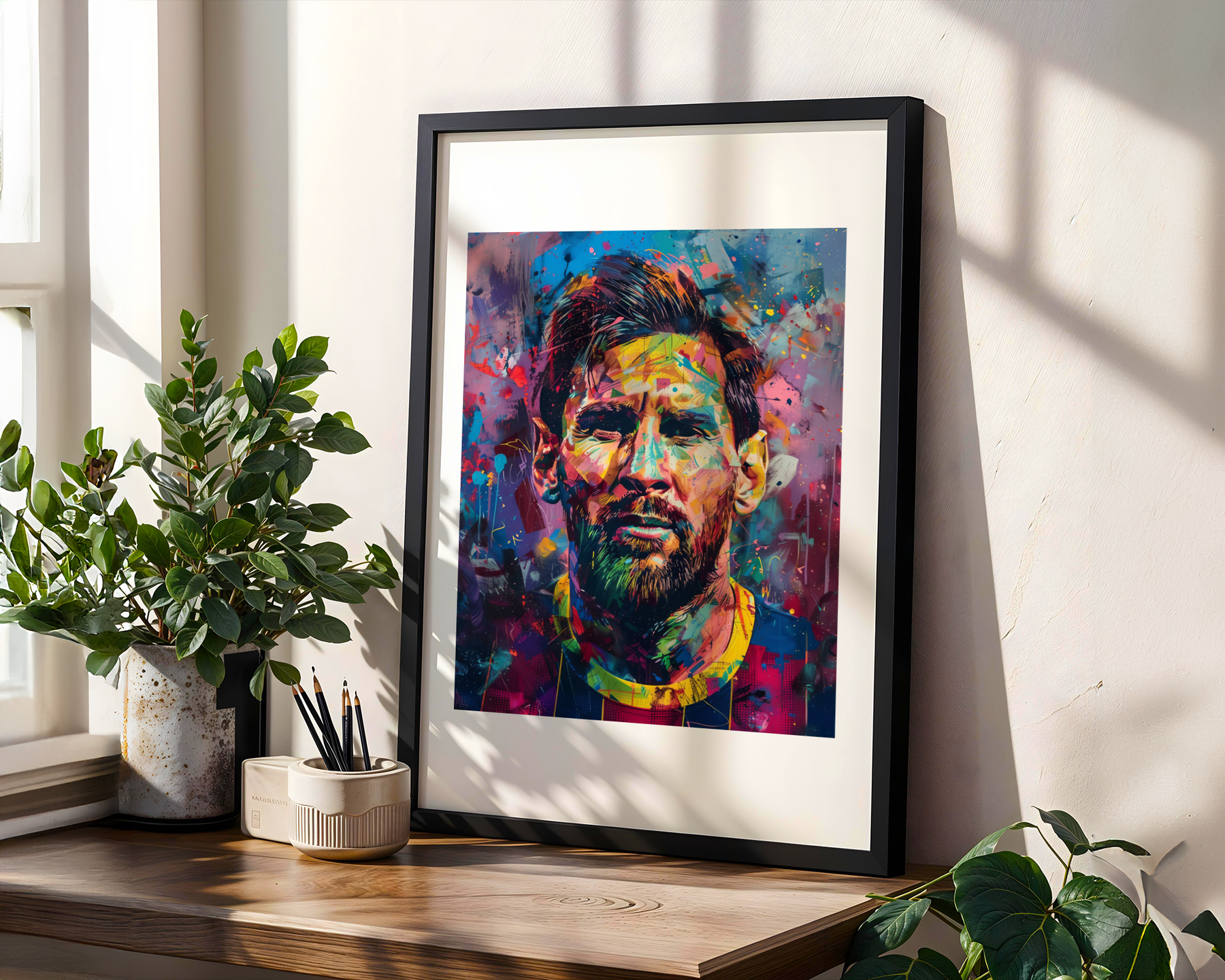 This striking framed poster captures the electrifying presence of Lionel Messi, bathed in a vivid colorstorm that pulses with motion, intensity, and heart. It’s more than a portrait—it’s a tribute to greatness, grit, and the rhythm of a game that moves the world.