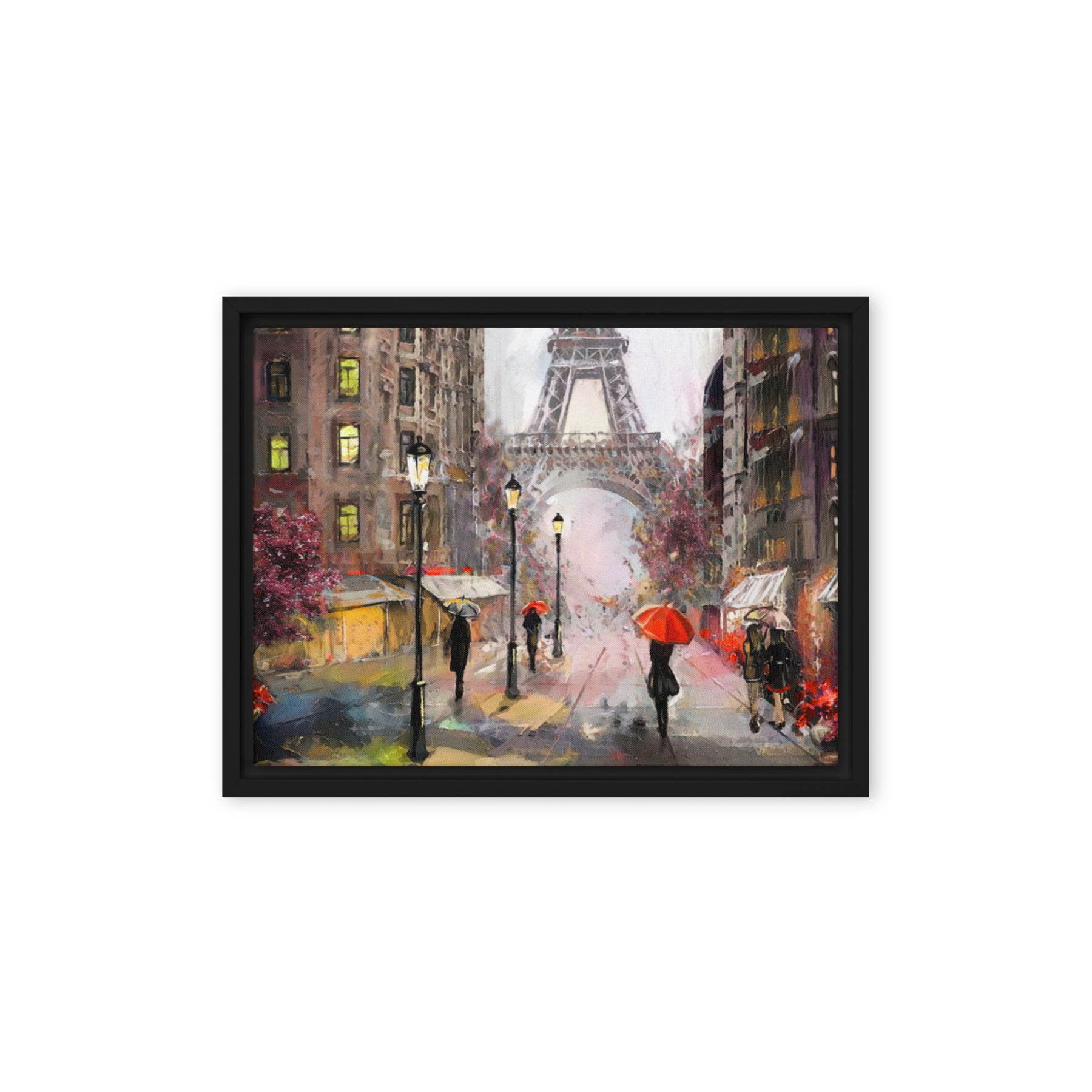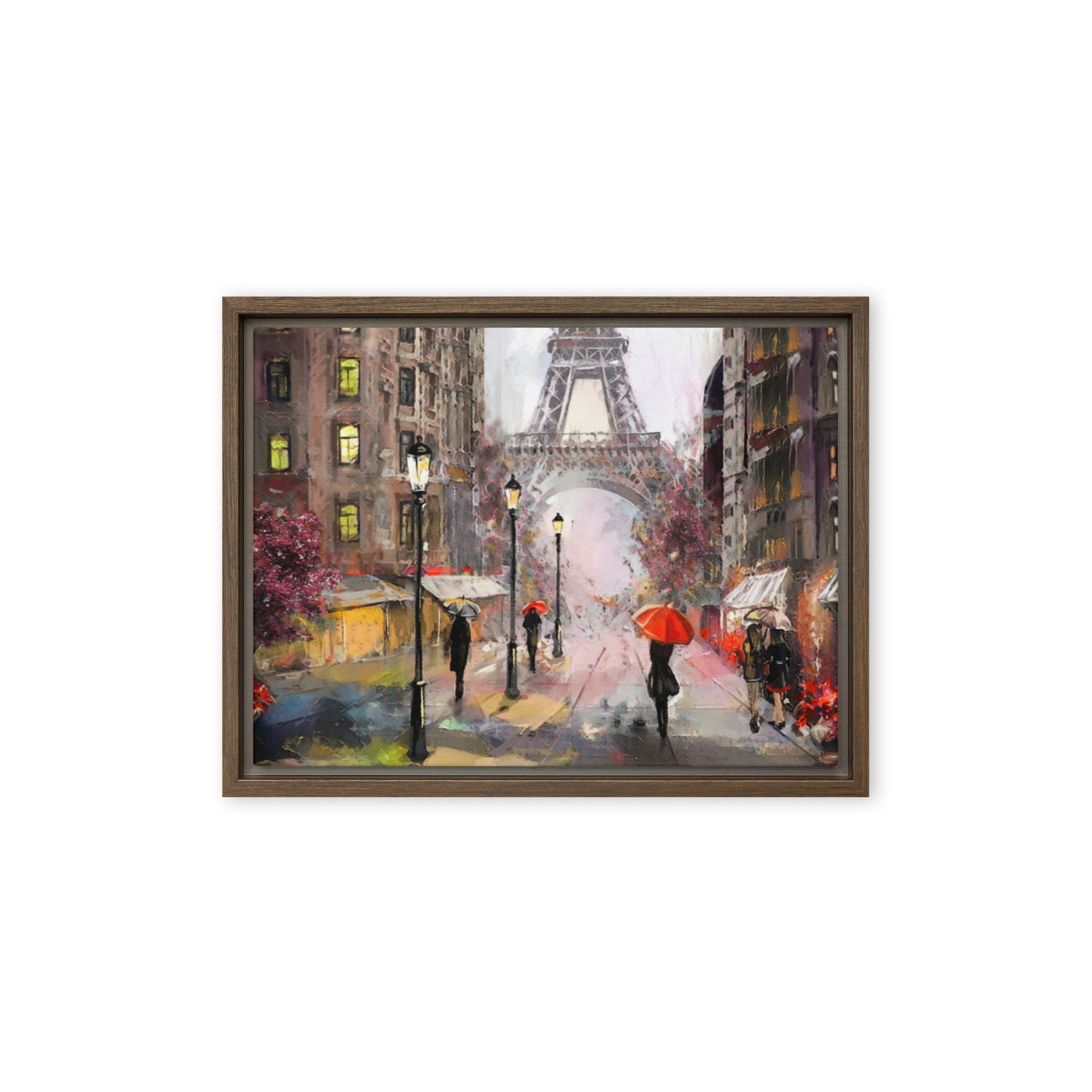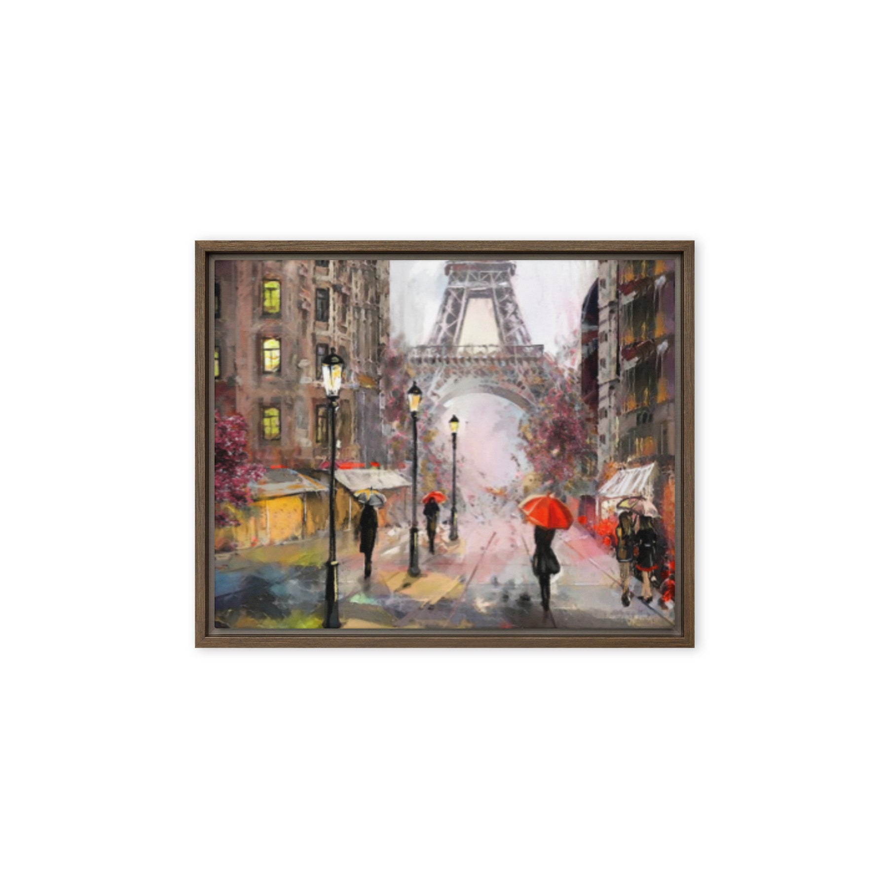 Capture the essence of Parisian elegance with this stunning canvas that brings to life a misty morning near the Eiffel Tower. Figures with umbrellas traverse the foggy, flower-lined streets, rendered in soft greys and vibrant pops of color that draw the eye. This artwork, framed beautifully to complement its urban theme, makes a striking statement in any décor, inviting viewers to linger in its mysterious, early morning atmosphere.