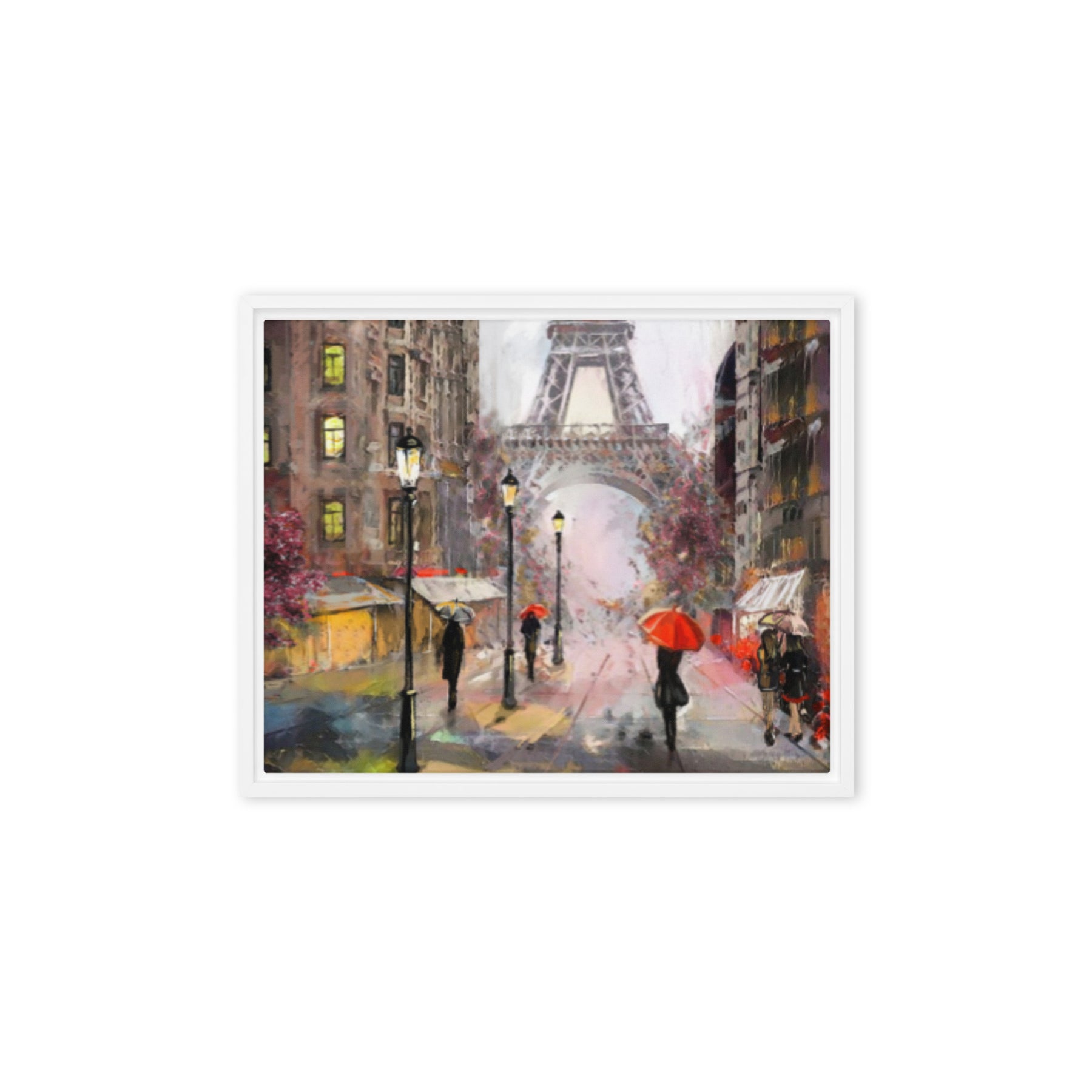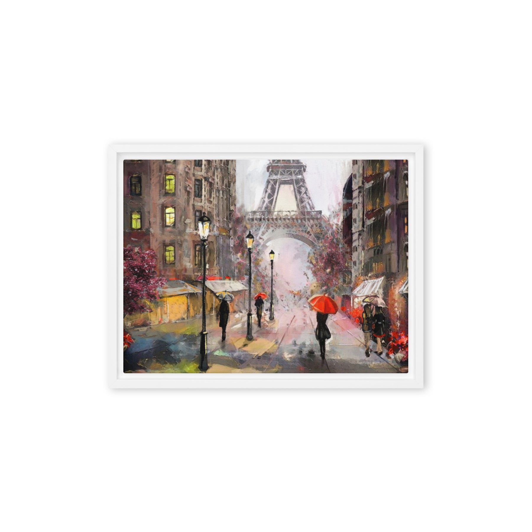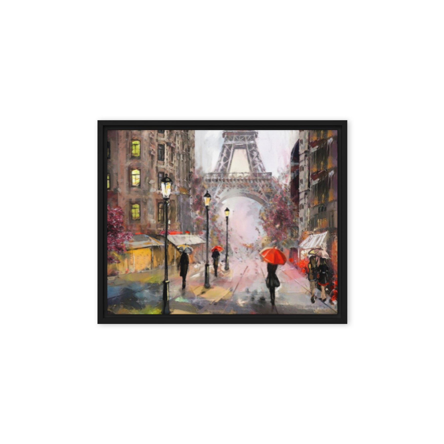Capture the essence of Parisian elegance with this stunning canvas that brings to life a misty morning near the Eiffel Tower. Figures with umbrellas traverse the foggy, flower-lined streets, rendered in soft greys and vibrant pops of color that draw the eye. This artwork, framed beautifully to complement its urban theme, makes a striking statement in any décor, inviting viewers to linger in its mysterious, early morning atmosphere.