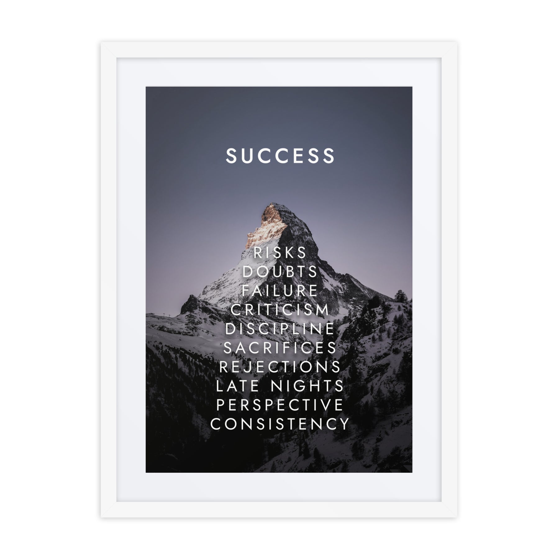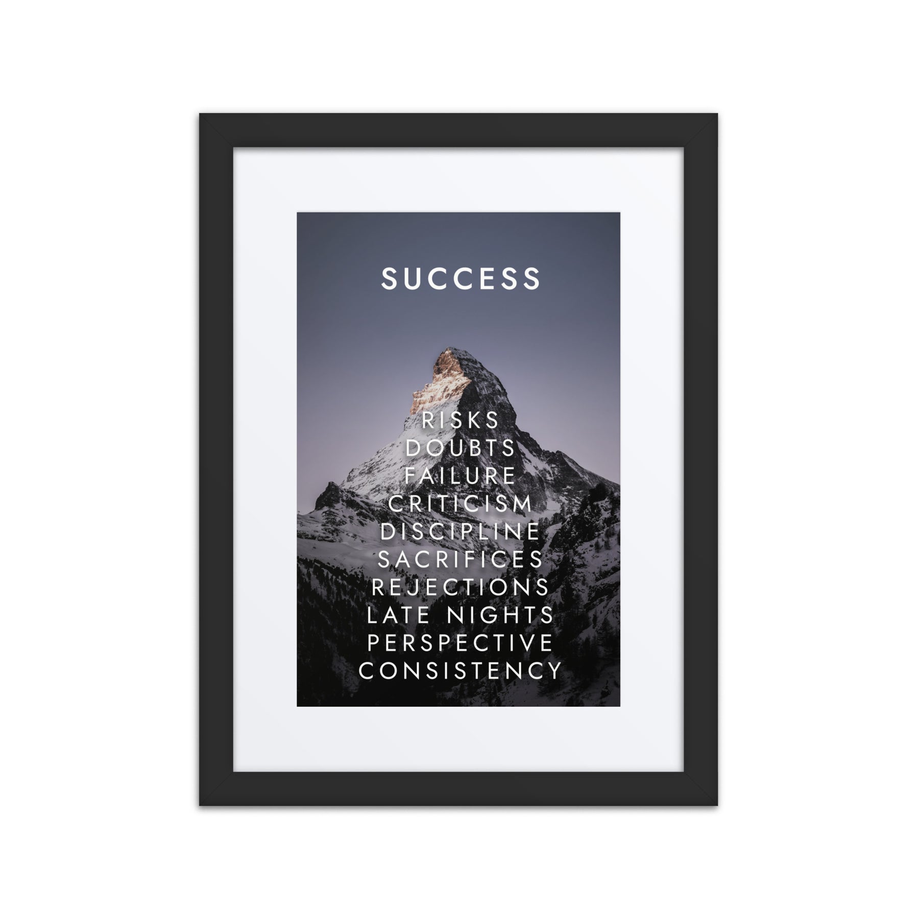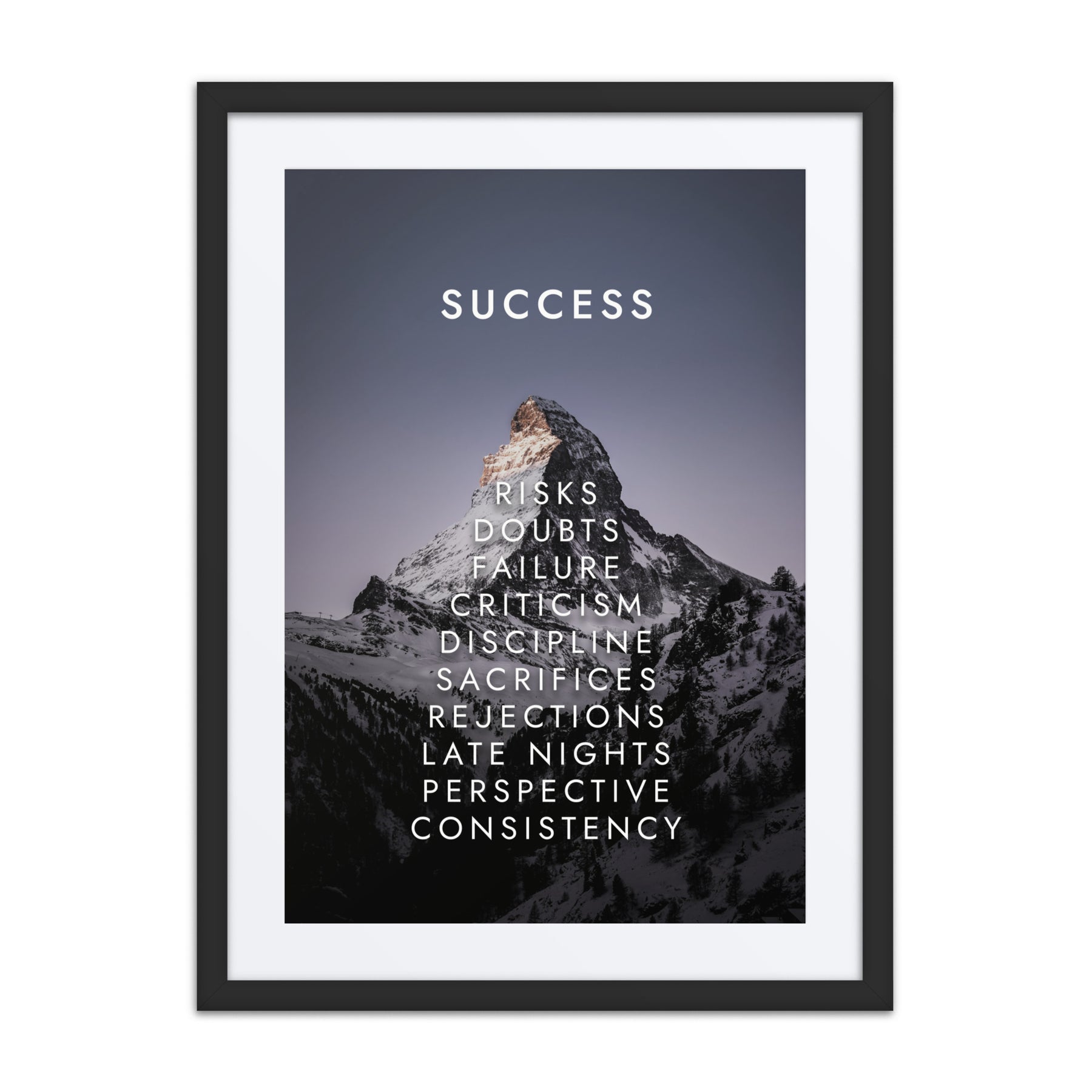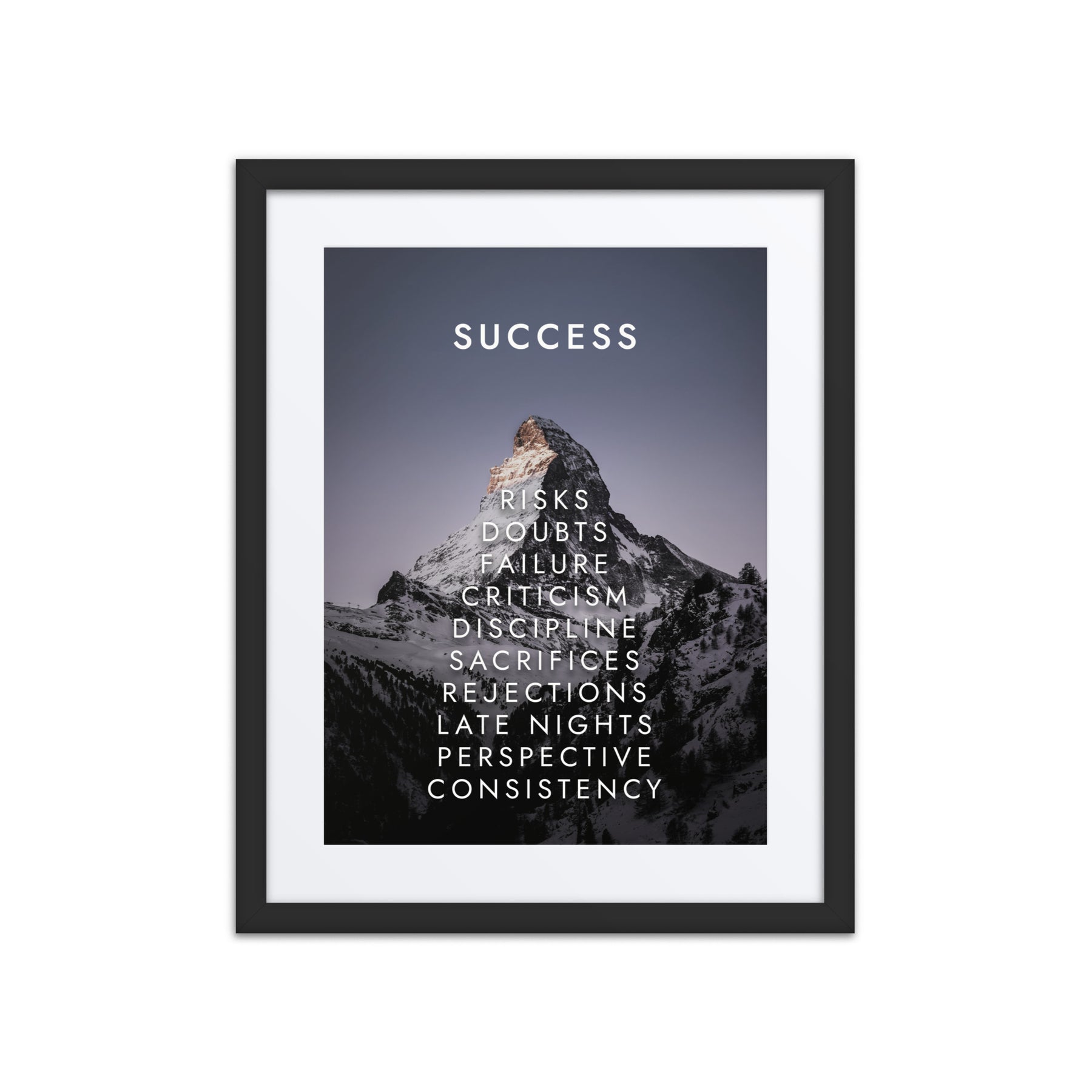 Reach new heights with this inspiring "Success" framed wall art! Showcasing a stunning mountain backdrop , it highlights the key traits necessary for success: risks, discipline , and perseverance. Ideal for any living room or workspace , this piece not only beautifies your decor but also fuels your ambition . Let it inspire you to conquer your dreams every day!