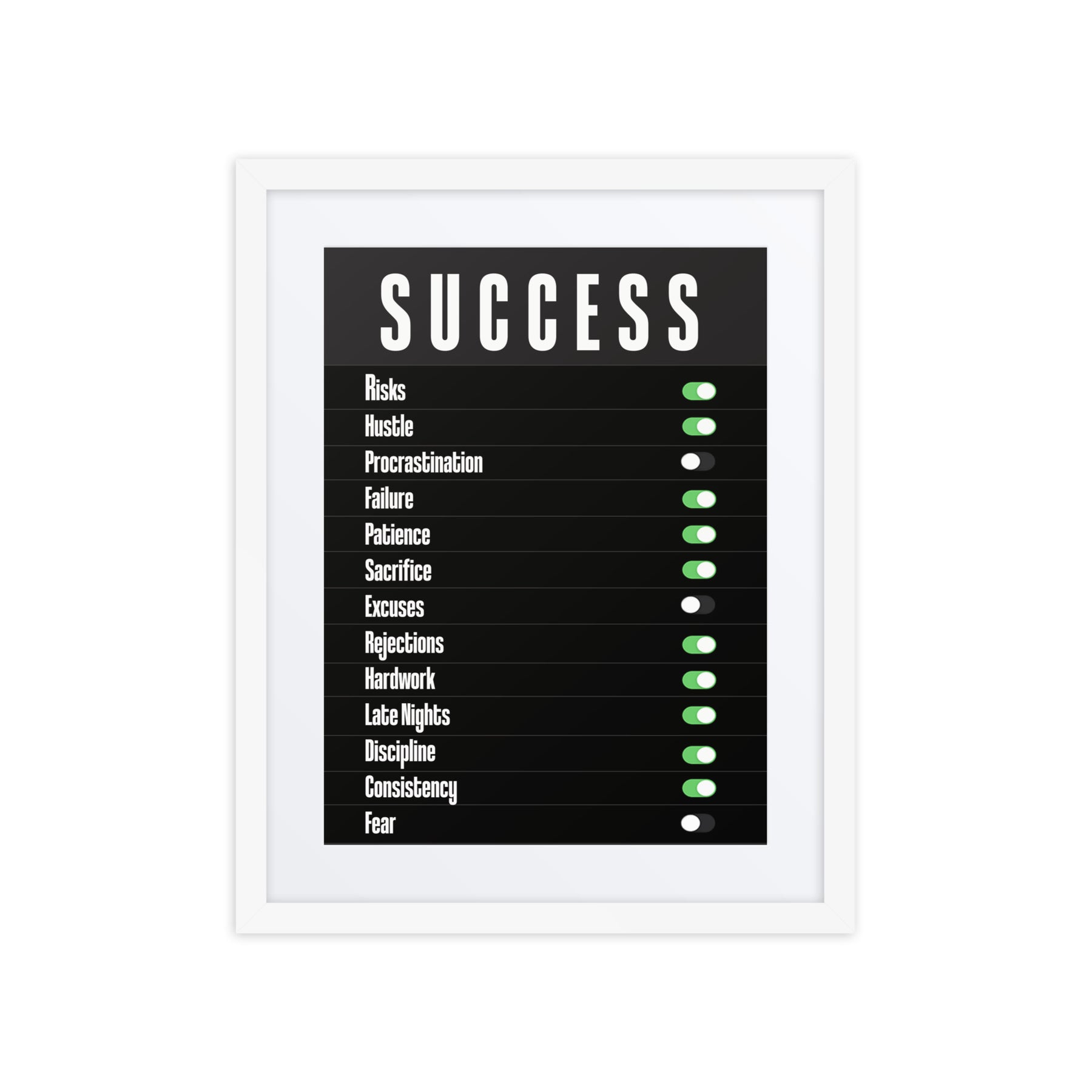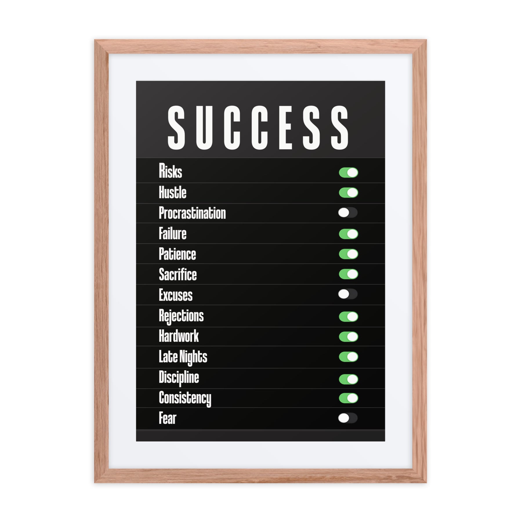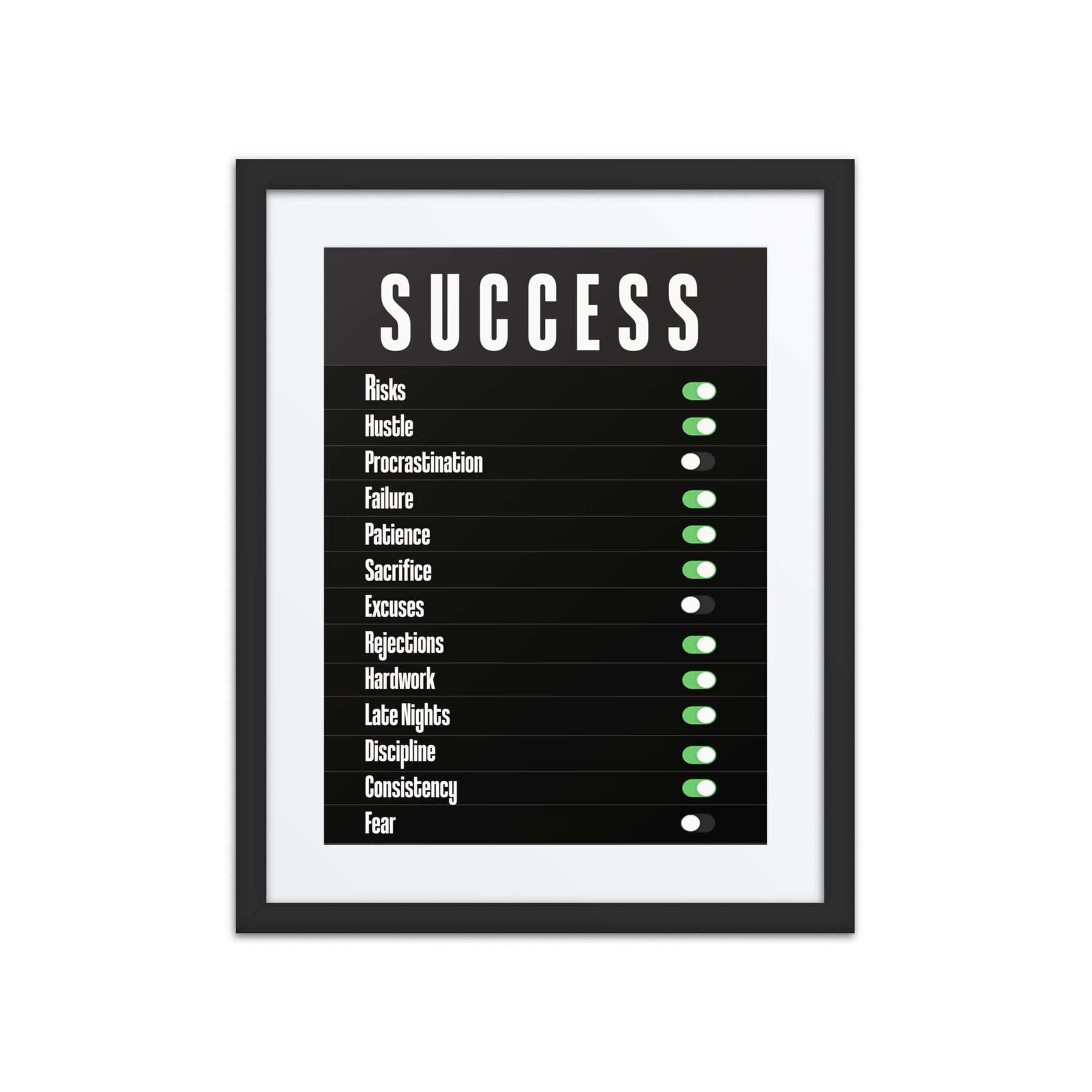 Illuminate your path to achievement with this striking "Success" framed poster art! Featuring a fun toggle switch design, it emphasizes key traits such as hustle, discipline , and patience , reminding you that success is within reach. Perfect for your office or living room, this wall art decor not only enhances your space but also inspires determination . Transform your home decor into a motivational masterpiece !