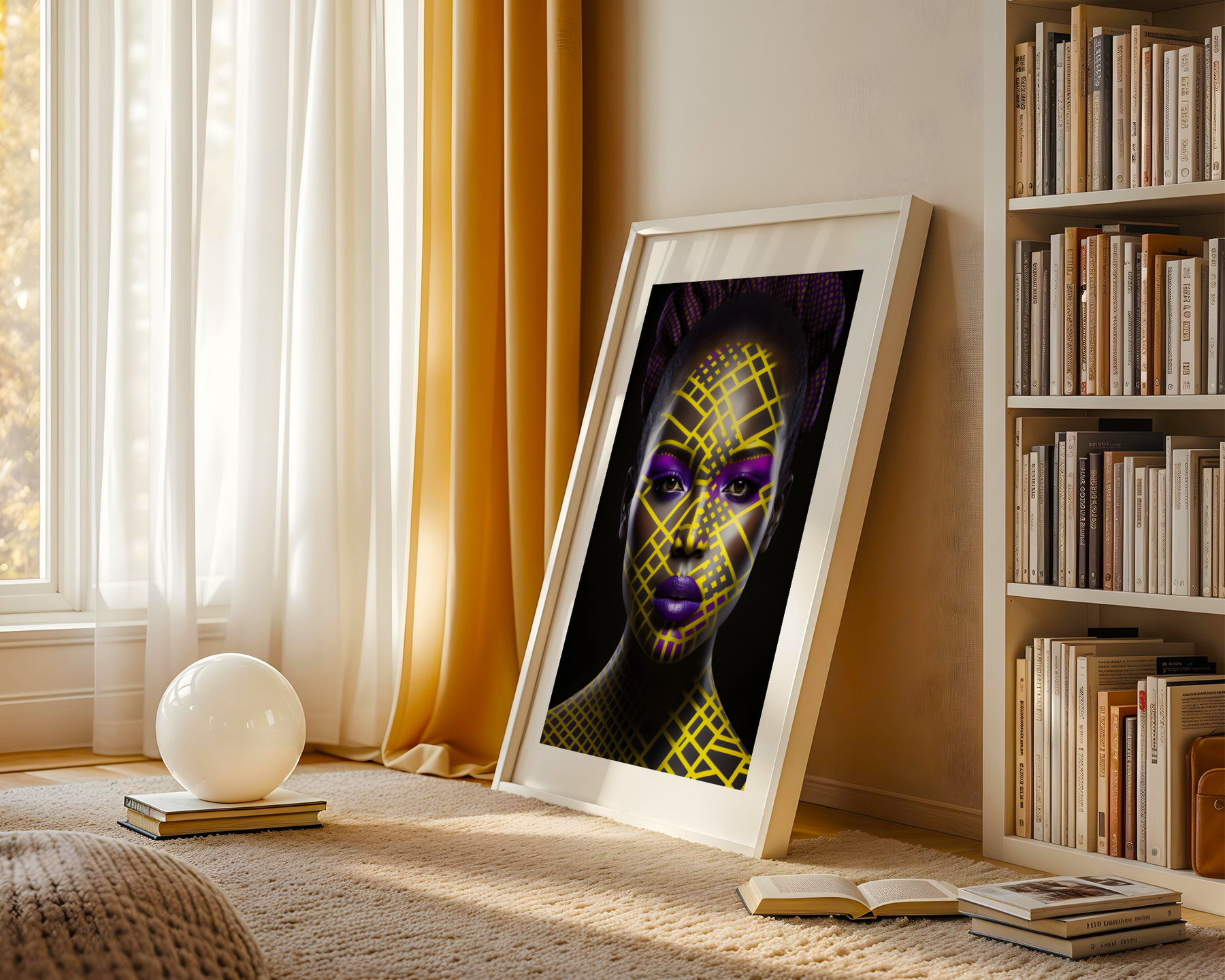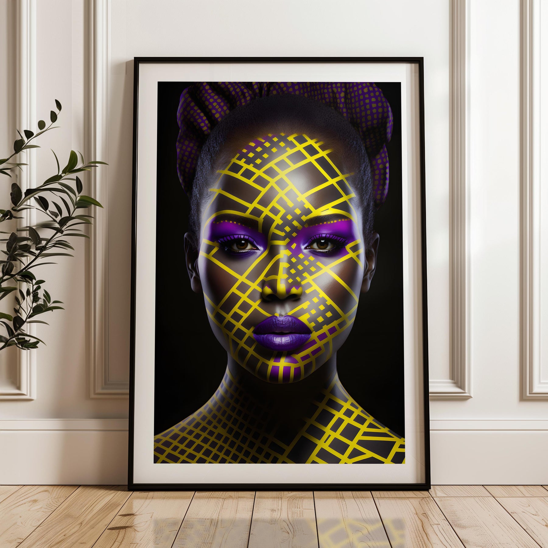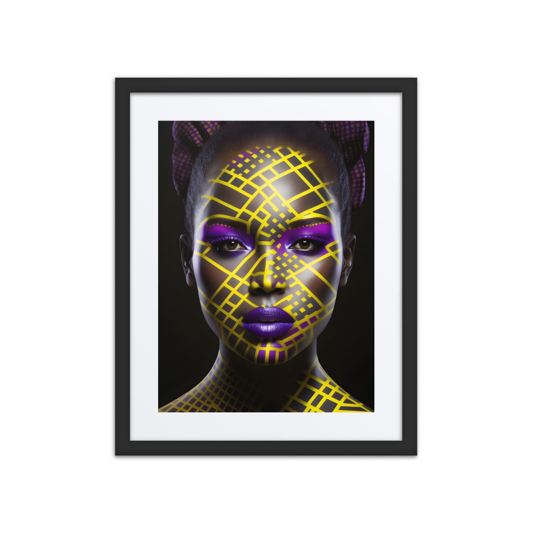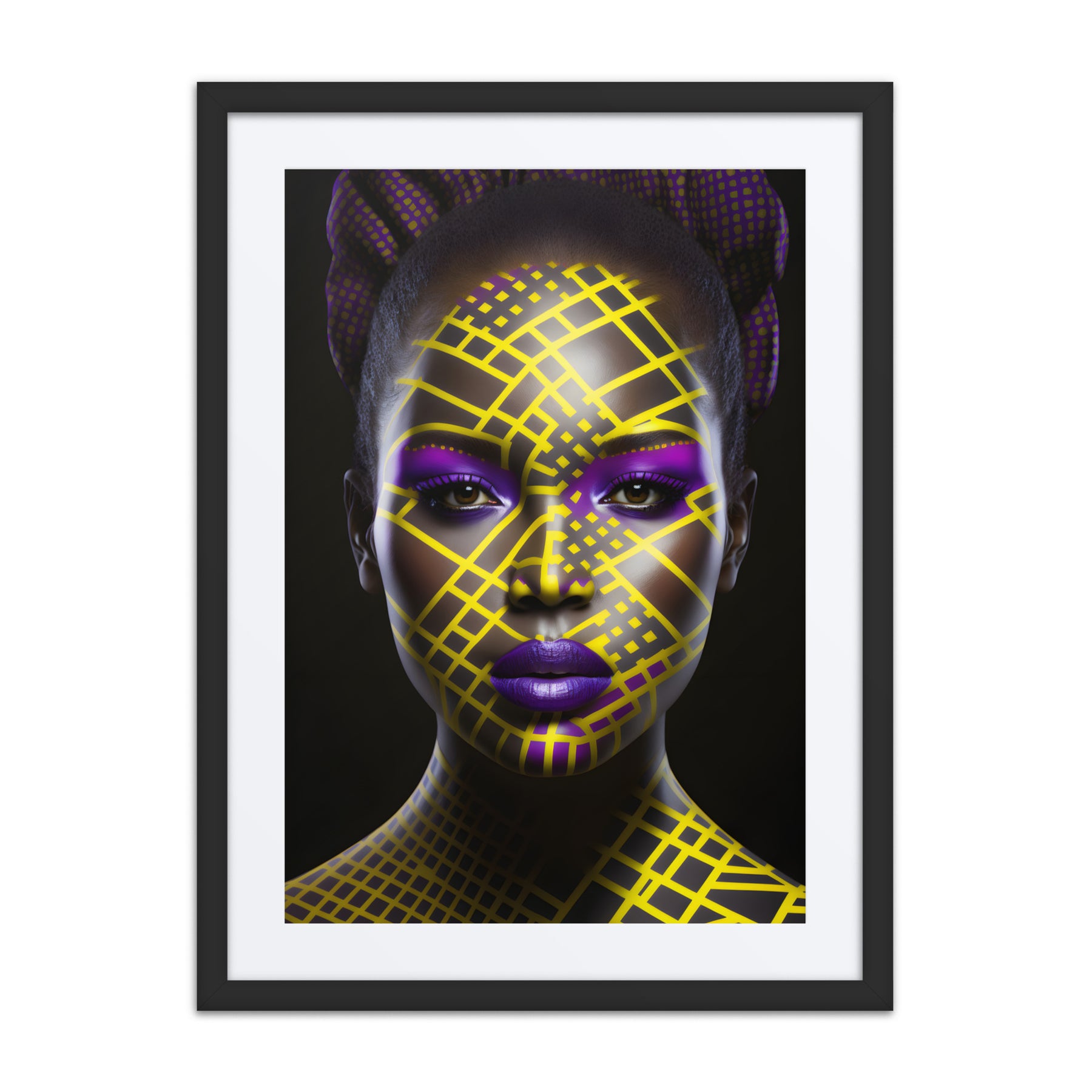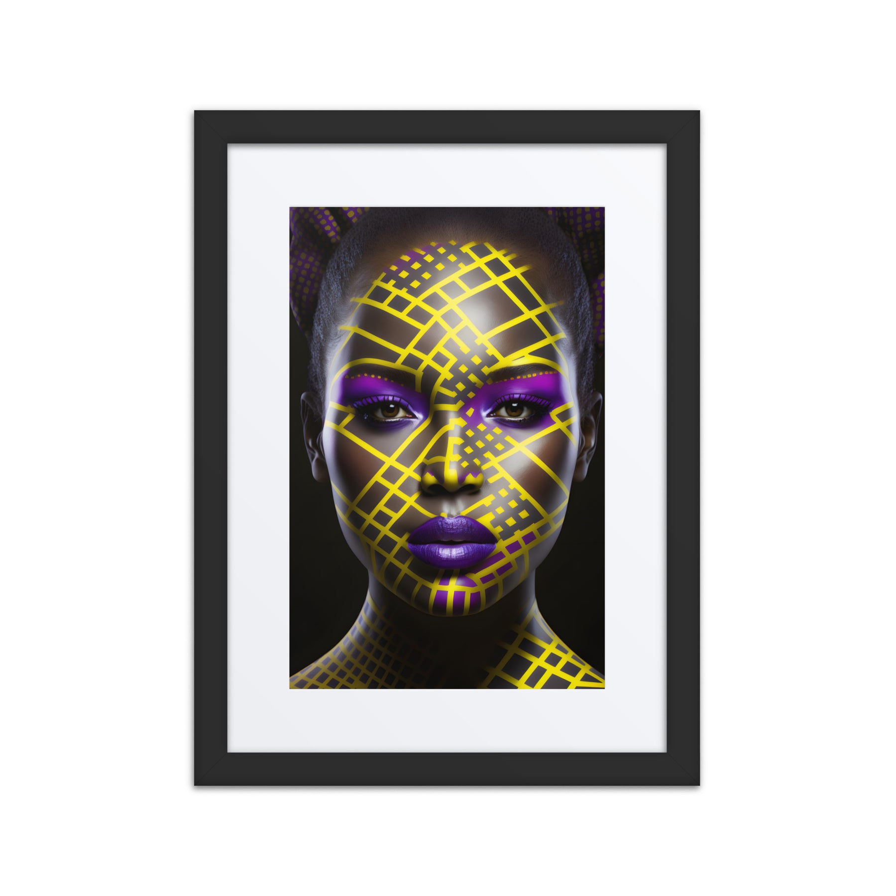 Dazzle in vibrant colors with this dynamic framed poster showcasing a stunning face adorned with bold patterns. This piece is perfect for creative spaces, sparking conversation and inspiration.