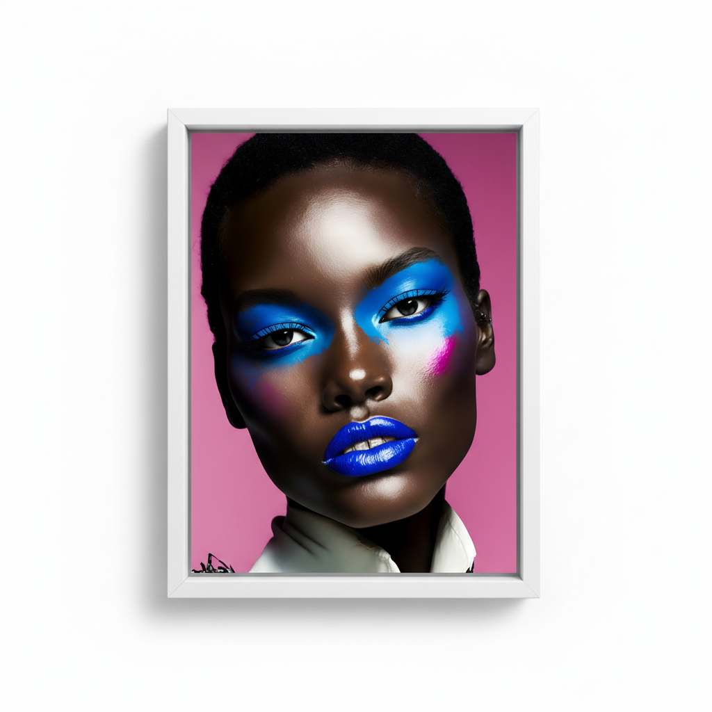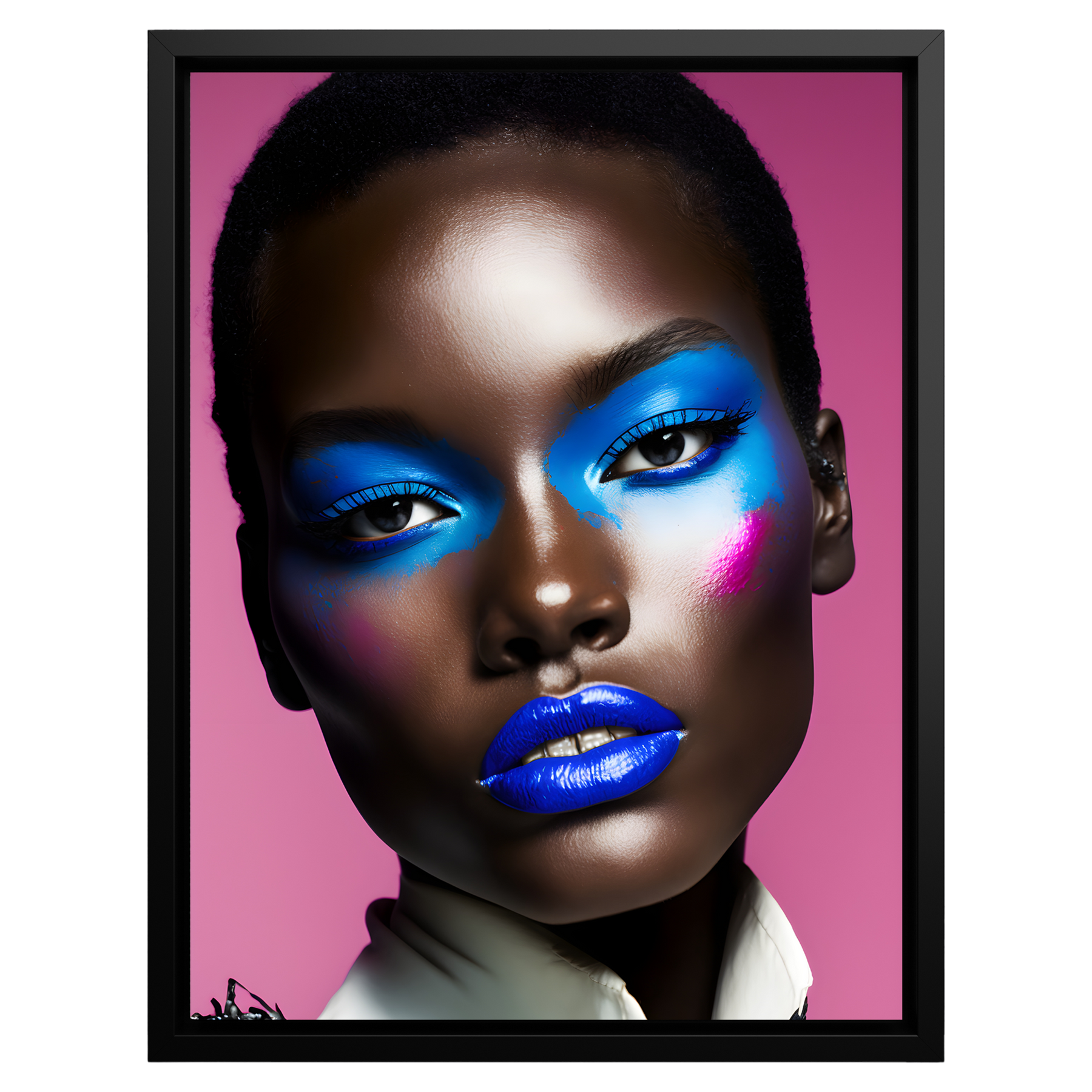 Embrace the glamour of this framed poster that highlights a striking face with eye-catching blue tones and shimmering accents. Ideal for modern decor, it brings a pop of color and sophistication to any room.
