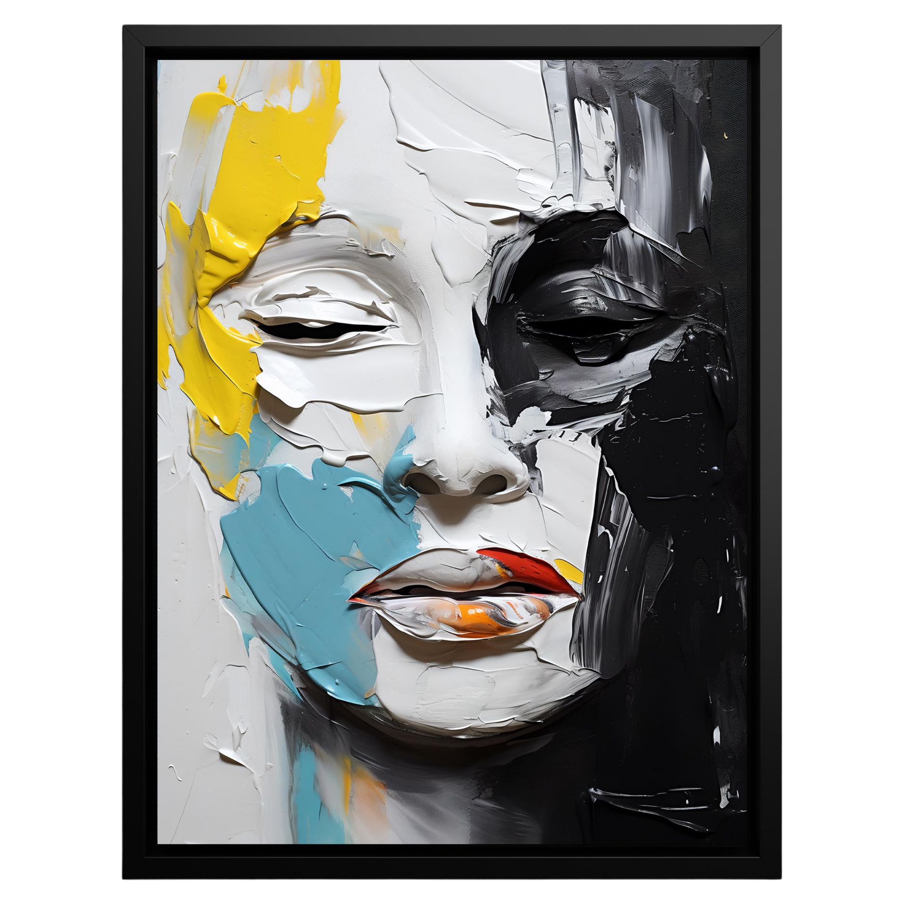 Duality Unveiled captures the intricate dance between light and shadow, peace and passion. Heavy textured strokes in black, white, yellow, teal, and fiery orange collide across a serene, closed-eyed face, symbolizing the endless contrasts that shape human identity. This piece stirs a deep emotional pull, blending strength and vulnerability in one mesmerizing portrait.