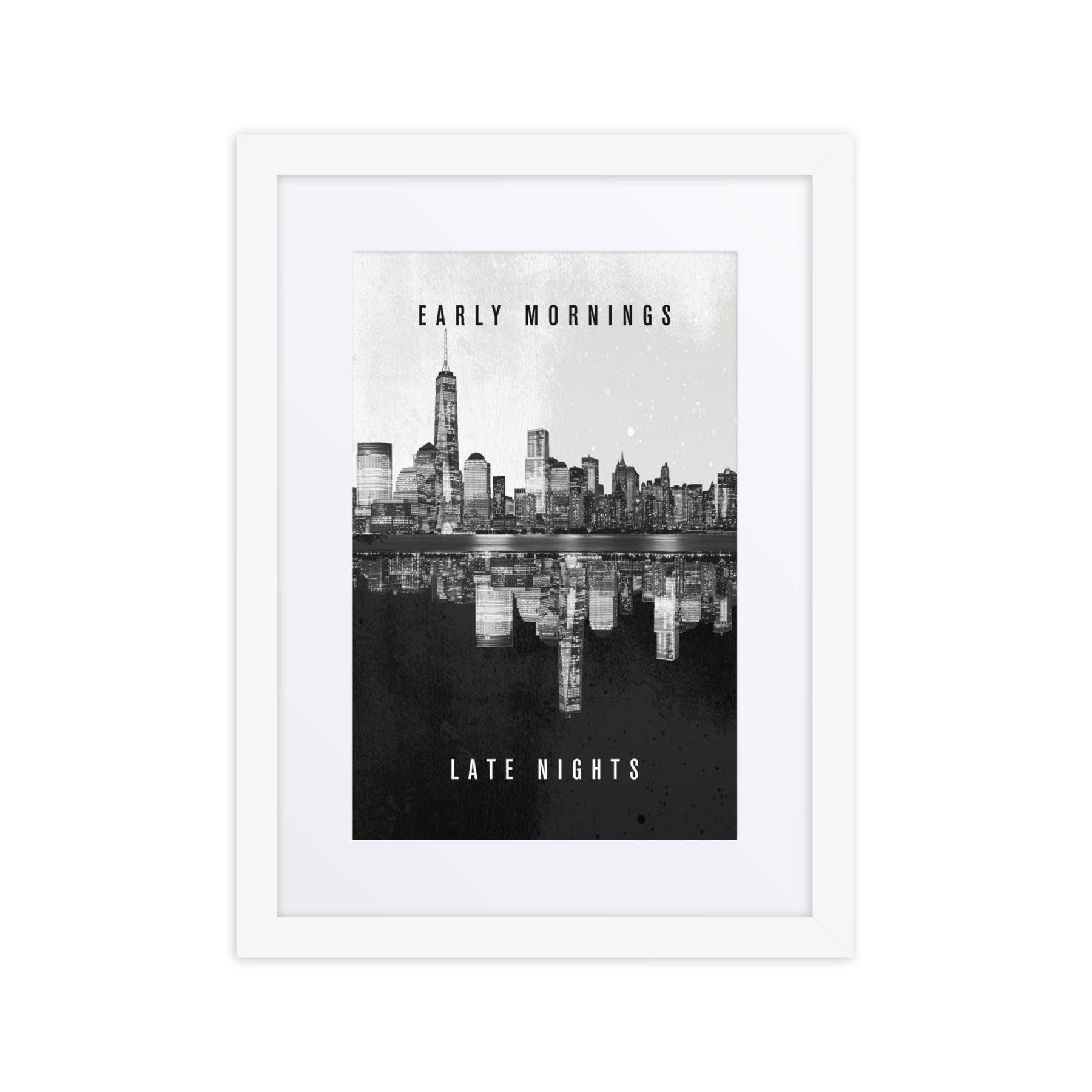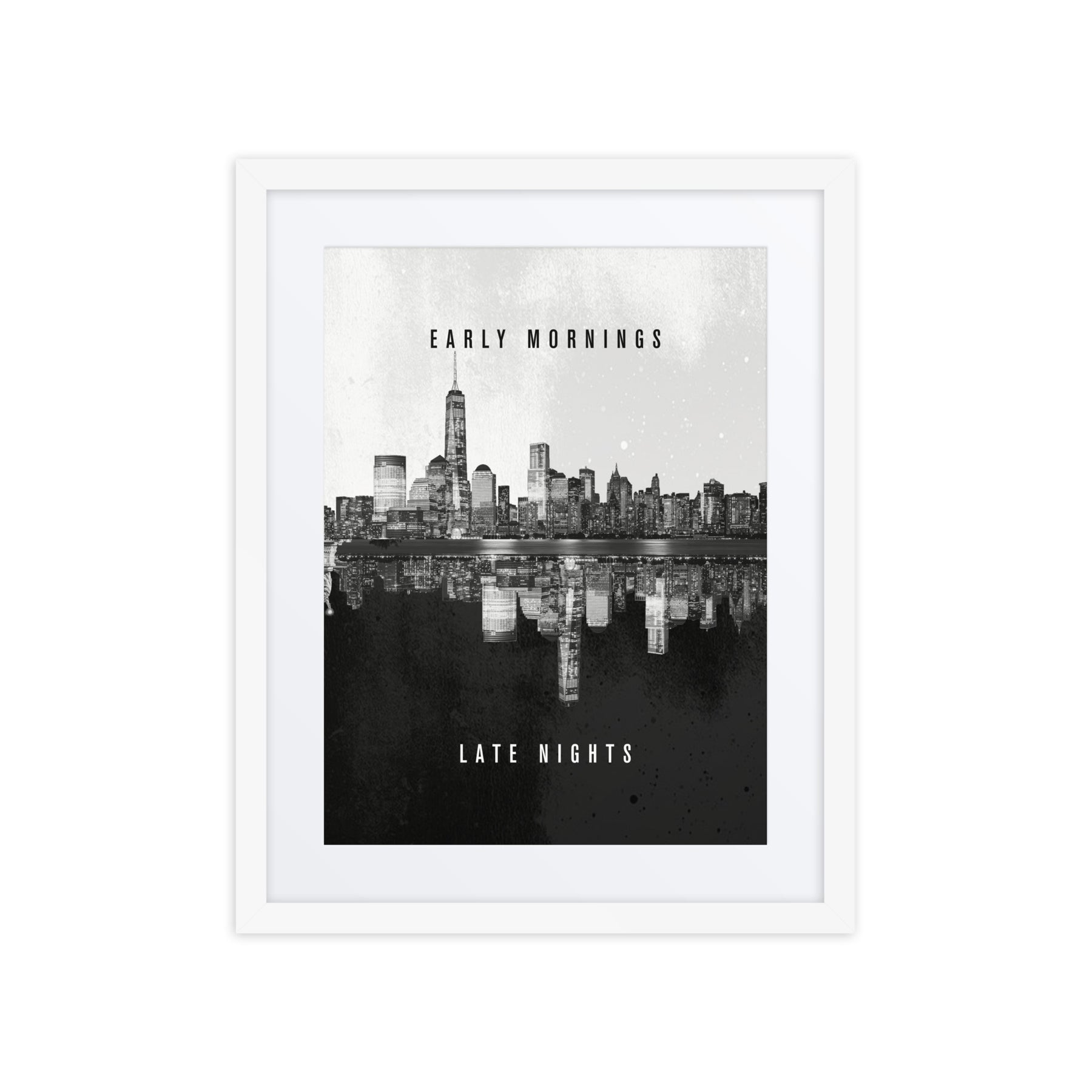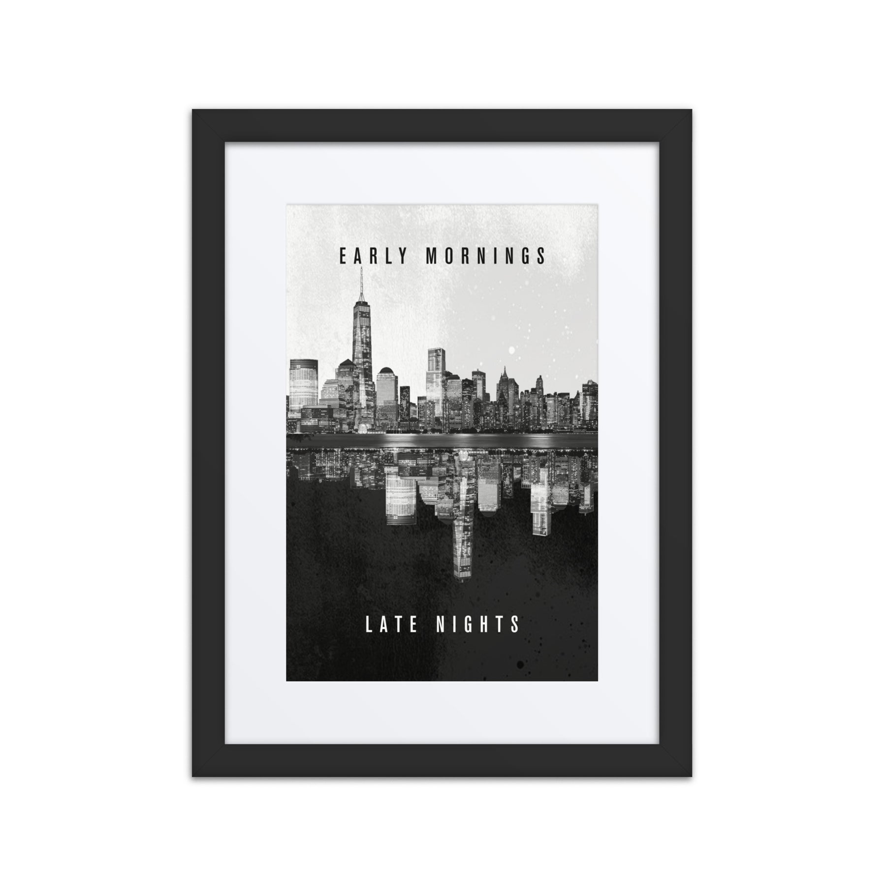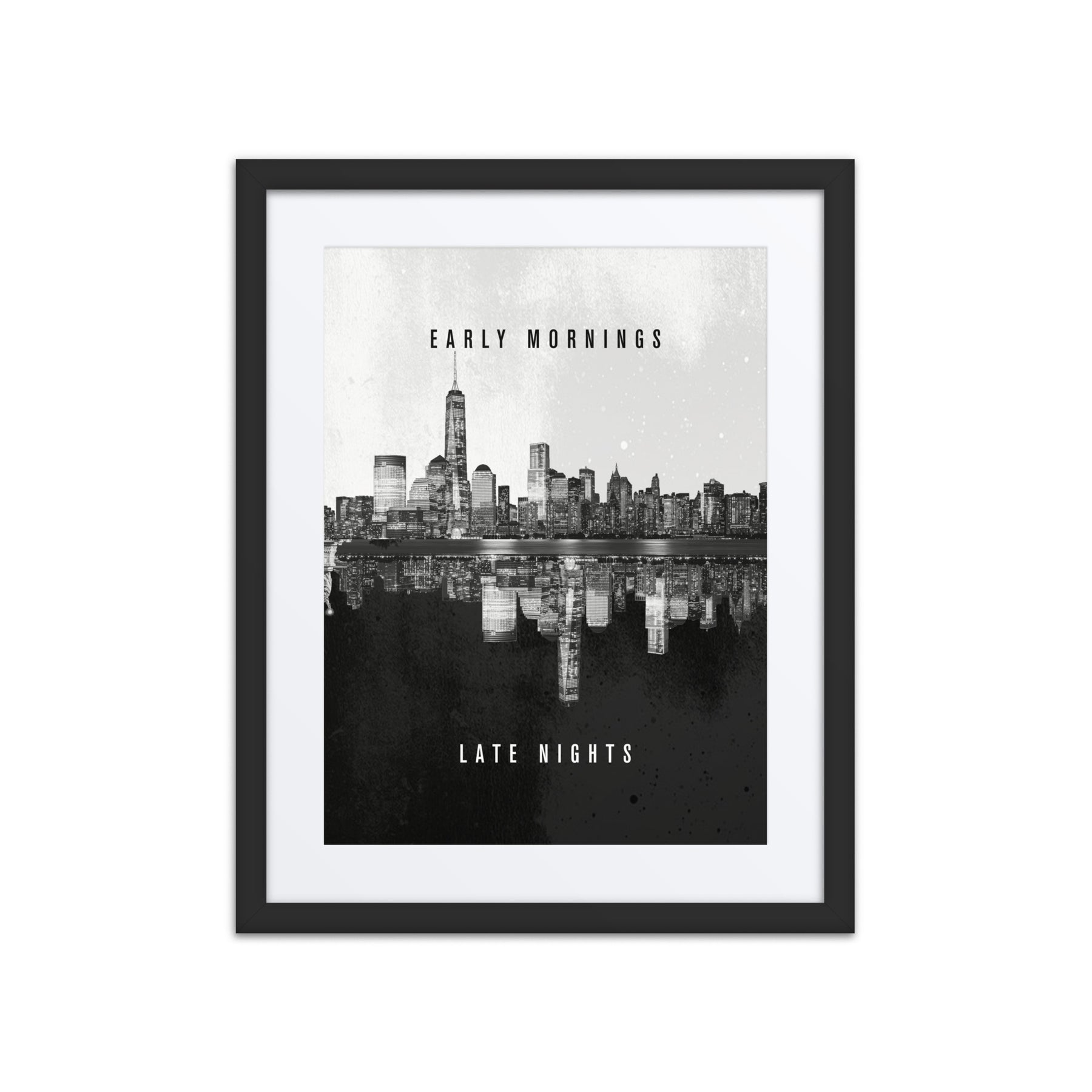 Capture the essence of city life with this stunning black-and-white framed poster art! Featuring the phrase "Early Mornings , Late Nights, " it embodies the hustle and bustle of urban living. Perfect for your living room or office , this piece speaks to dreamers and doers who thrive in the city that never sleeps. Elevate your decor with this captivating glimpse of metropolis magic!