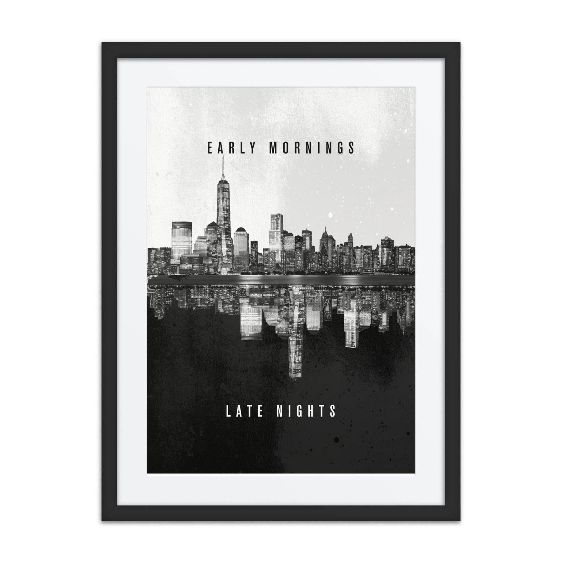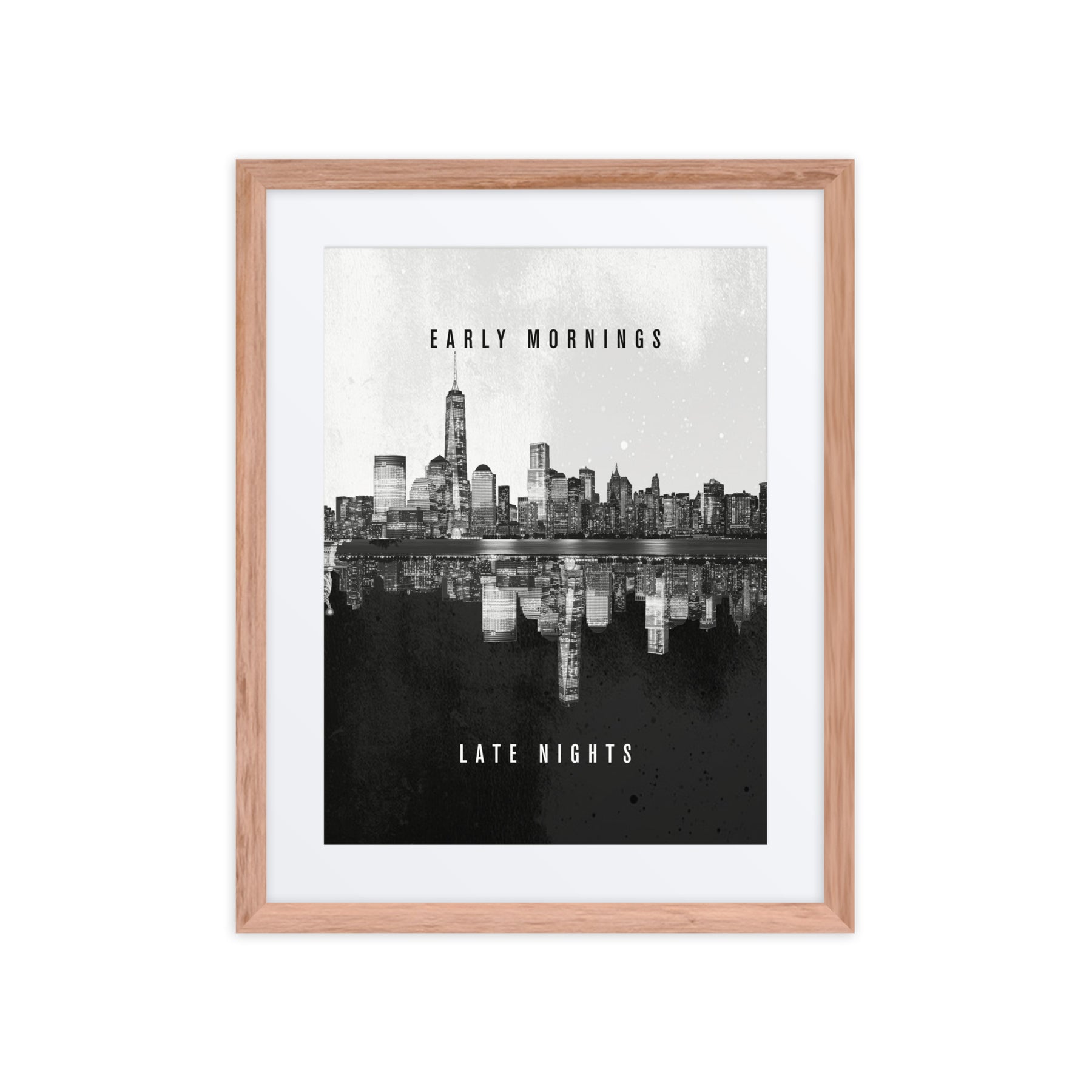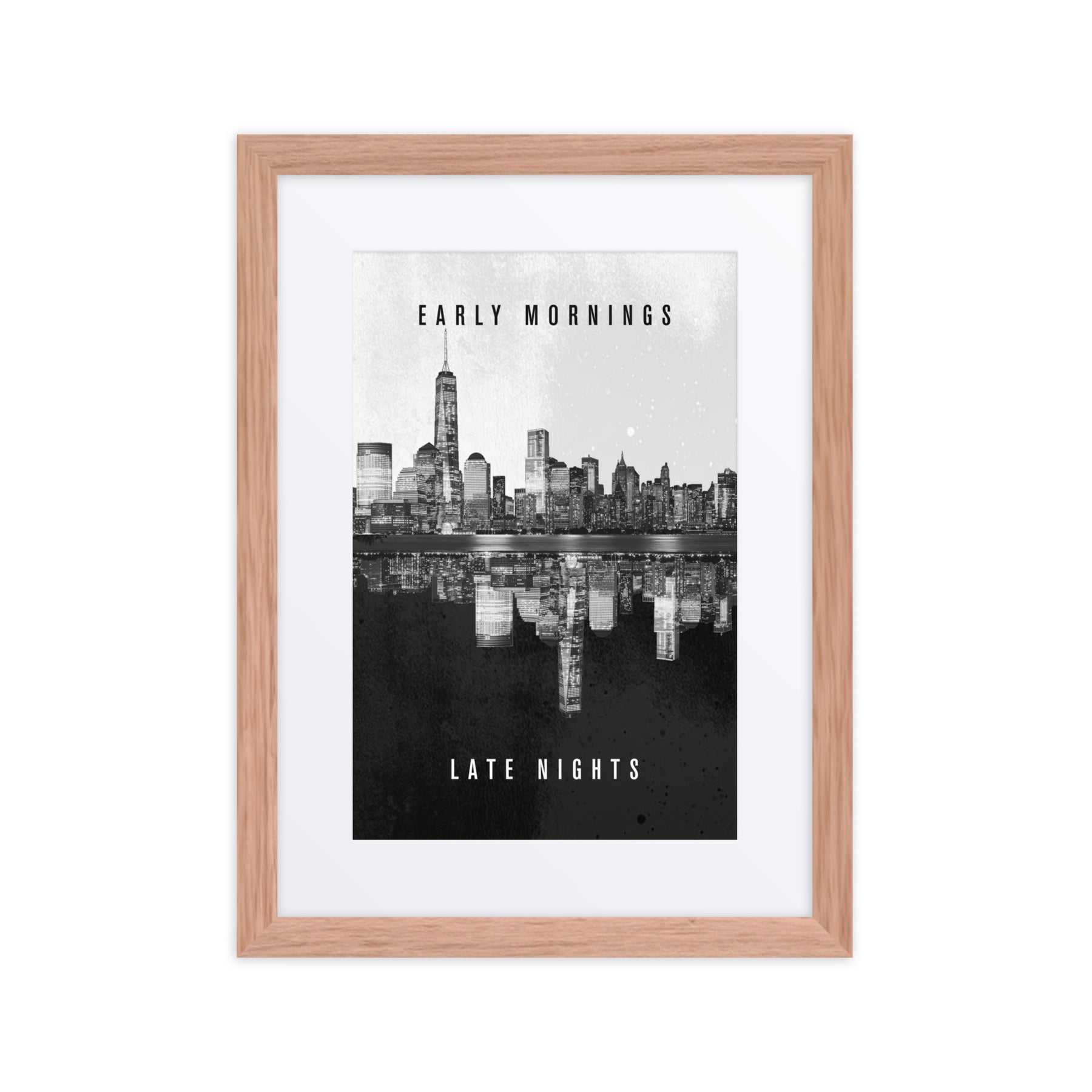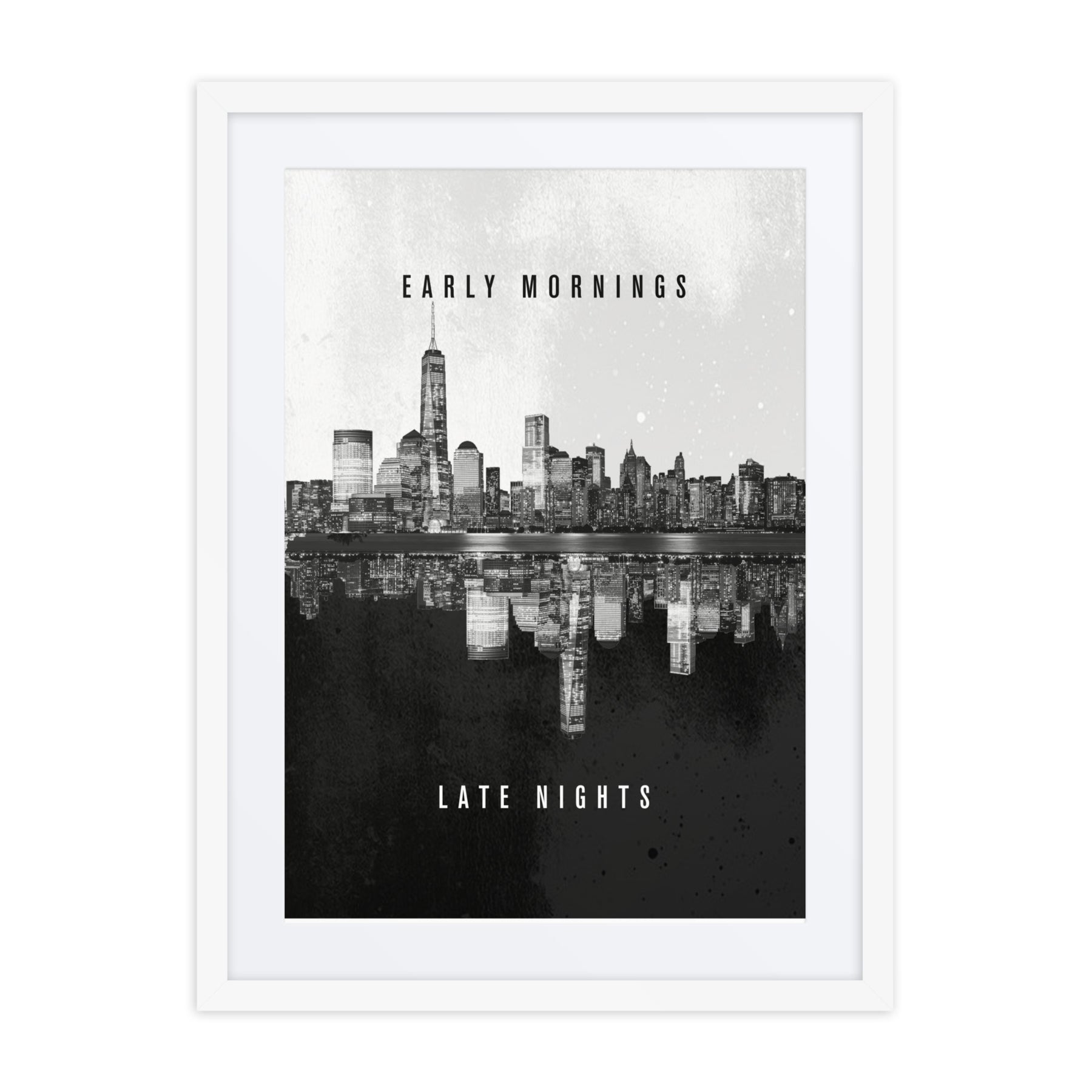 Capture the essence of city life with this stunning black-and-white framed poster art! Featuring the phrase "Early Mornings , Late Nights, " it embodies the hustle and bustle of urban living. Perfect for your living room or office , this piece speaks to dreamers and doers who thrive in the city that never sleeps. Elevate your decor with this captivating glimpse of metropolis magic!