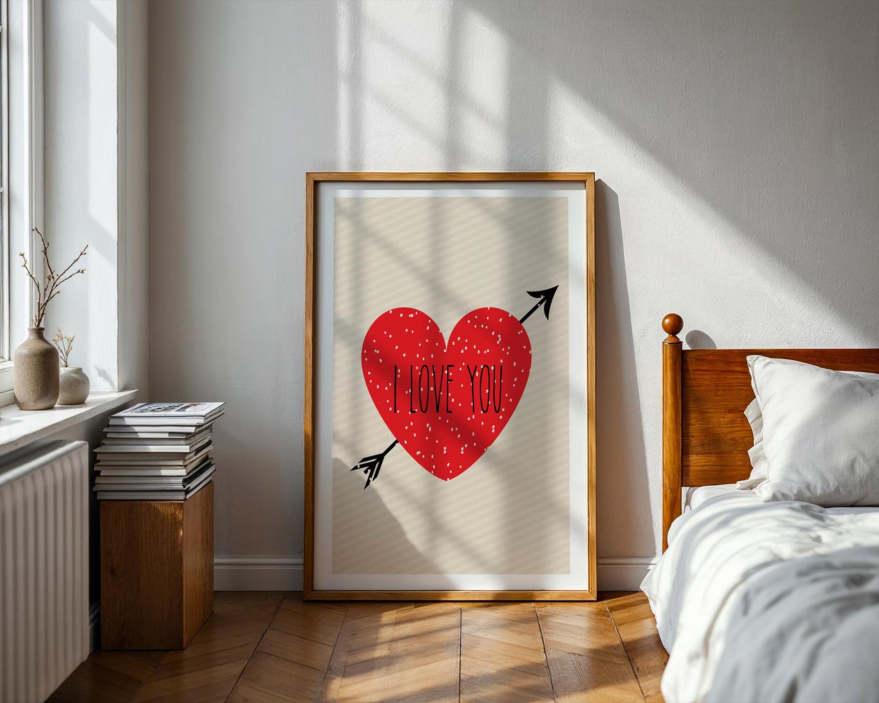 Capture the essence of love with "Cupid’s Echo: 'I Love You' Heart." This enchanting framed poster elegantly displays a beautifully rendered heart, embellished with whimsical motifs that evoke feelings of affection. The playful typography cradles the timeless phrase "I Love You," making it a heartfelt declaration perfect for any romantic space.