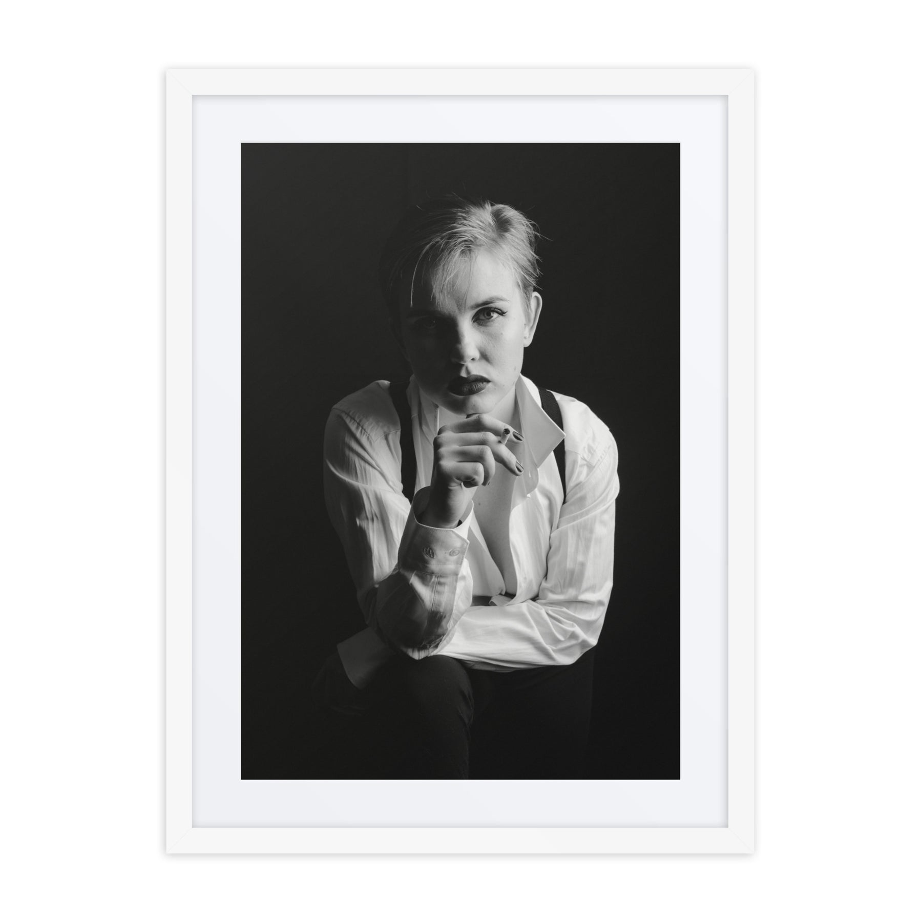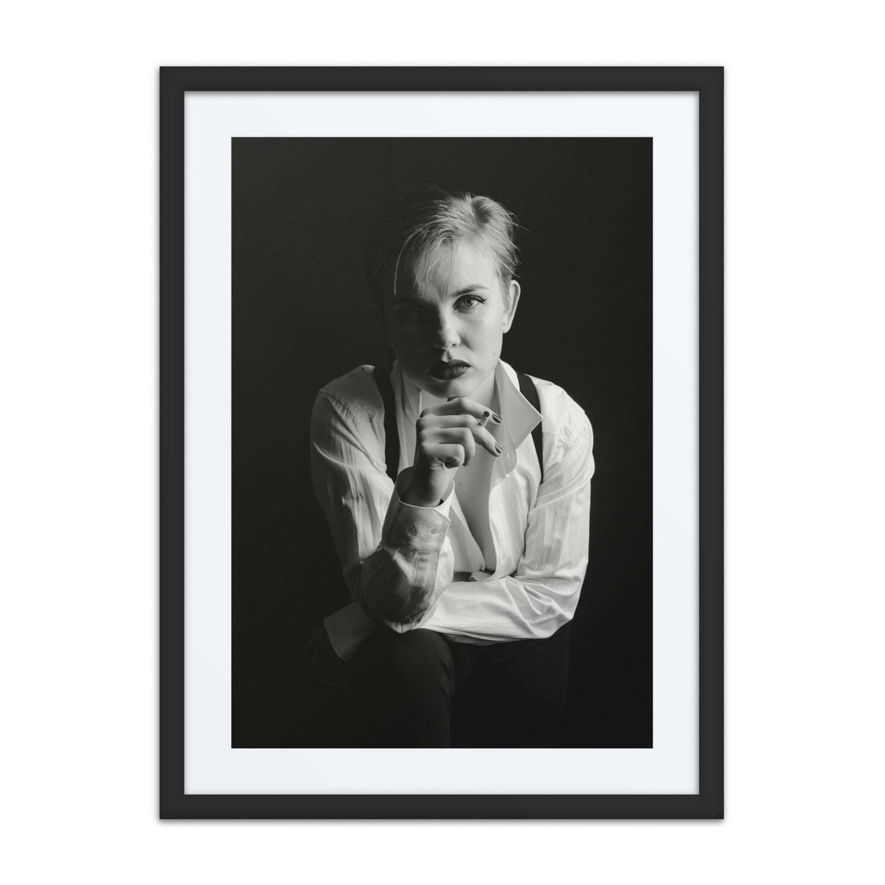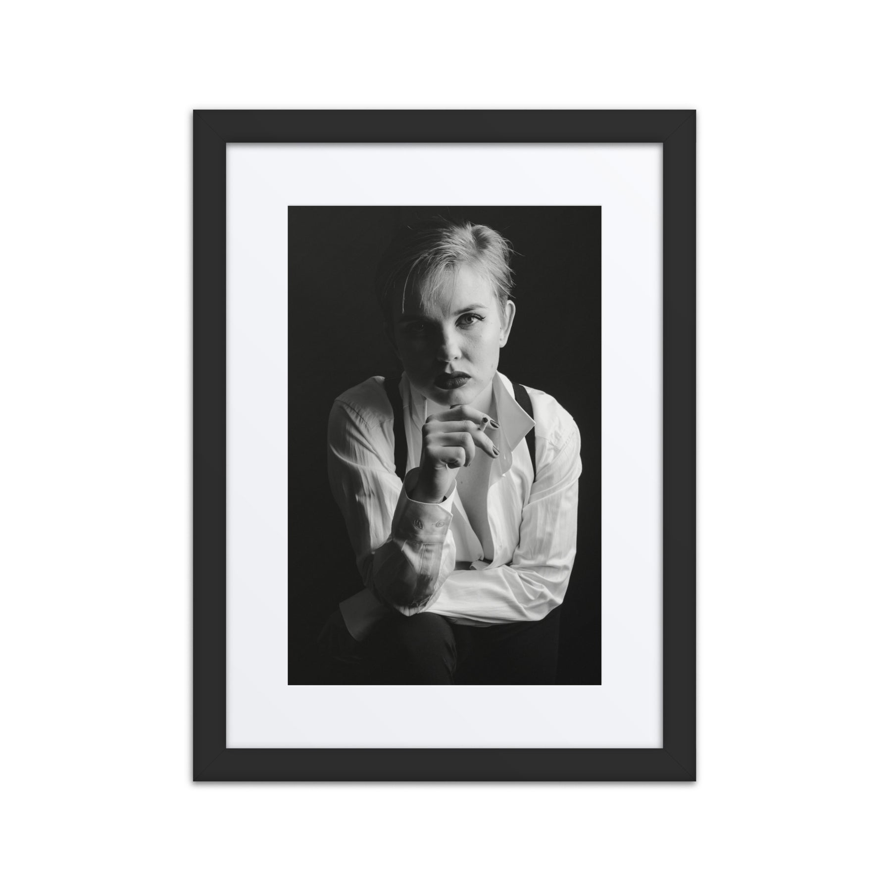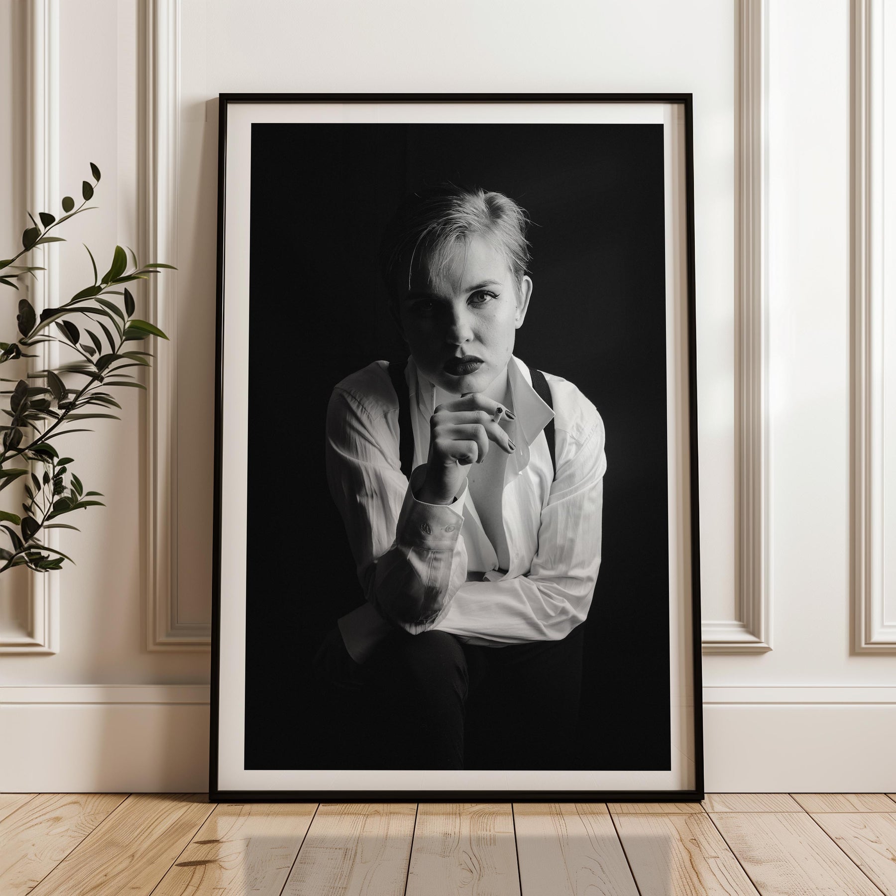 Invite timeless introspection with "Classic Contemplation." This sophisticated black and white framed poster offers a glimpse into thoughtful elegance, perfect for living rooms or creative spaces. A captivating digital art print for interior aficionados and anyone seeking art that speaks beyond the surface.