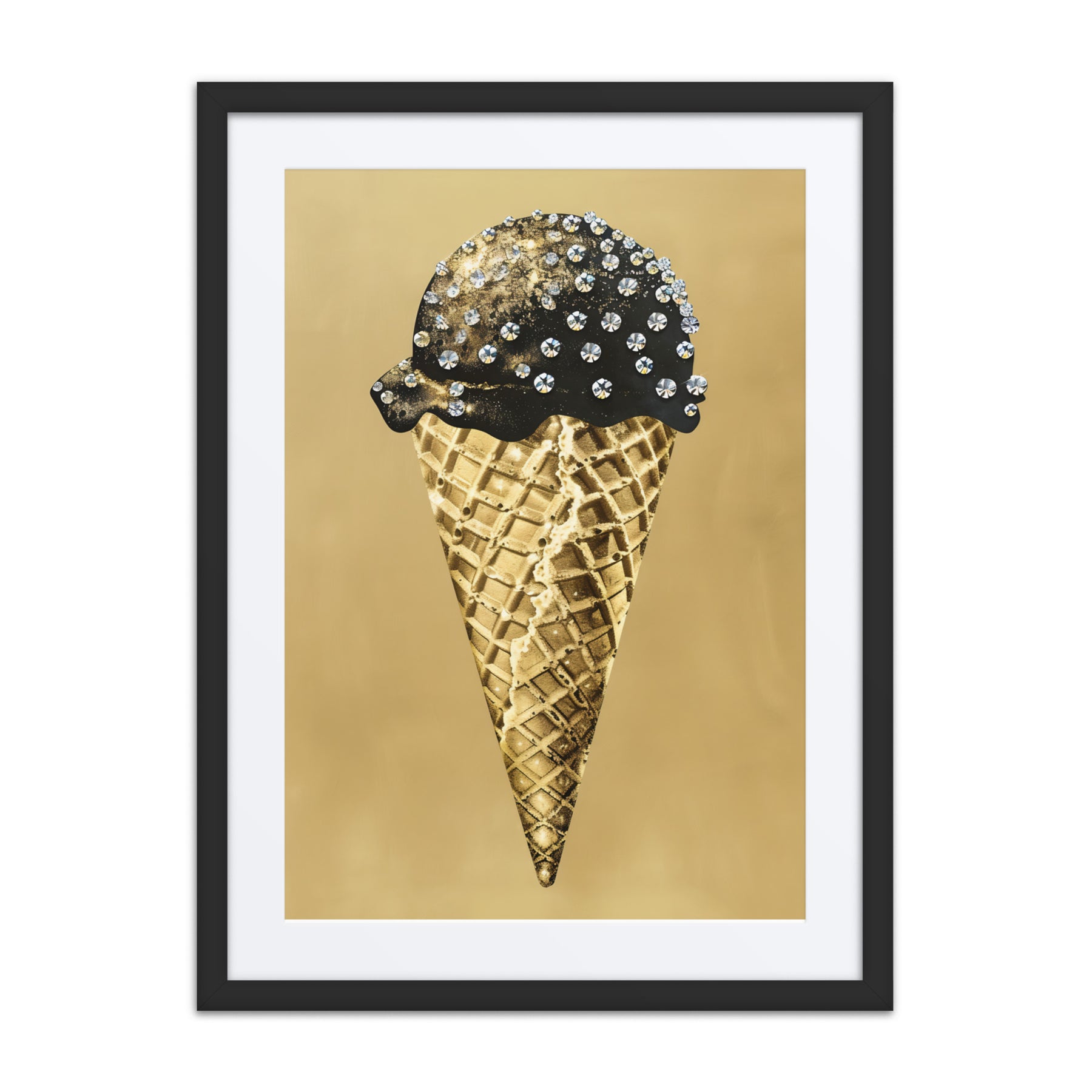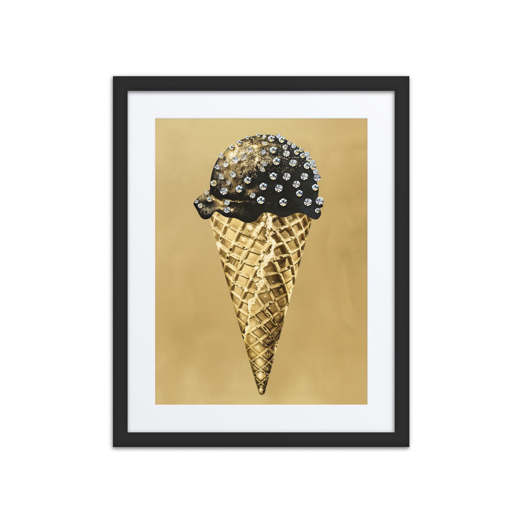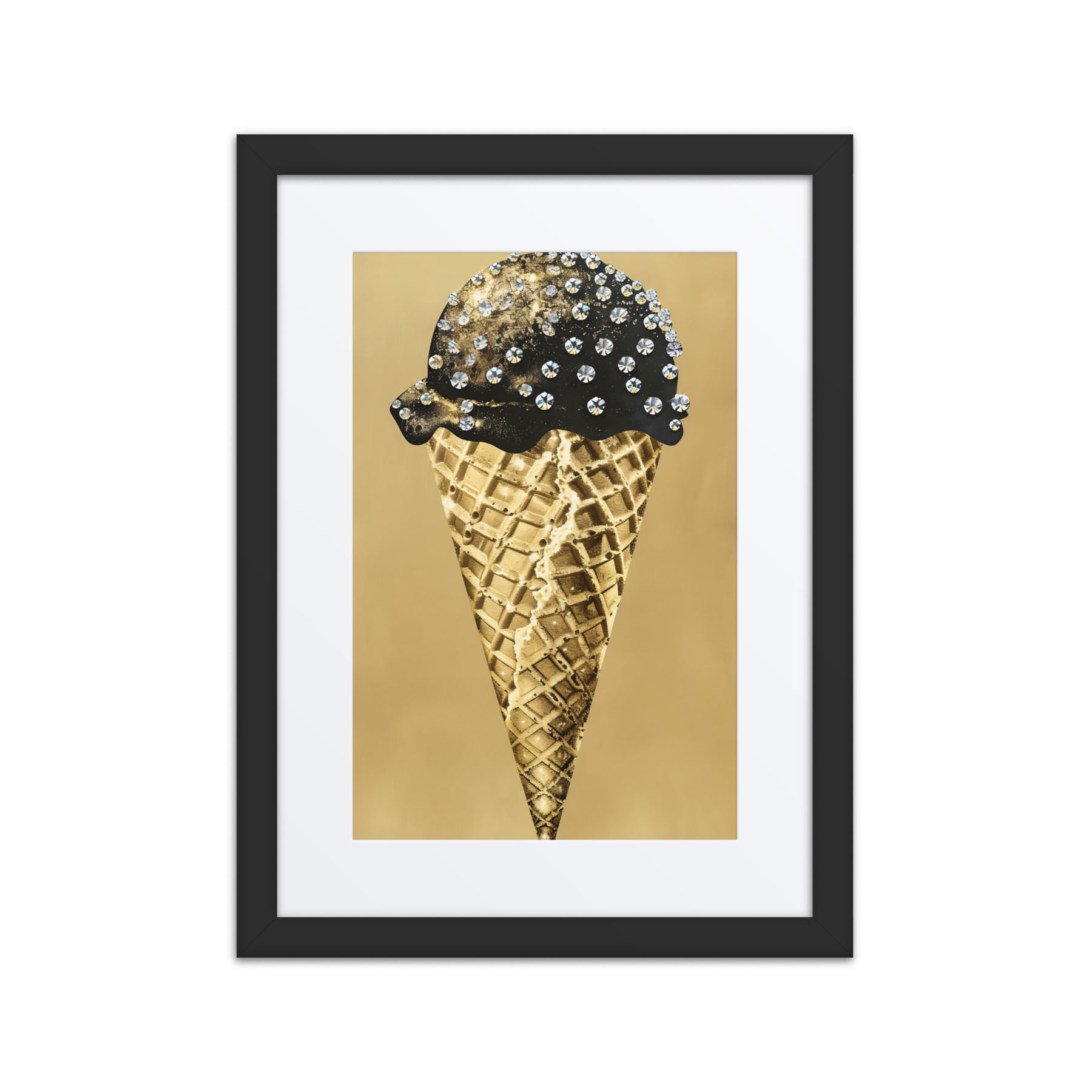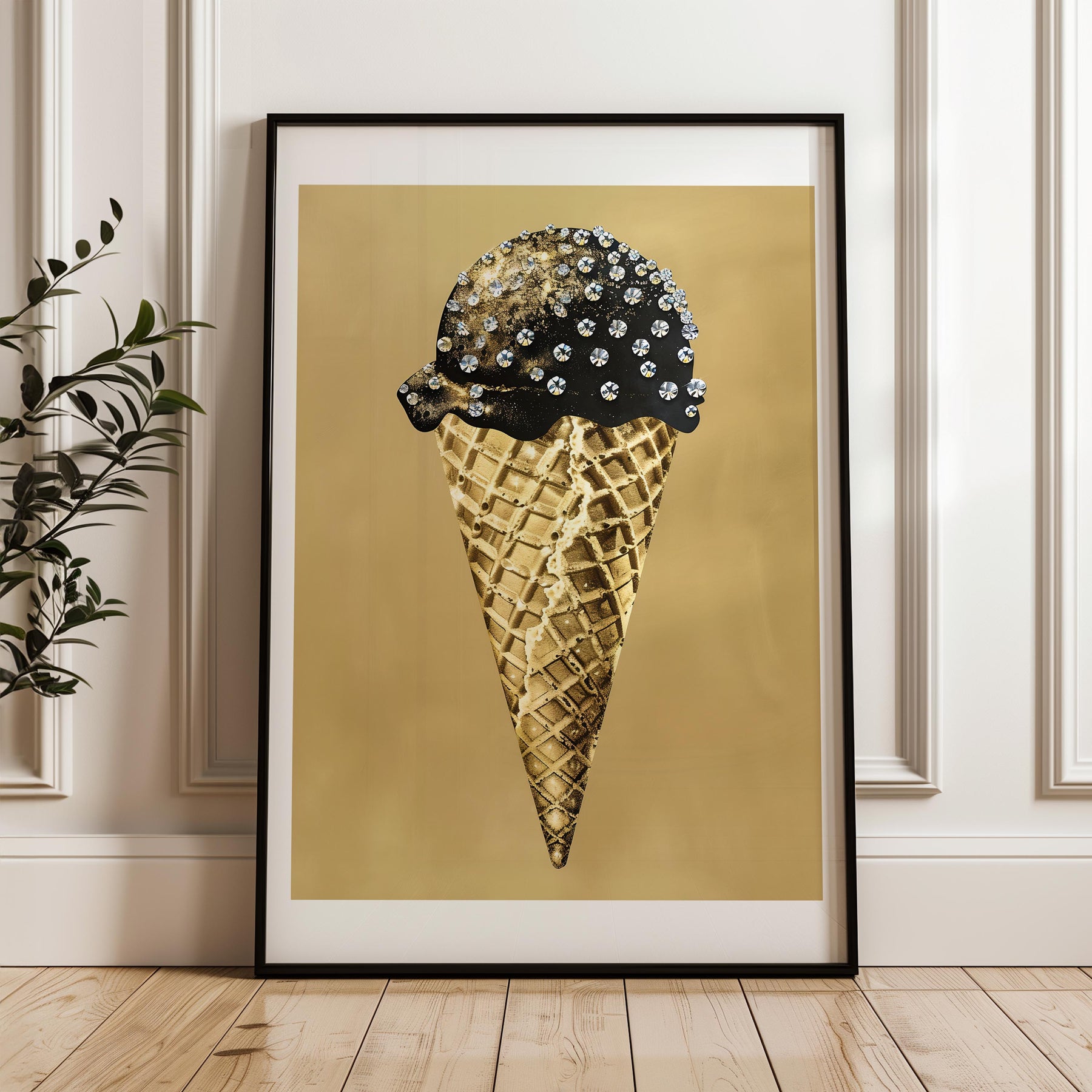 Indulge your senses with "Glamour Cone." This dazzling framed poster features a sparkling, jewel-encrusted ice cream cone, adding a touch of whimsy and luxury to any room. Perfect for Gen Z renters and digital art lovers, it’s a playful masterpiece from our digital art gallery online that sweetens your home decor with style.