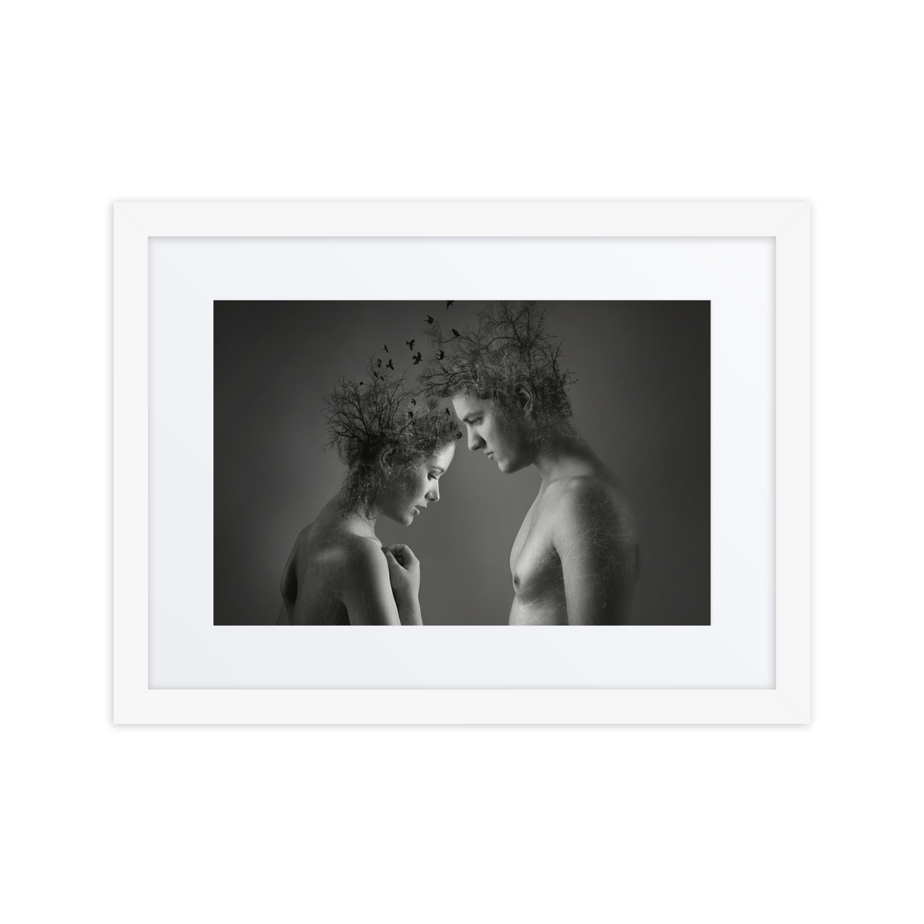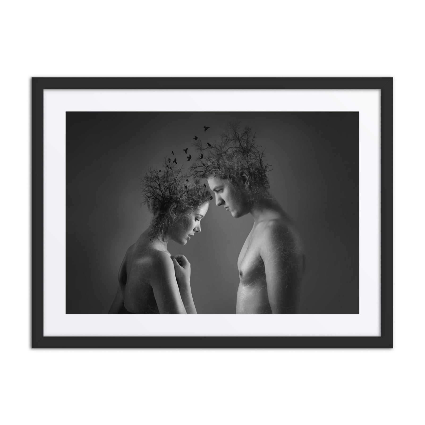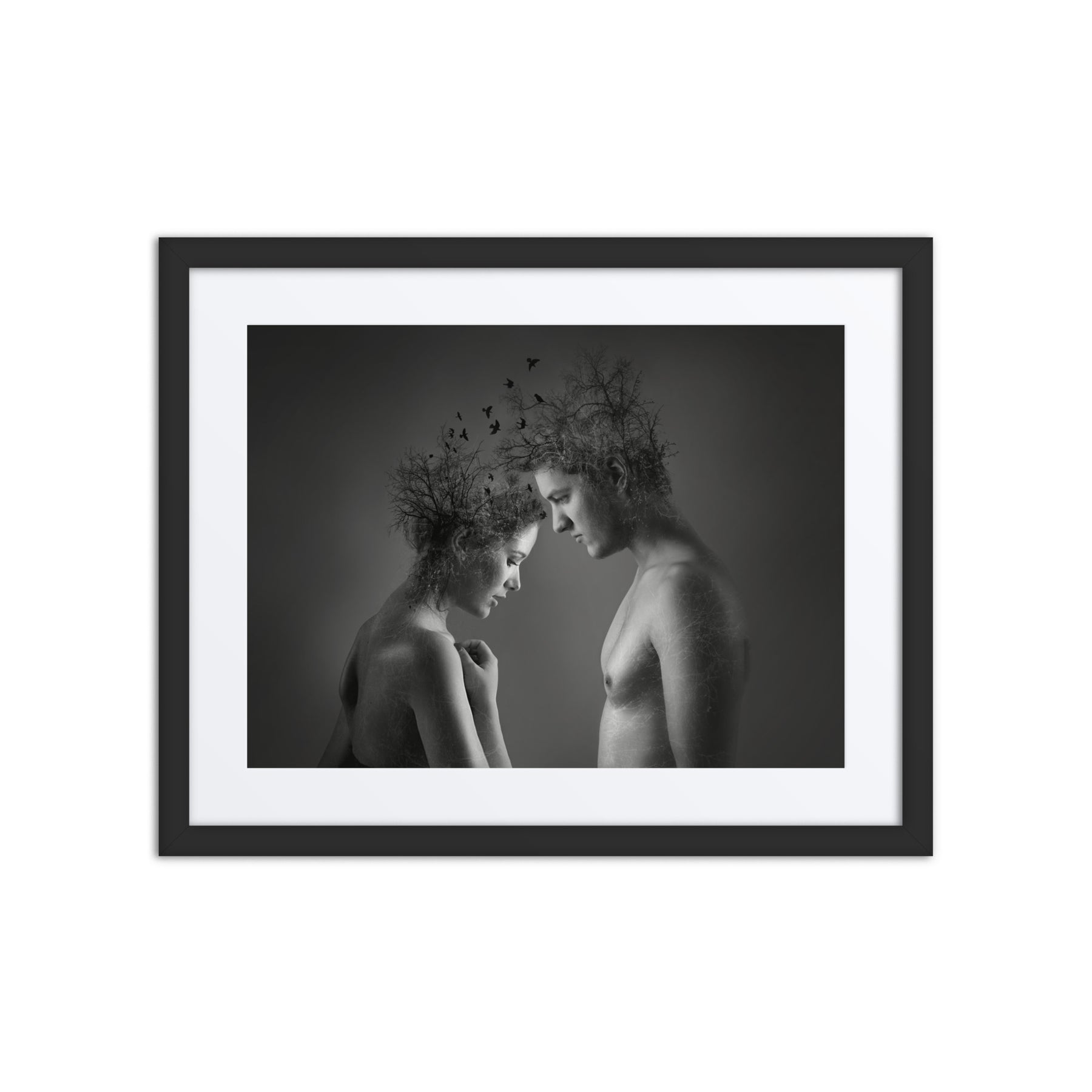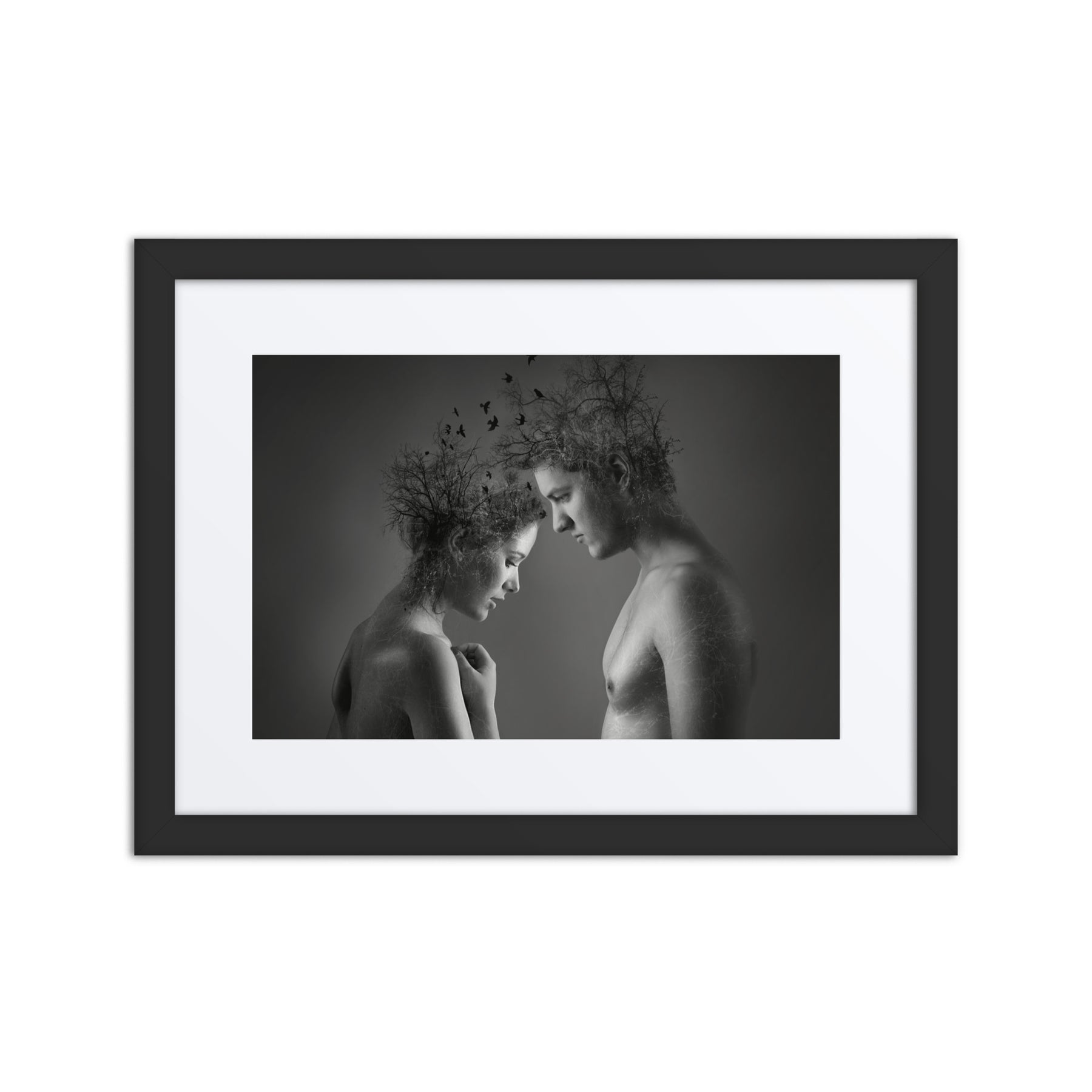 Explore the beauty of connection with "Nature's Embrace." This captivating black and white framed poster highlights the unity of nature and humanity, adding depth and emotion to any decor. A stunning choice for interior design aficionados seeking thought-provoking digital art prints for home enhancement.