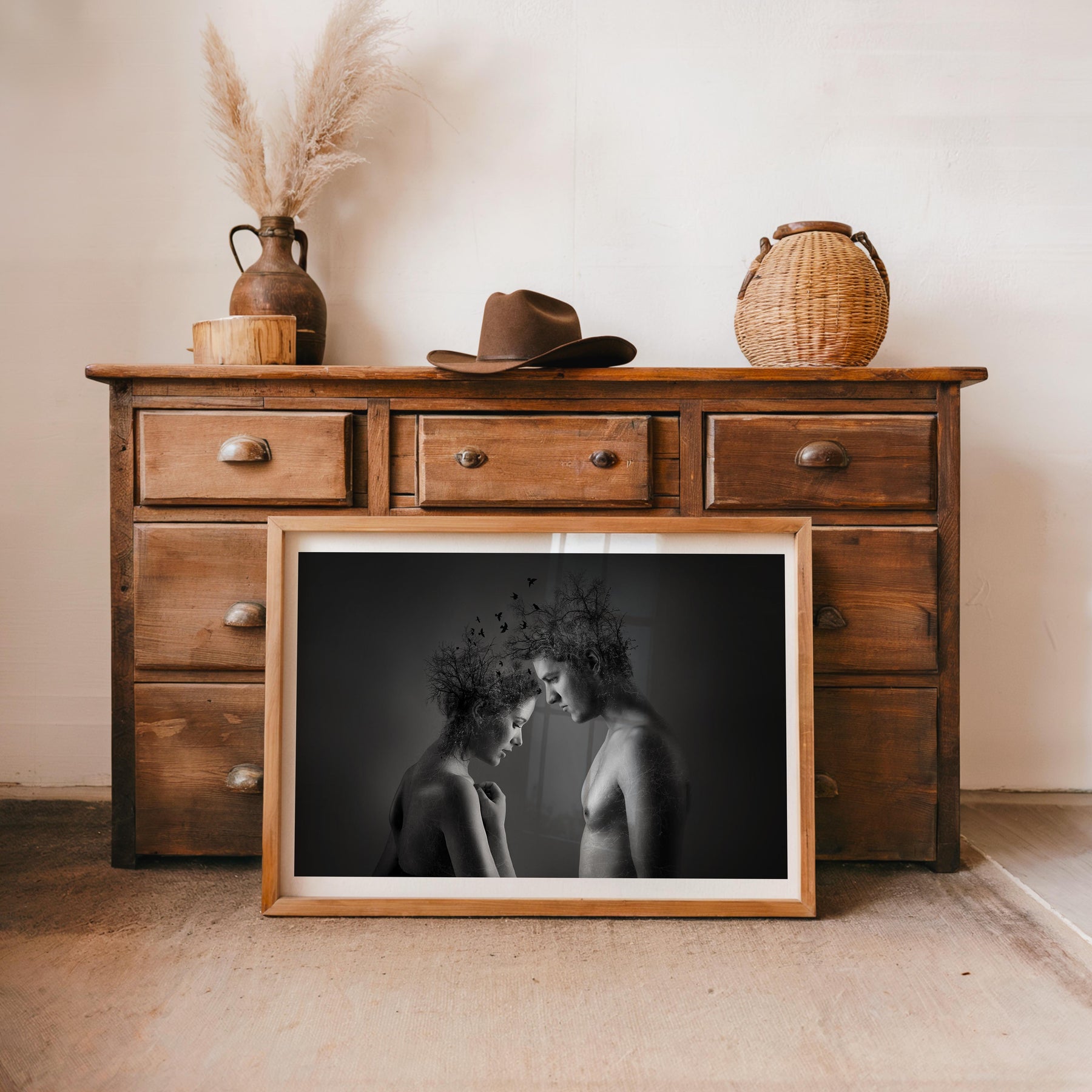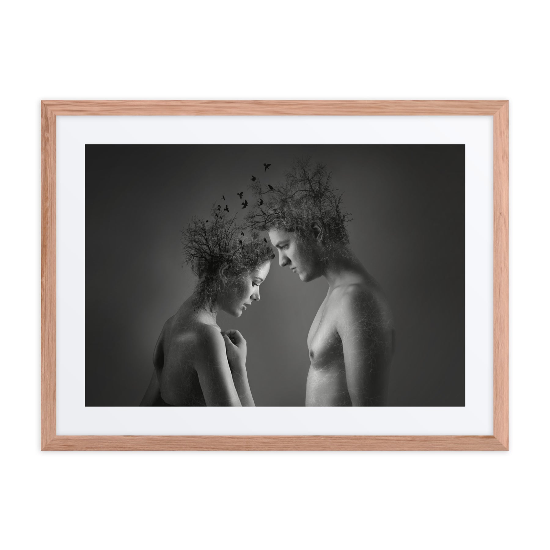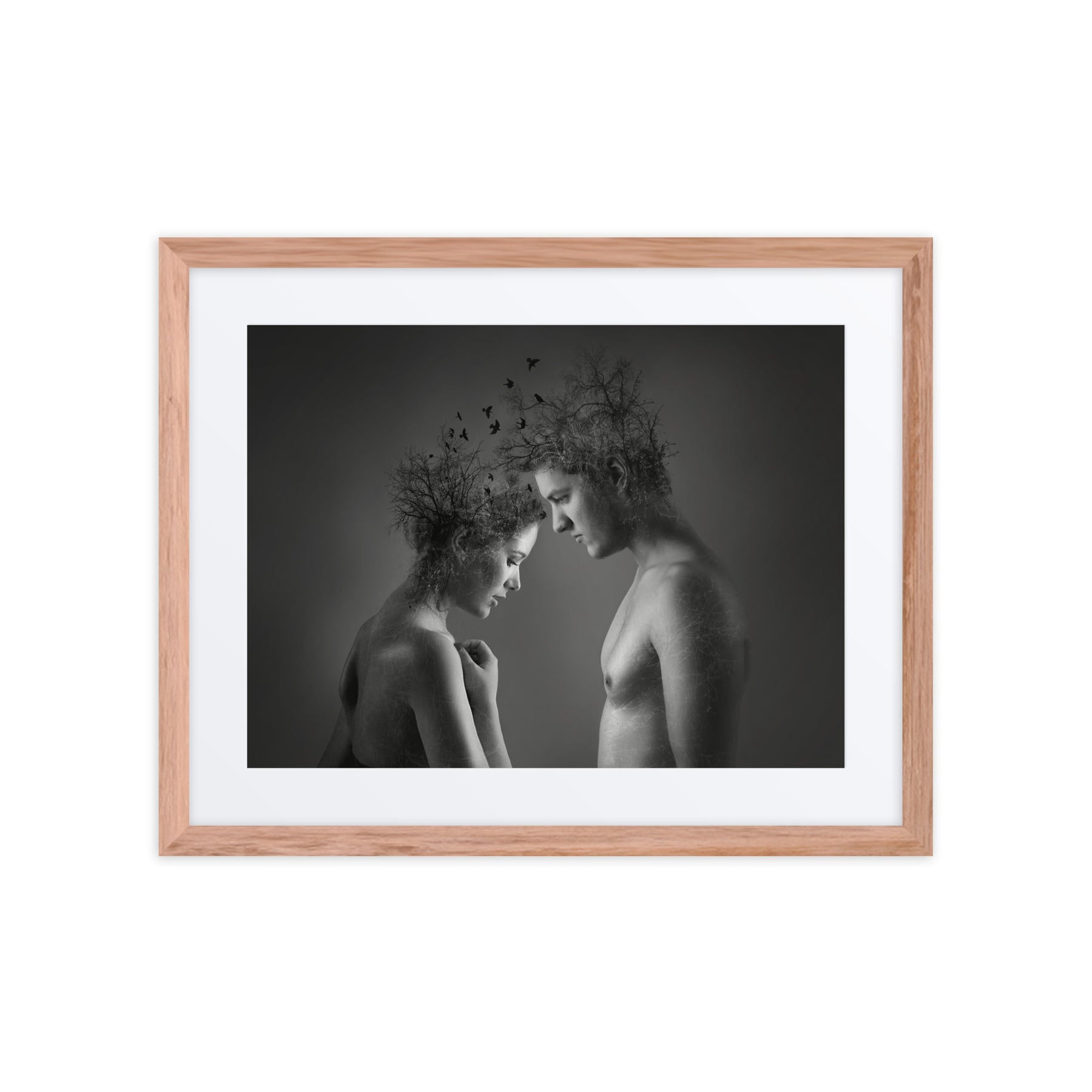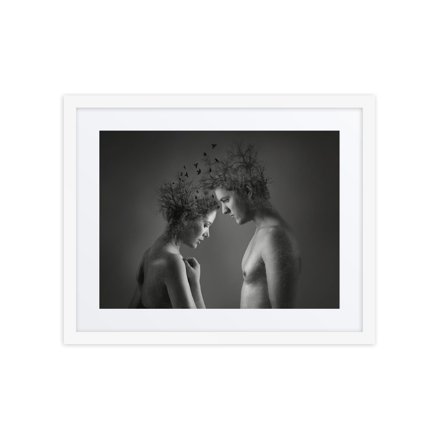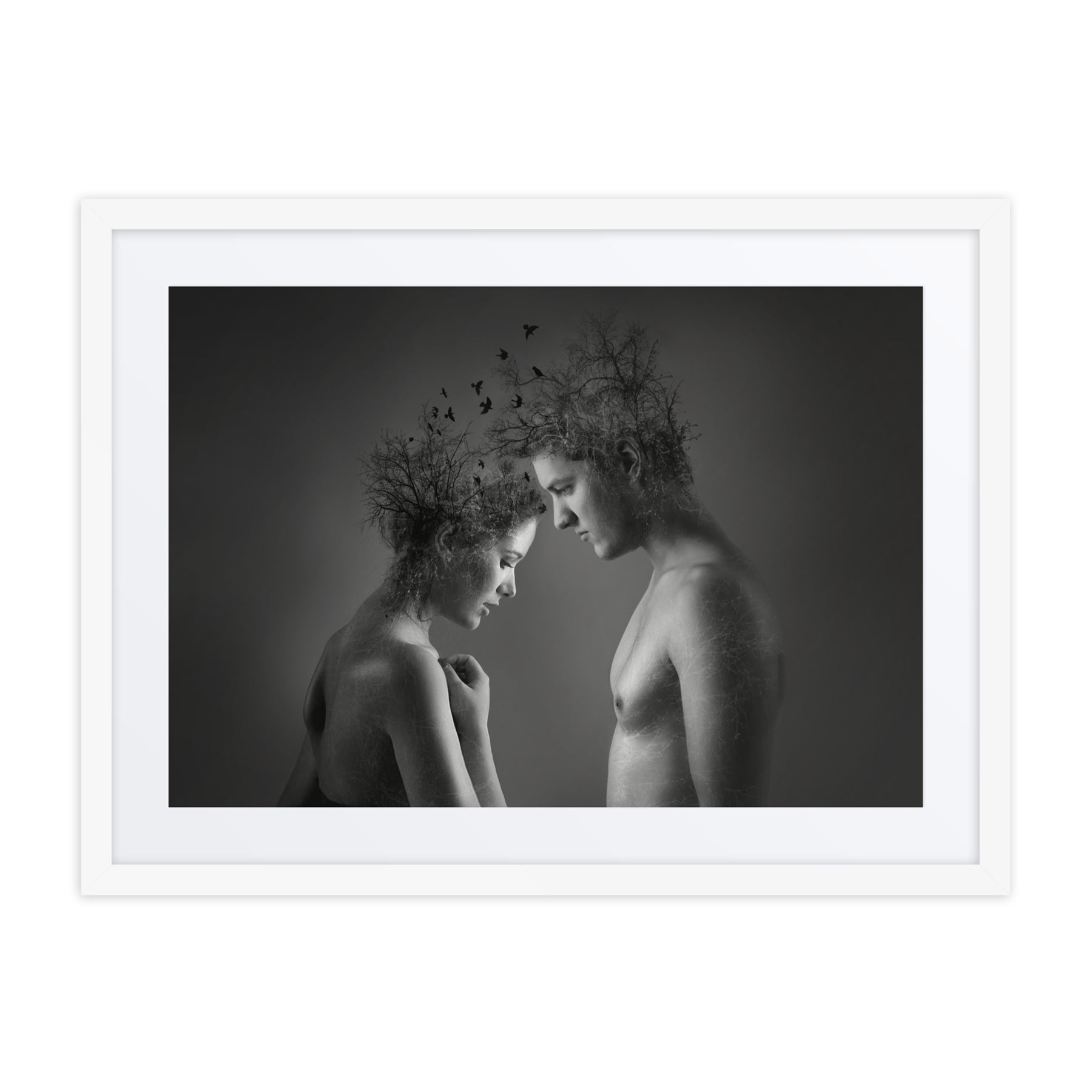 Explore the beauty of connection with "Nature's Embrace." This captivating black and white framed poster highlights the unity of nature and humanity, adding depth and emotion to any decor. A stunning choice for interior design aficionados seeking thought-provoking digital art prints for home enhancement.