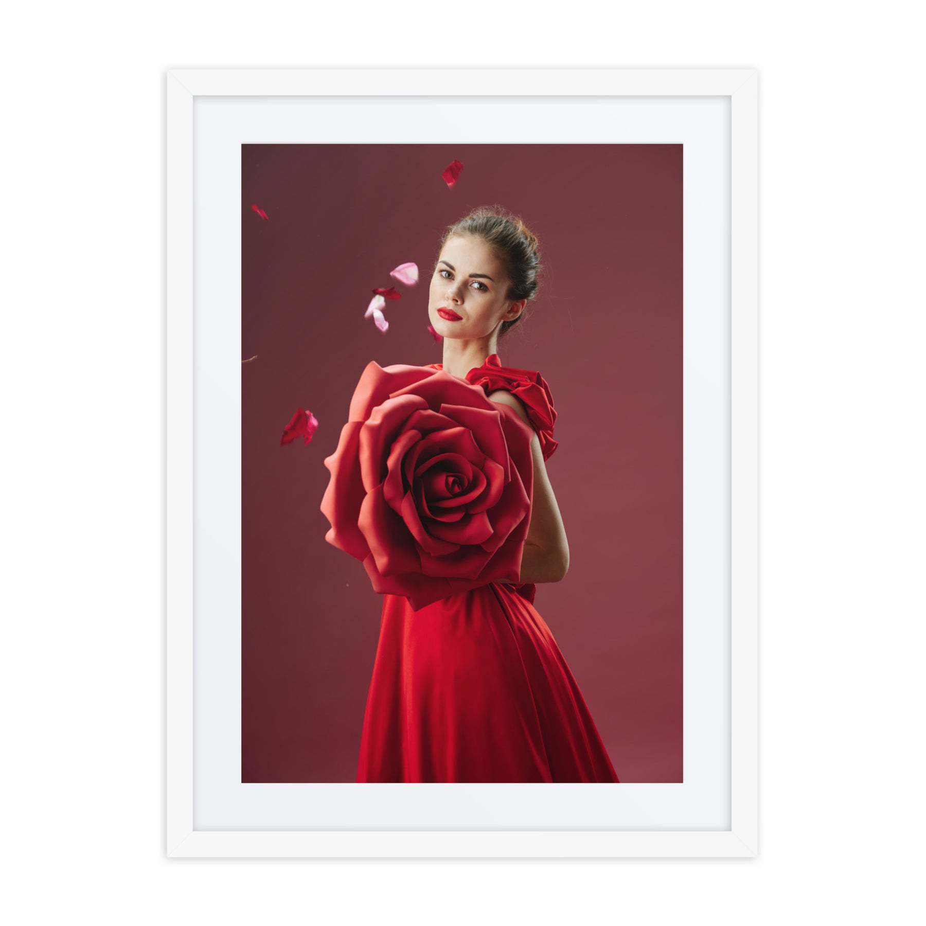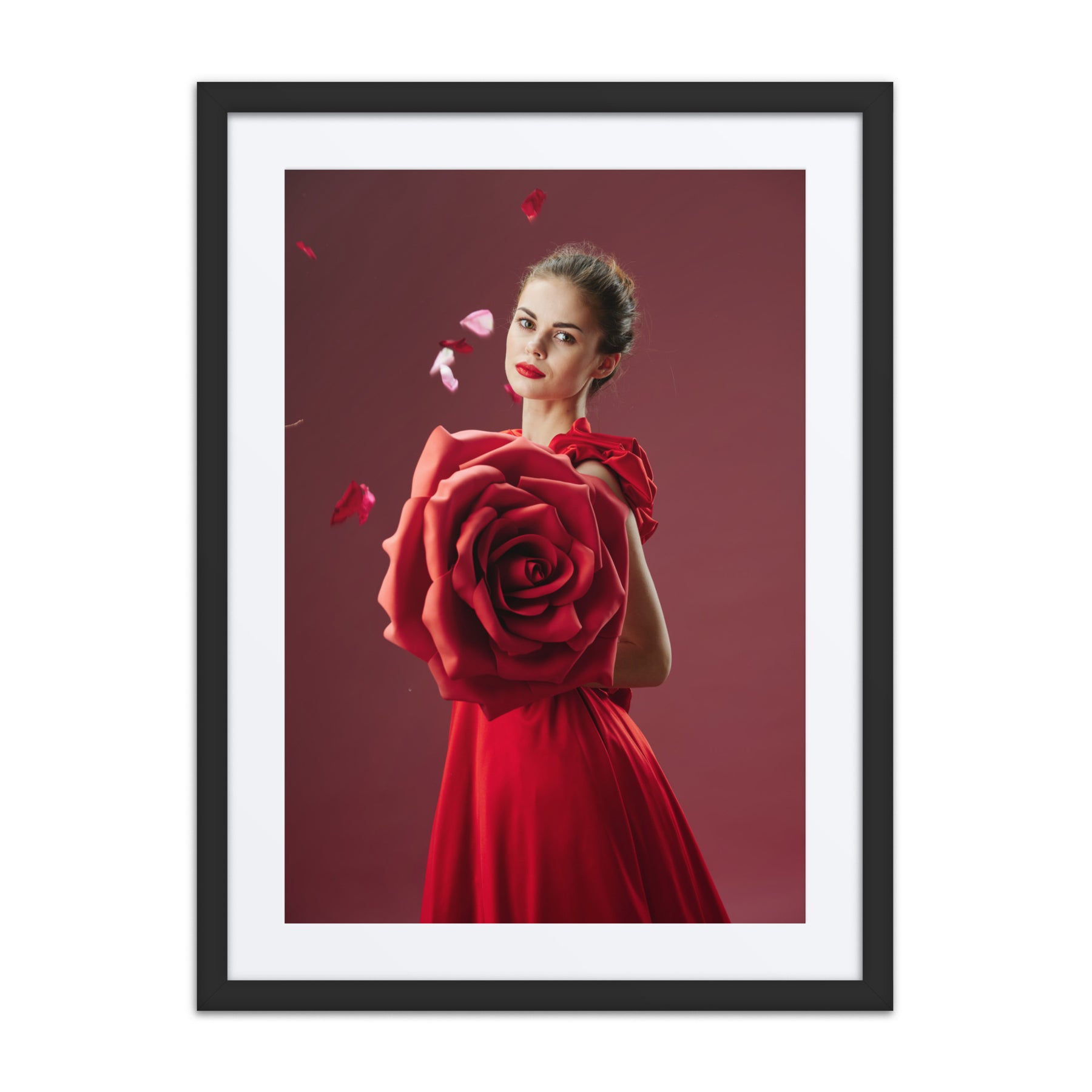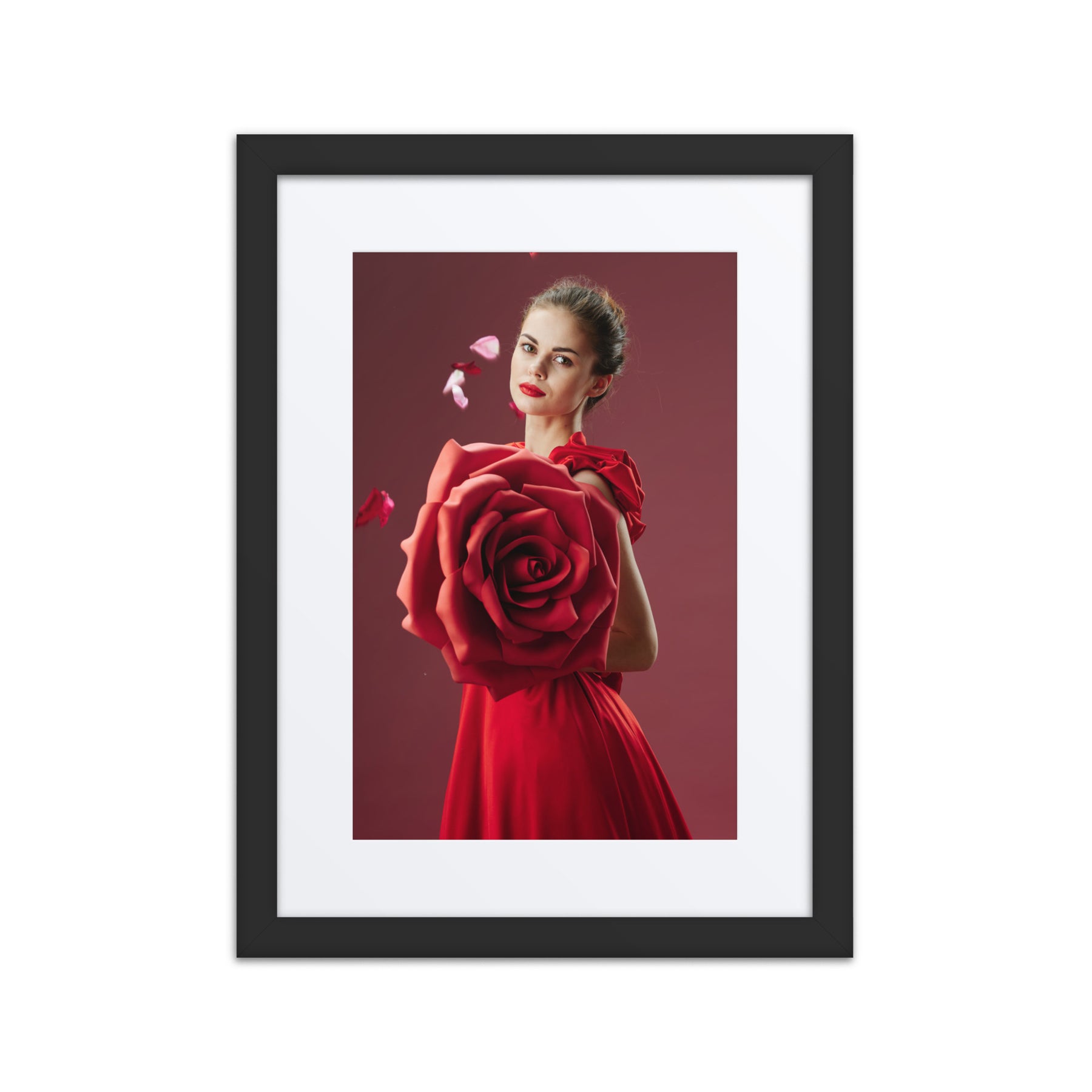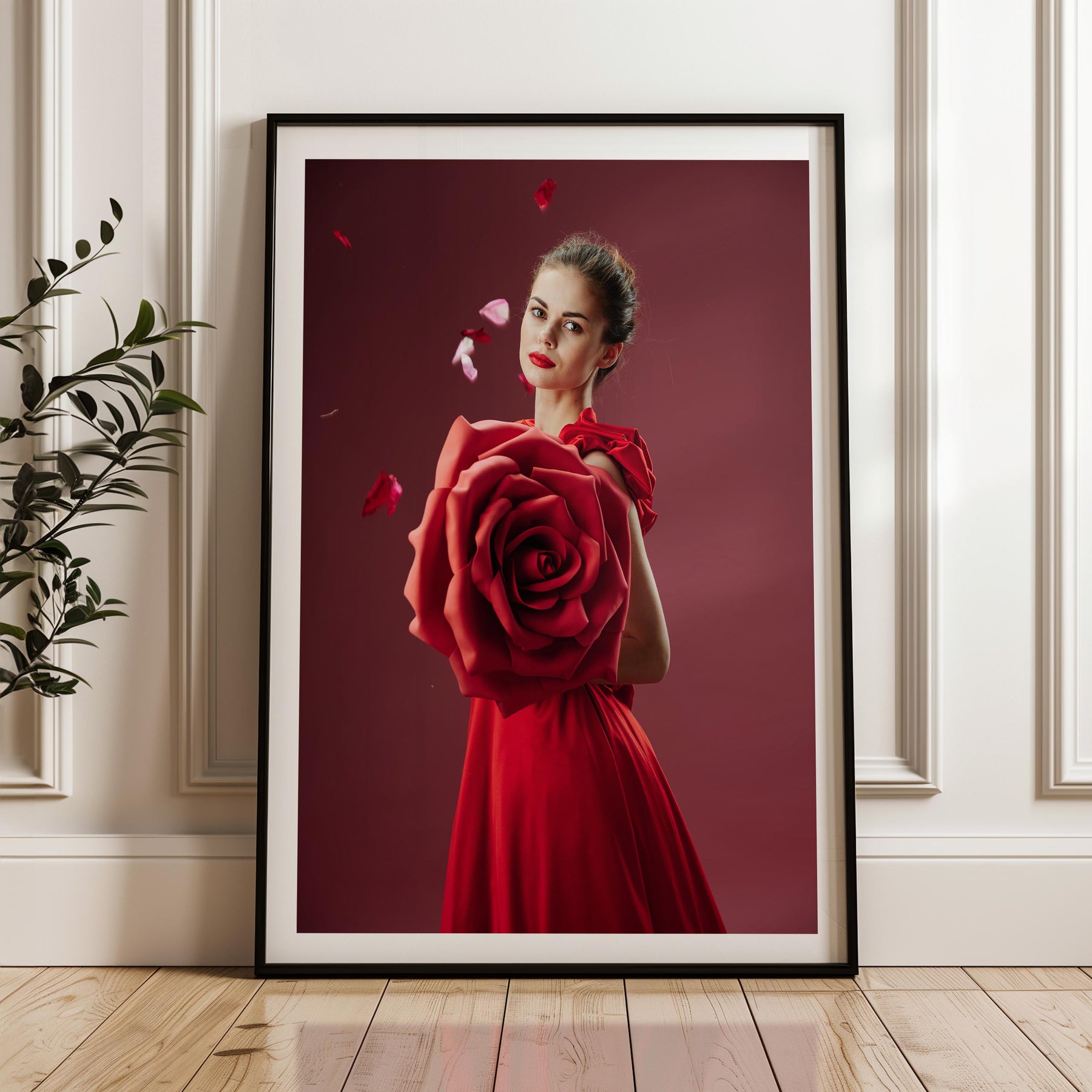 Immerse your space in romance with "Rose of Elegance," a stunning framed poster art piece portraying a woman holding a giant rose. This artwork brings beauty and drama into any living room, bedroom, or creative workspace, making it ideal for Gen Z renters and romantic gift buyers alike. Transform your wall art decor with this eye-catching piece! Explore our digital gallery online for more captivating digital art prints for home decor!