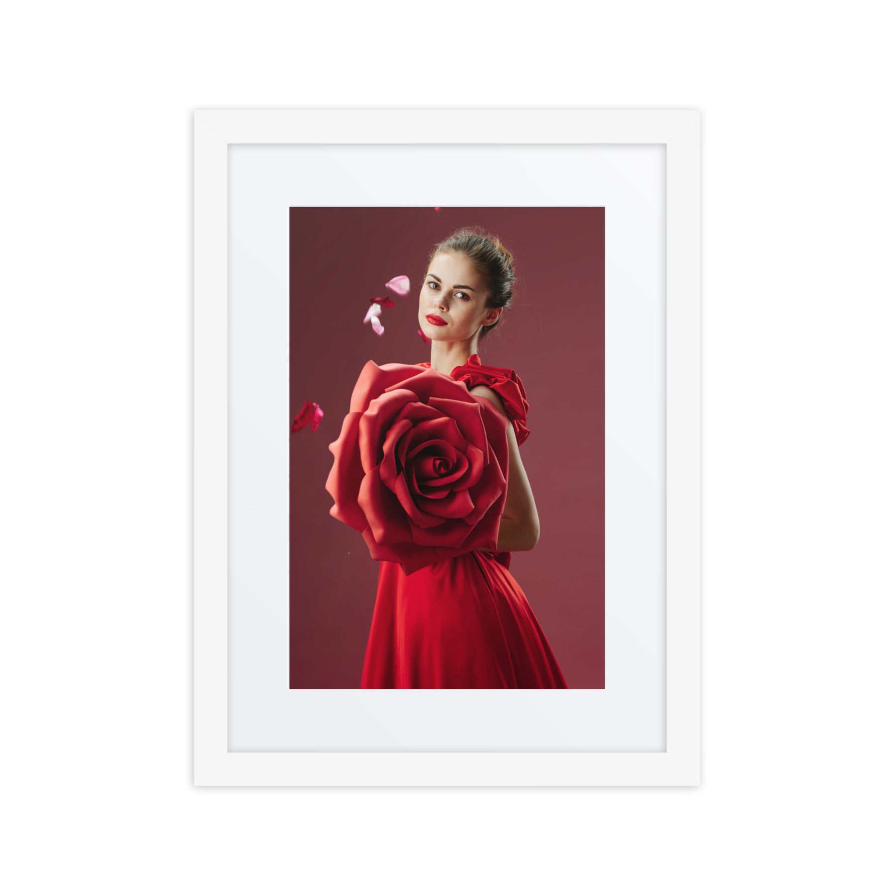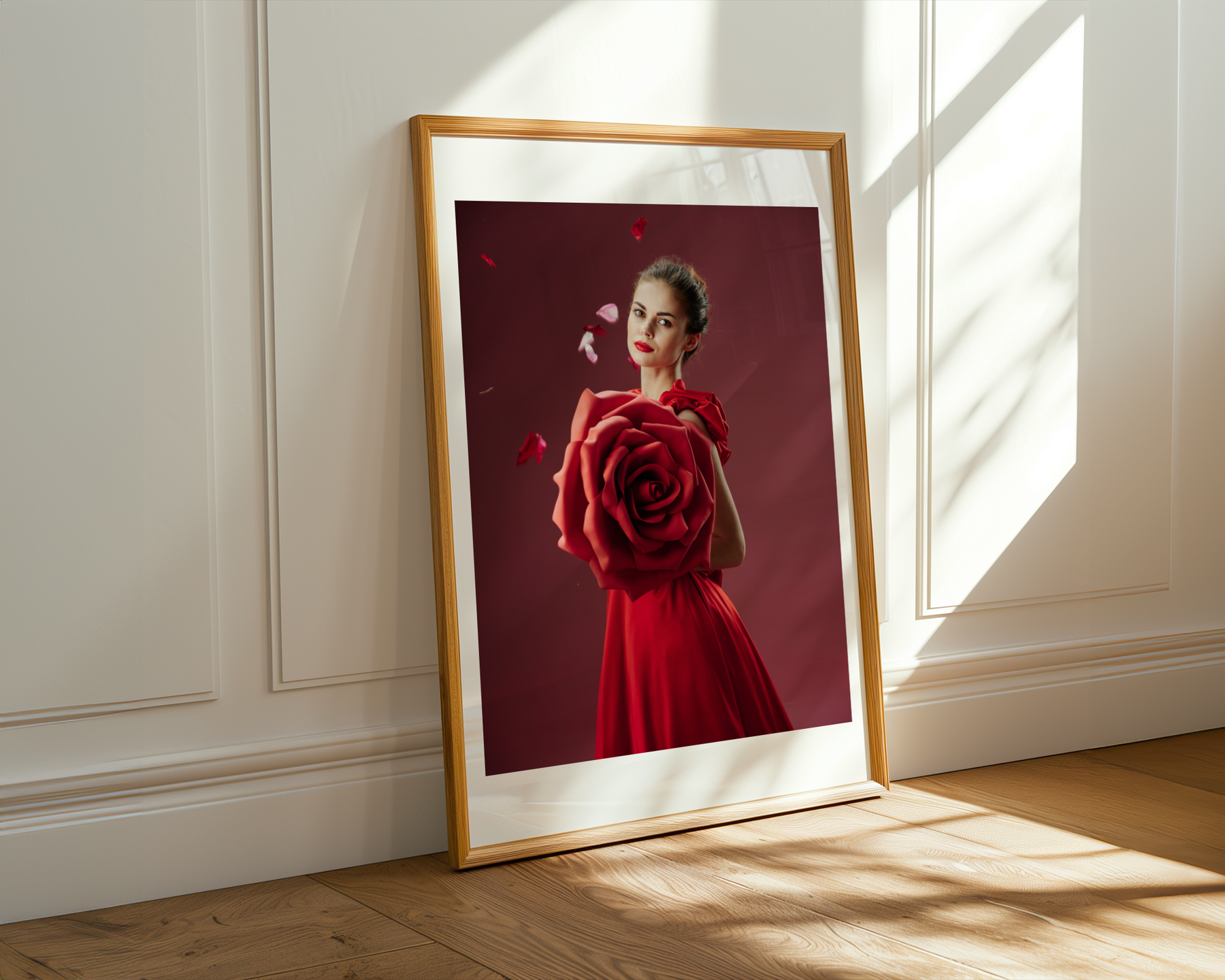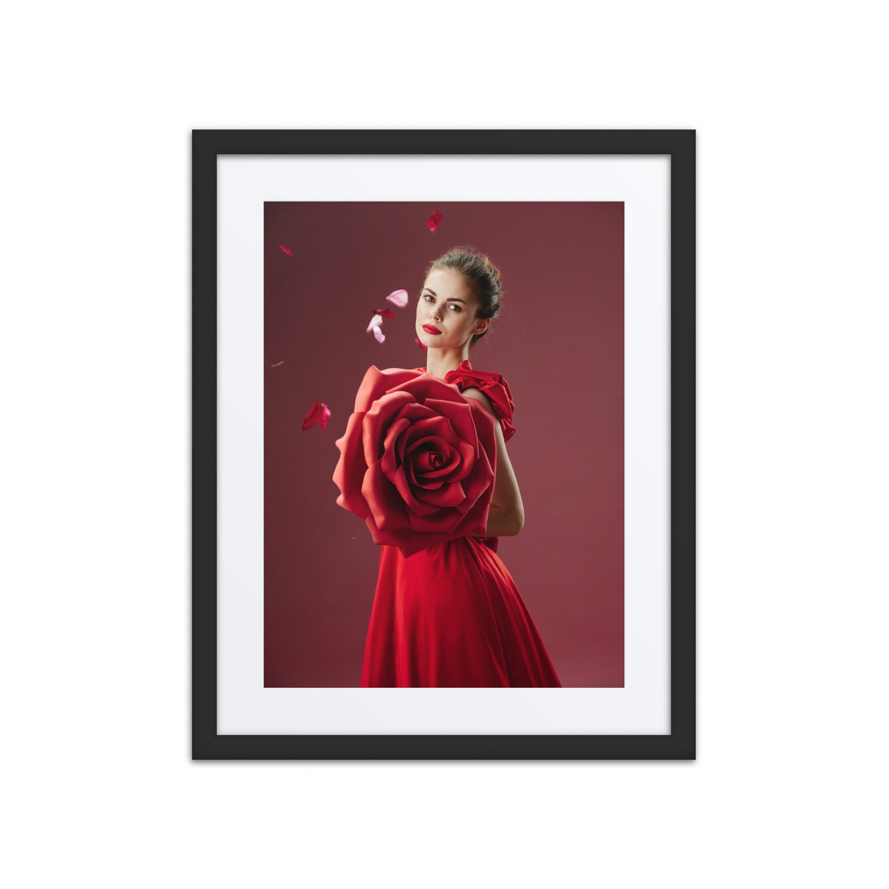 Immerse your space in romance with "Rose of Elegance," a stunning framed poster art piece portraying a woman holding a giant rose. This artwork brings beauty and drama into any living room, bedroom, or creative workspace, making it ideal for Gen Z renters and romantic gift buyers alike. Transform your wall art decor with this eye-catching piece! Explore our digital gallery online for more captivating digital art prints for home decor!