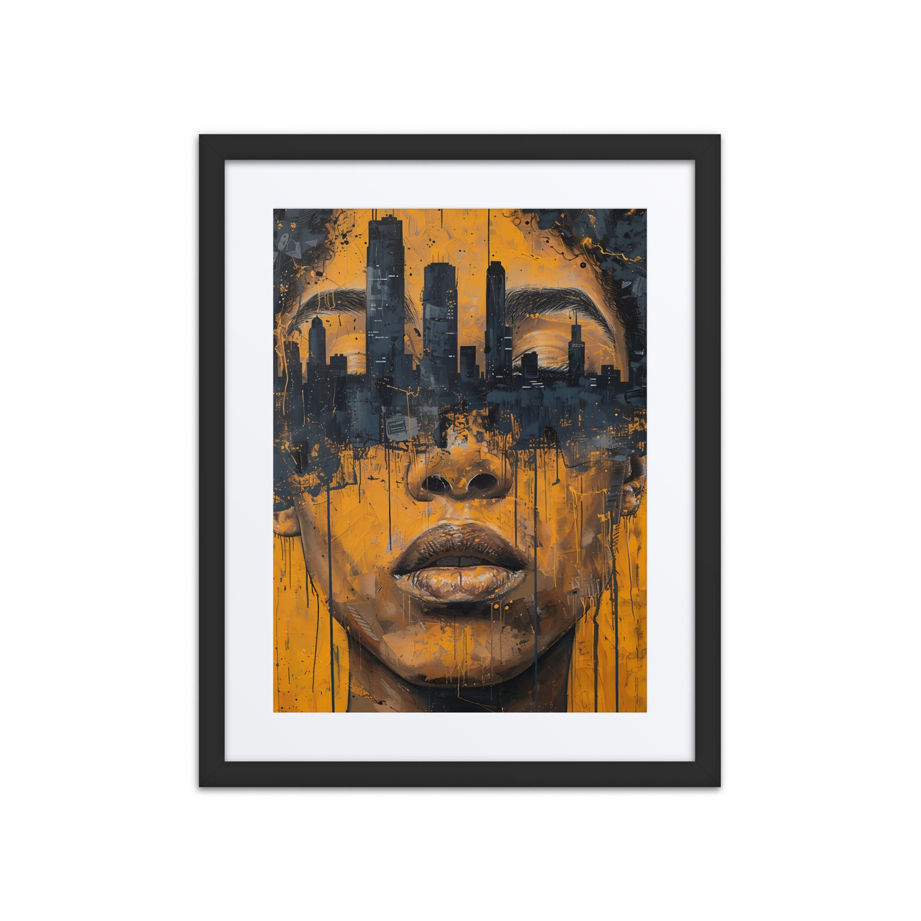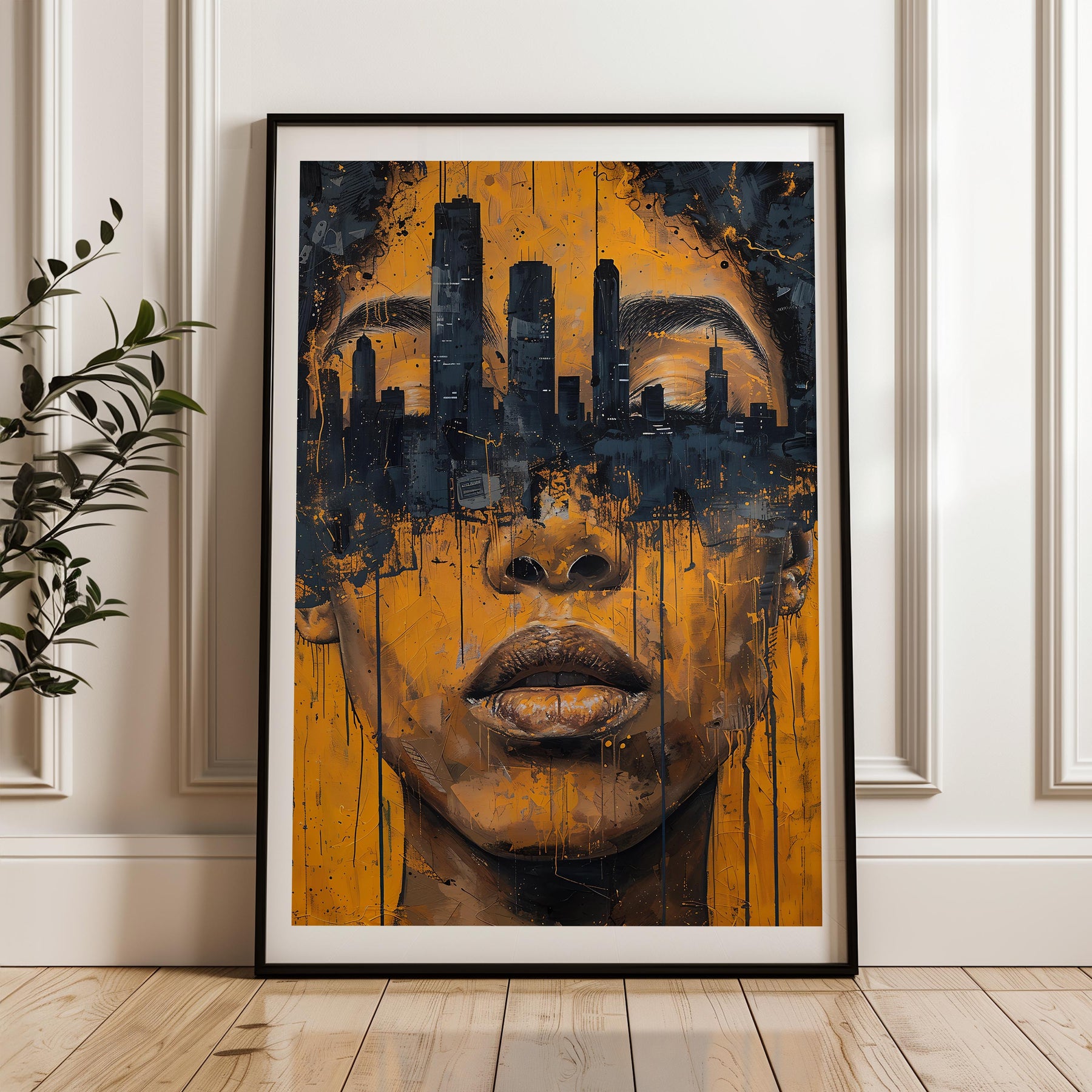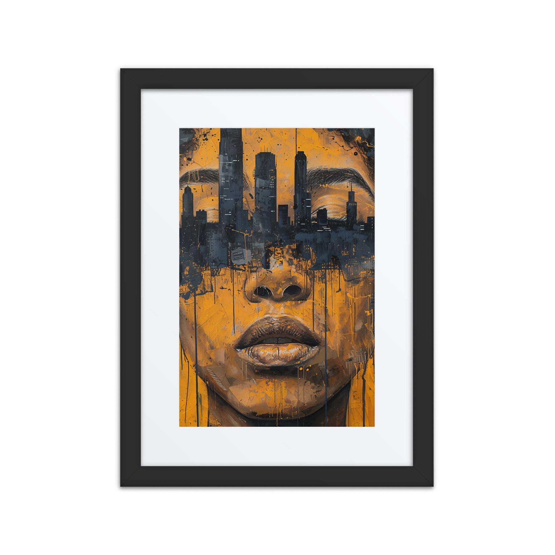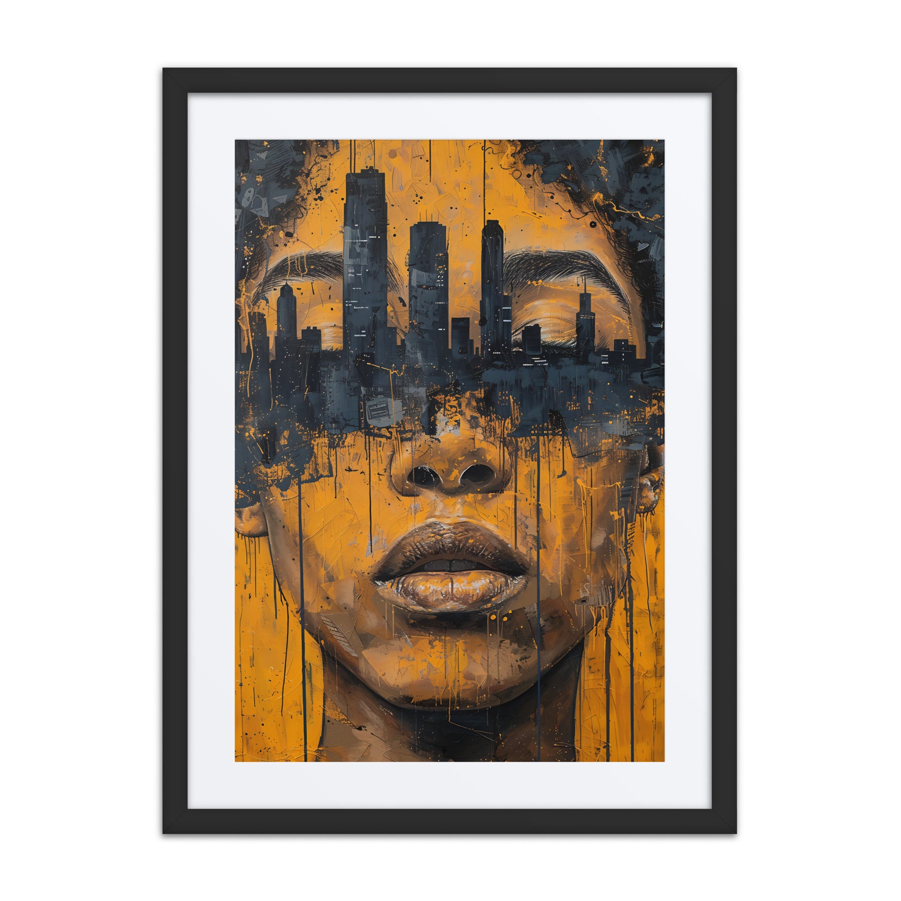 Dive into the cityscape with "Urban Visionary." This mesmerizing framed poster merges architectural splendor with a soulful gaze, adding depth and intrigue to any living room or office space. Perfect for Gen Z renters and digital art lovers, this piece from our digital art gallery online is a testament to modern elegance and bold design.