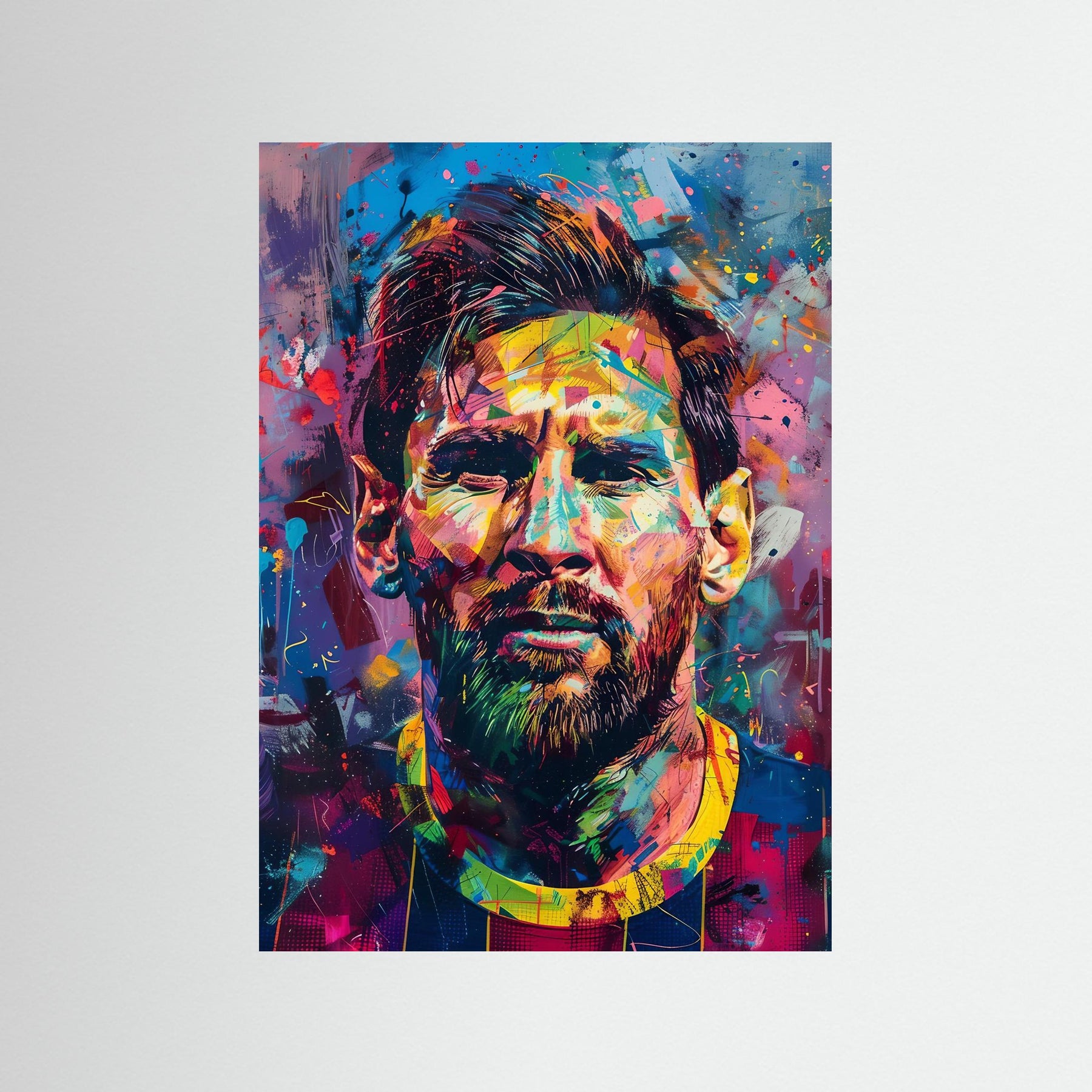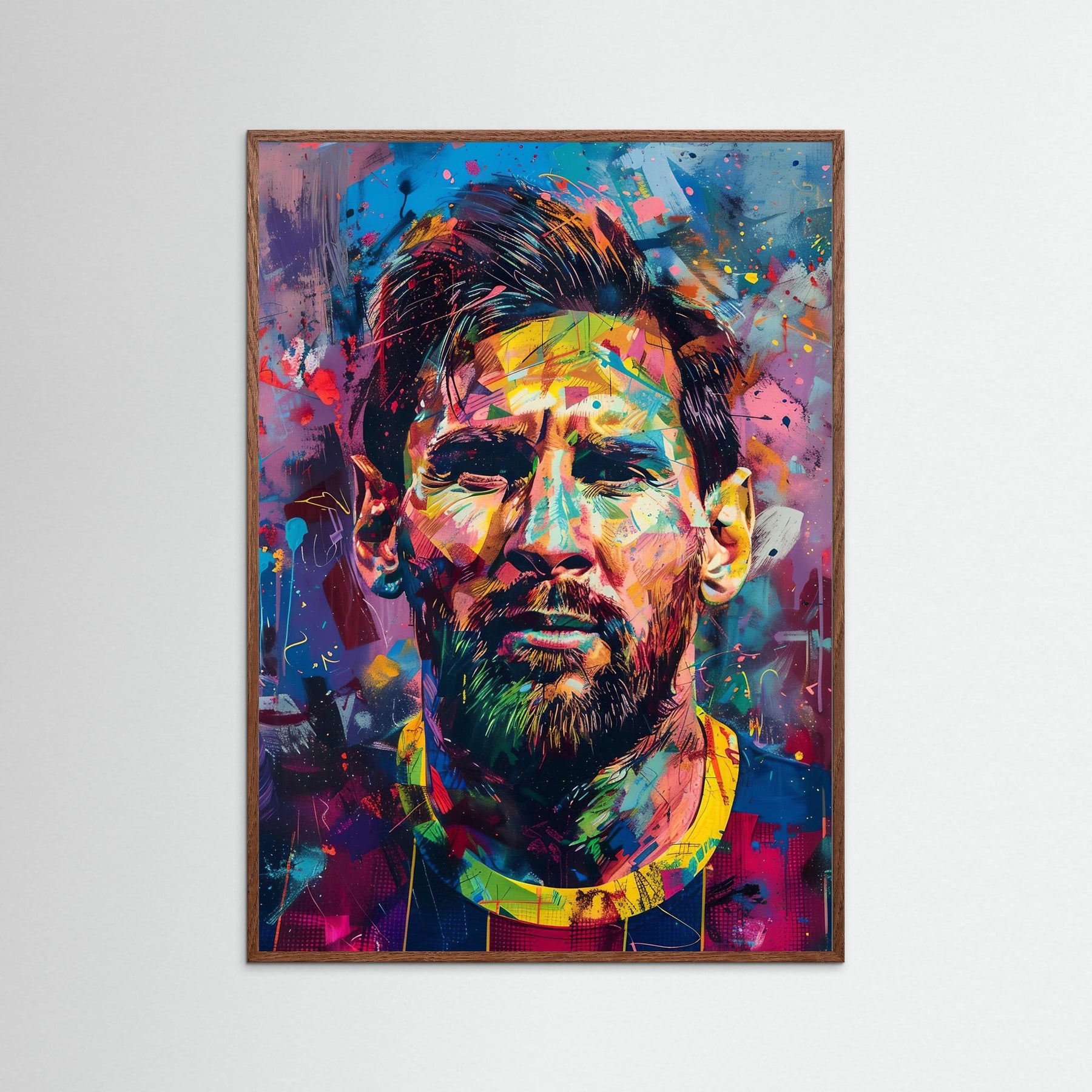 This striking framed poster captures the electrifying presence of Lionel Messi, bathed in a vivid colorstorm that pulses with motion, intensity, and heart. It’s more than a portrait—it’s a tribute to greatness, grit, and the rhythm of a game that moves the world.