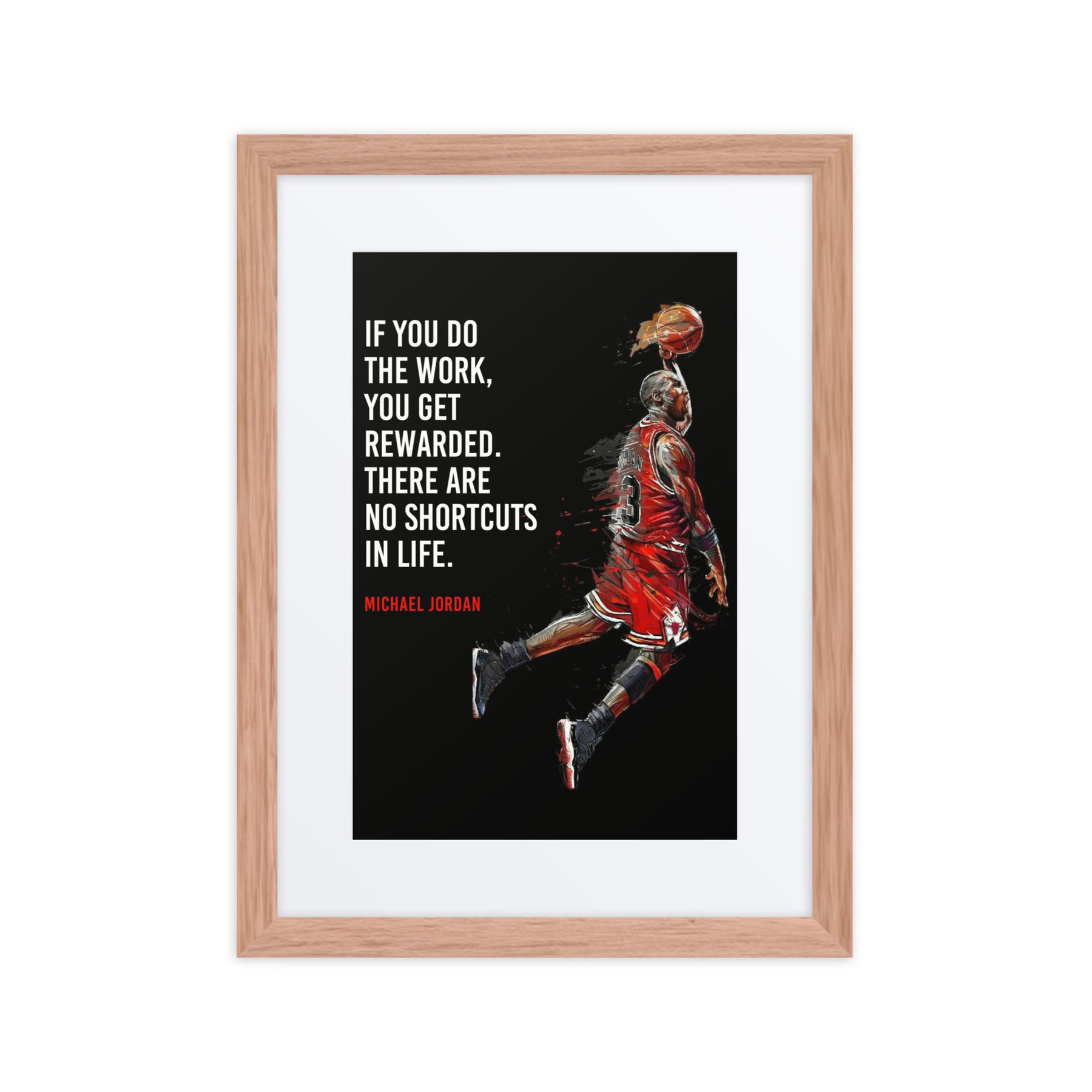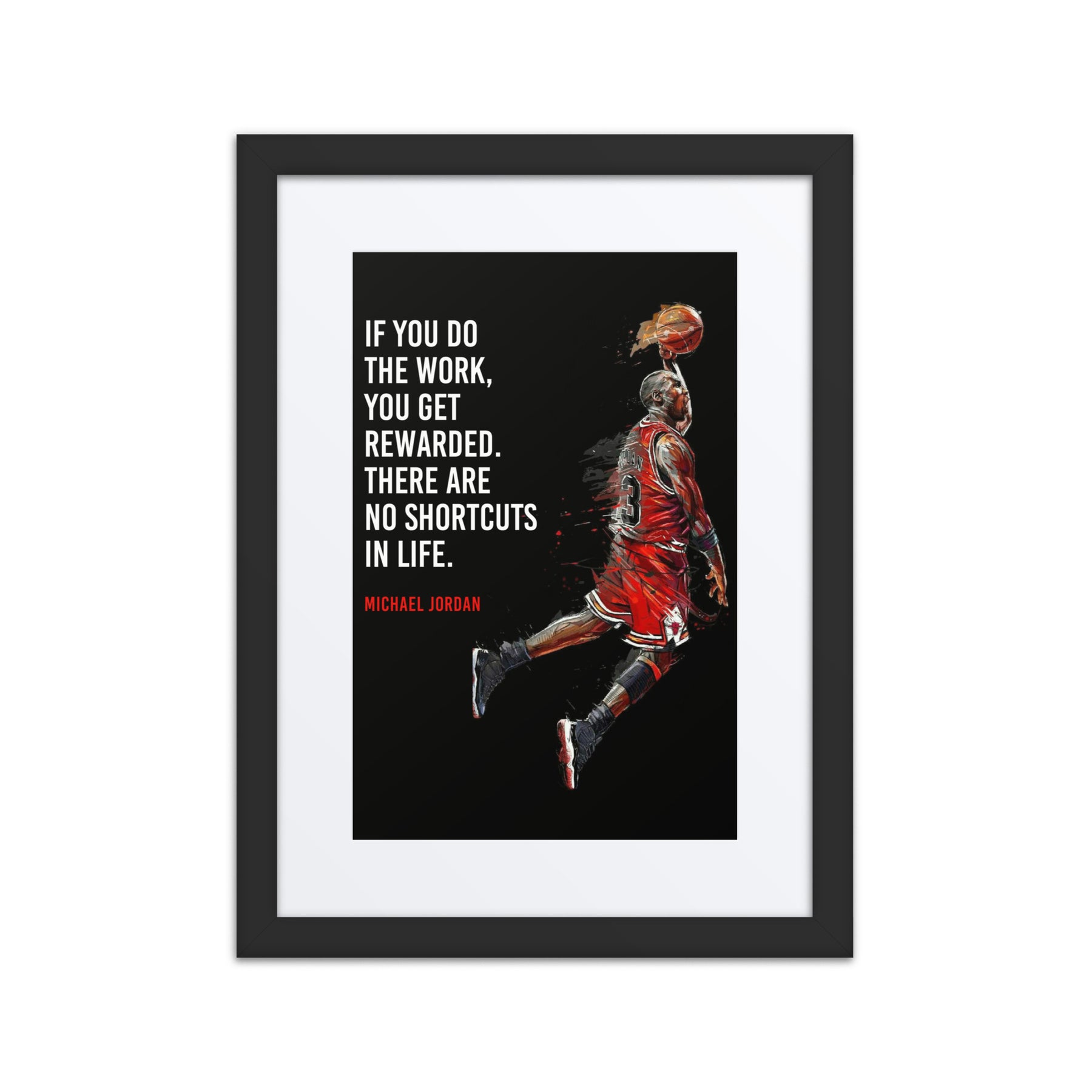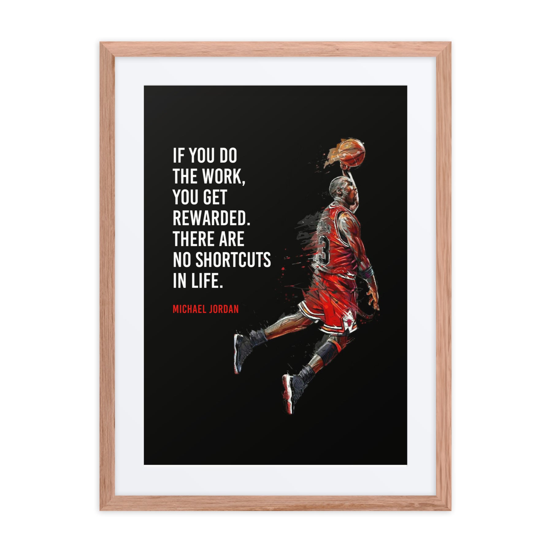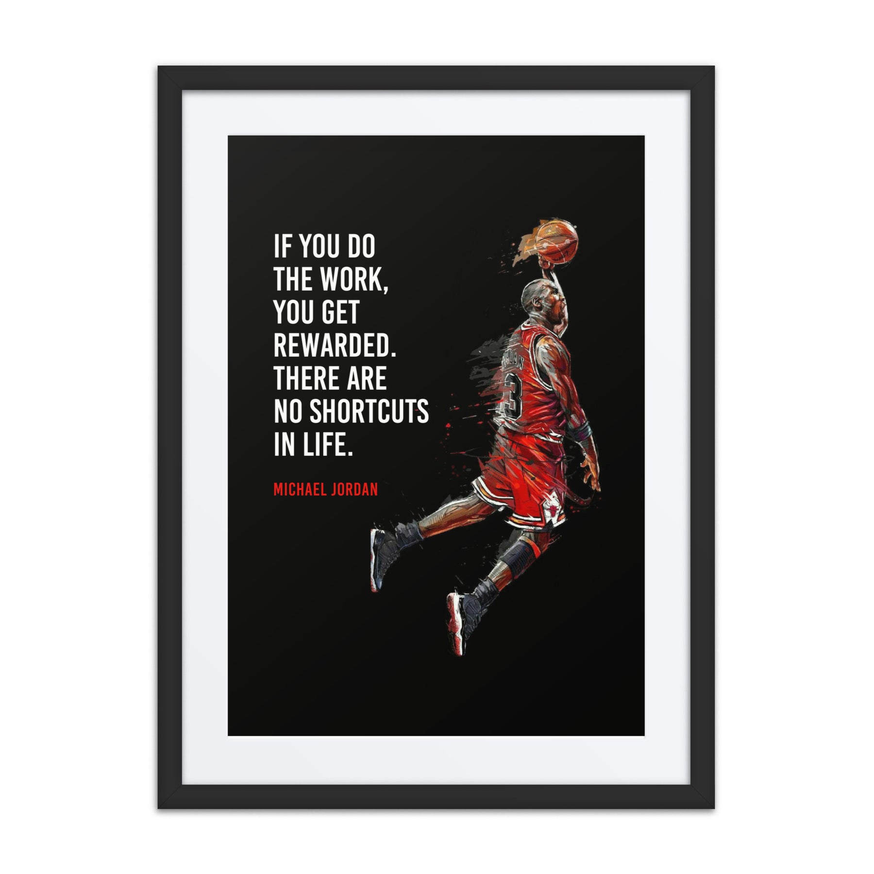 Channel the determination of a legend with this dynamic poster featuring Michael Jordan's powerful quote: "If you do the work, you get rewarded. There are no shortcuts in life. " Perfect for any aspiring athlete or dreamer, this framed wall art inspires hard work and perseverance. Add this impactful piece to your living room or office decor and let it motivate you daily!