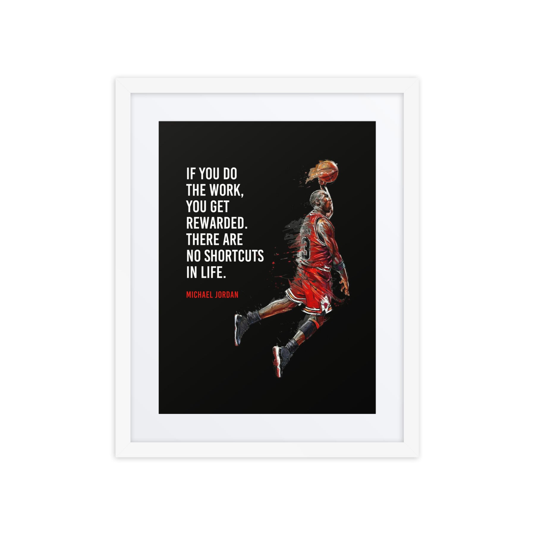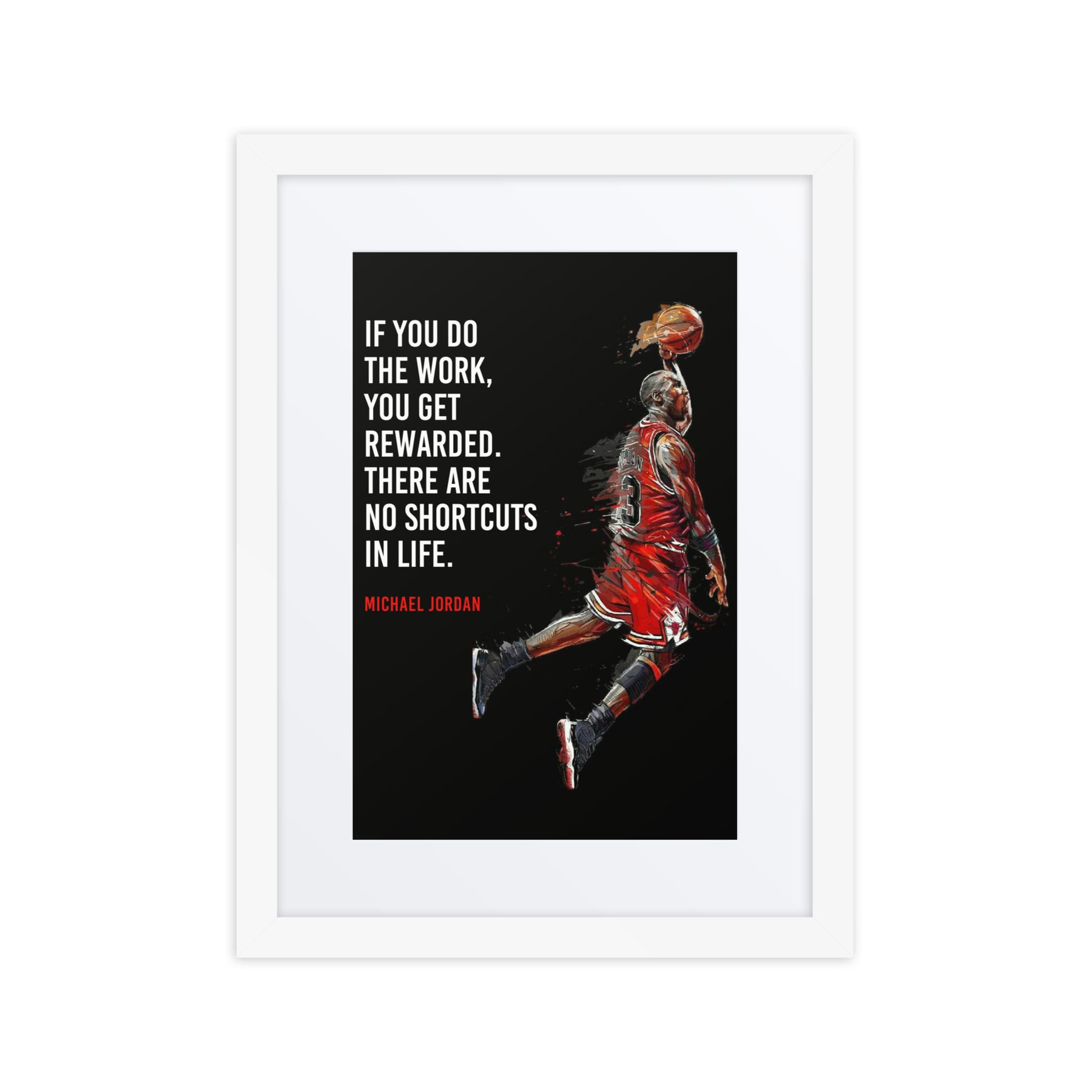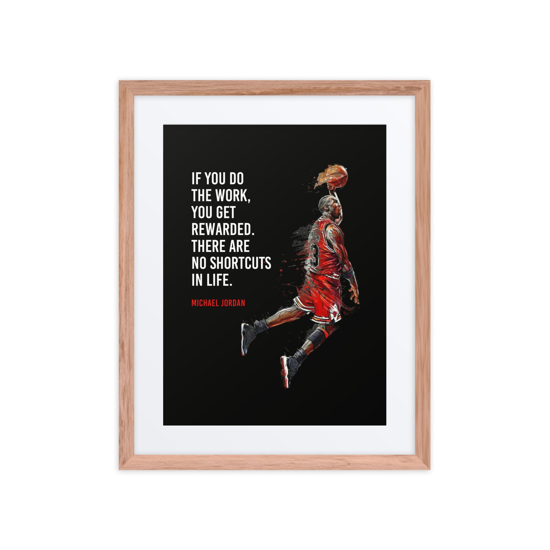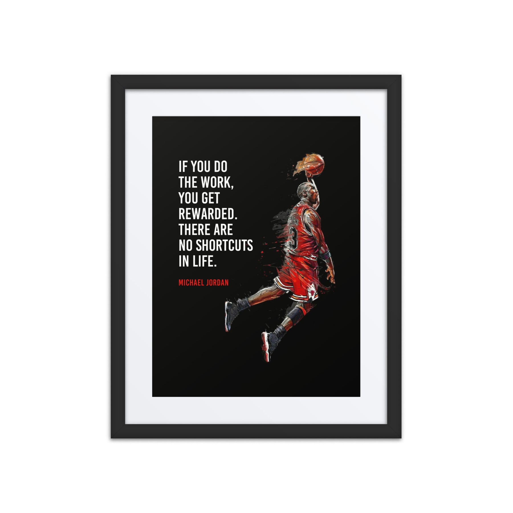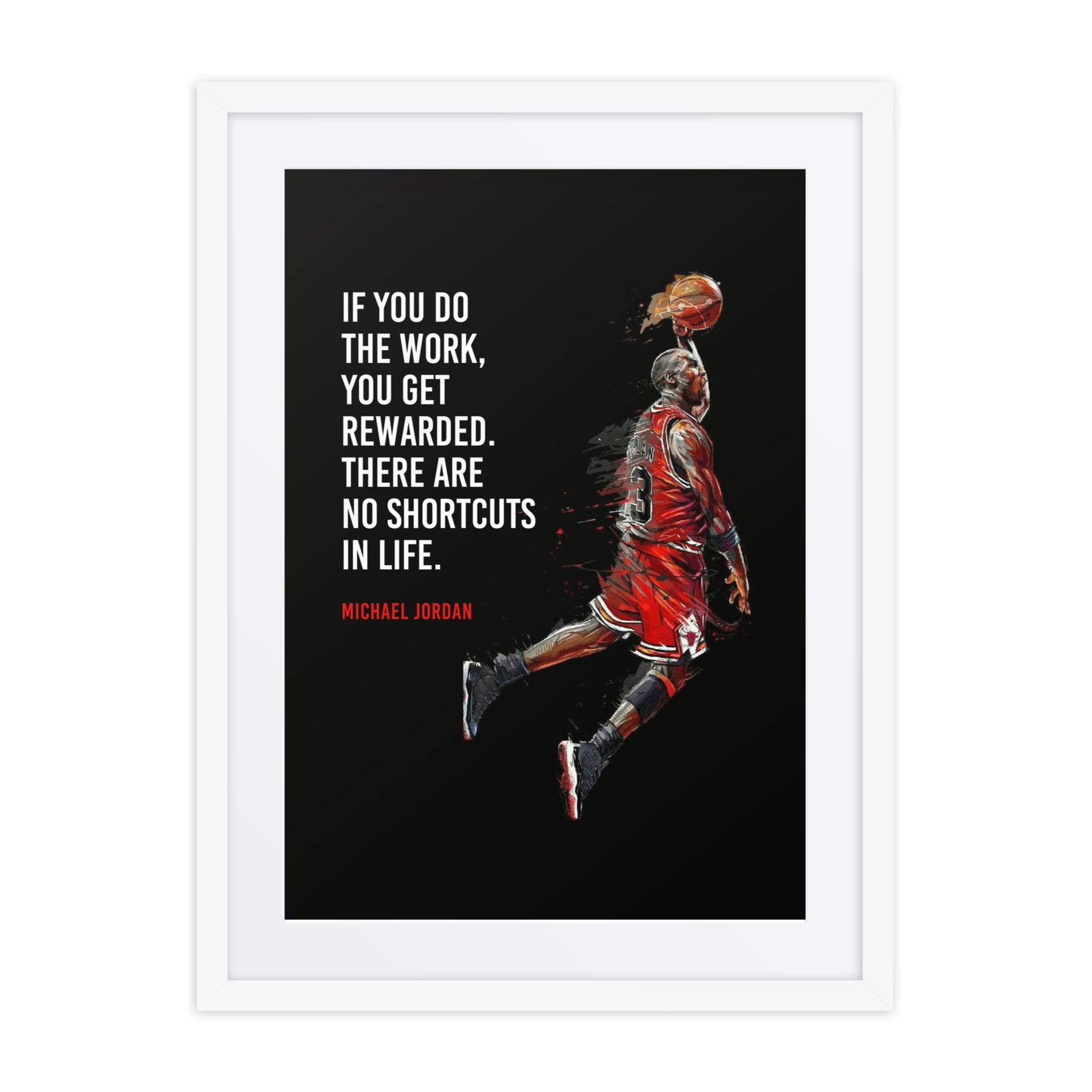 Channel the determination of a legend with this dynamic poster featuring Michael Jordan's powerful quote: "If you do the work, you get rewarded. There are no shortcuts in life. " Perfect for any aspiring athlete or dreamer, this framed wall art inspires hard work and perseverance. Add this impactful piece to your living room or office decor and let it motivate you daily!