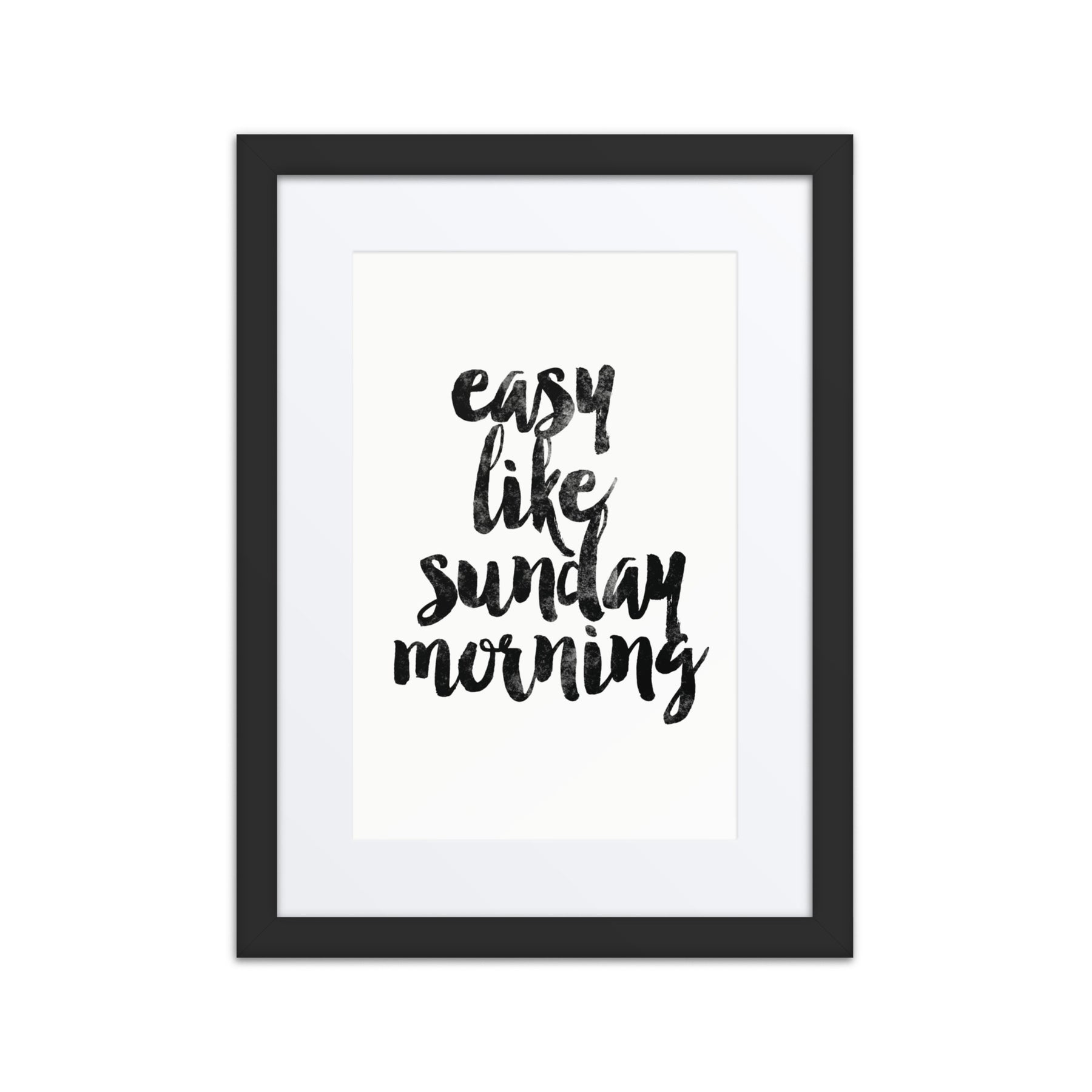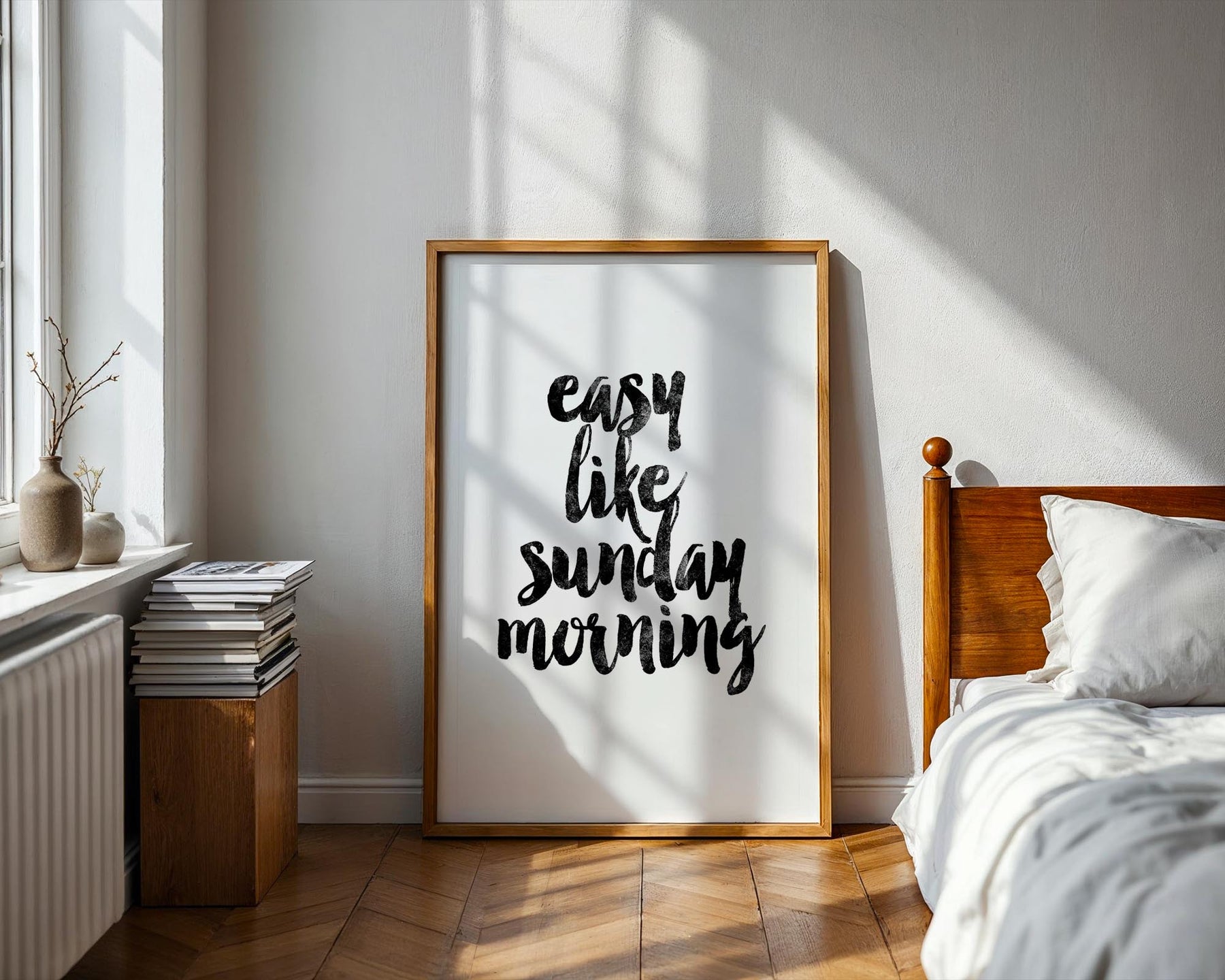 Create a soothing atmosphere with "Relaxed Vibes: 'Easy Like Sunday Morning.'" This simplistic framed print captures the essence of tranquility and leisure with a minimalist design that features soft, calming typography. The understated elegance makes it a versatile addition to any room, be it a bedroom, living room, or quiet nook.