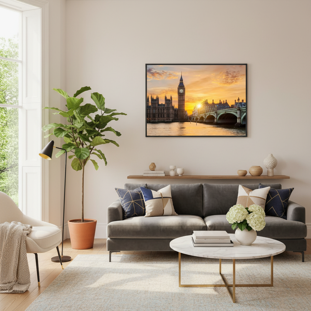 Celebrate the beauty of London with this breathtaking framed poster featuring Big Ben at sunset. Its warm colors and iconic imagery make it a timeless addition to any wall.