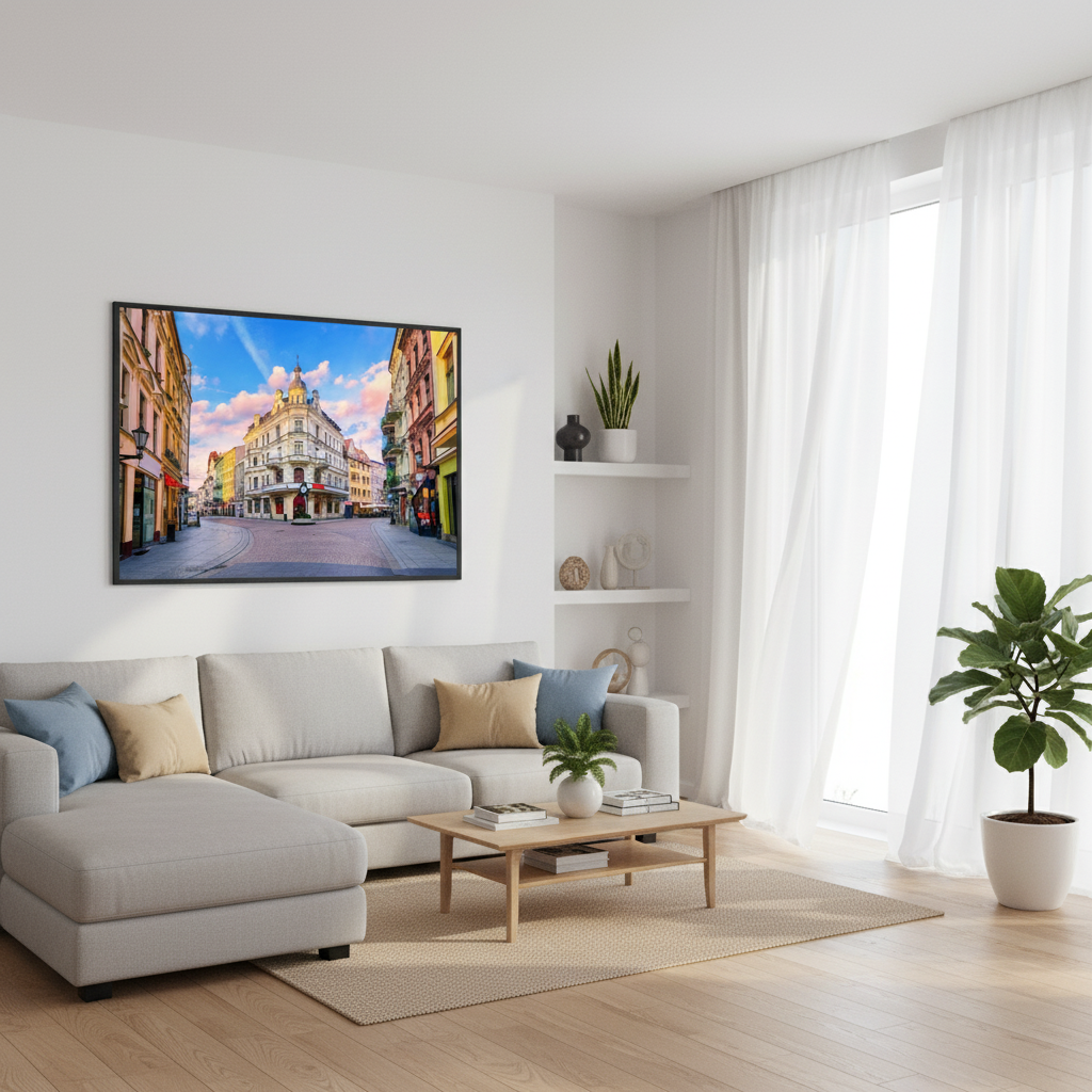 Immerse yourself in the charm of European architecture with this vibrant framed poster. Perfect for adding character to any room, it invites viewers to explore its quaint streets.