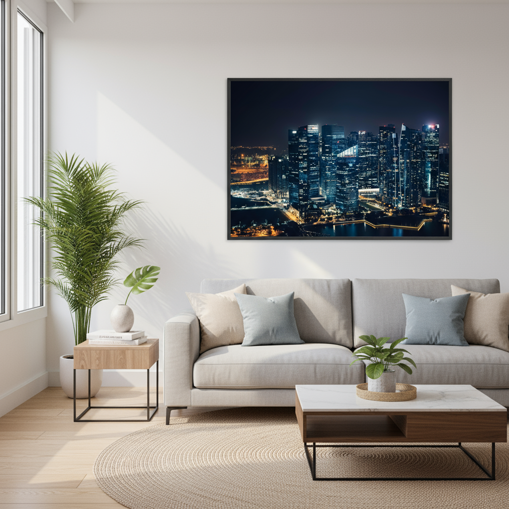 Capture the vibrant energy of the city with this stunning nighttime skyline poster. Perfect for modern spaces, it adds a touch of urban sophistication to your decor.
