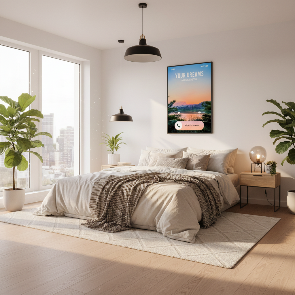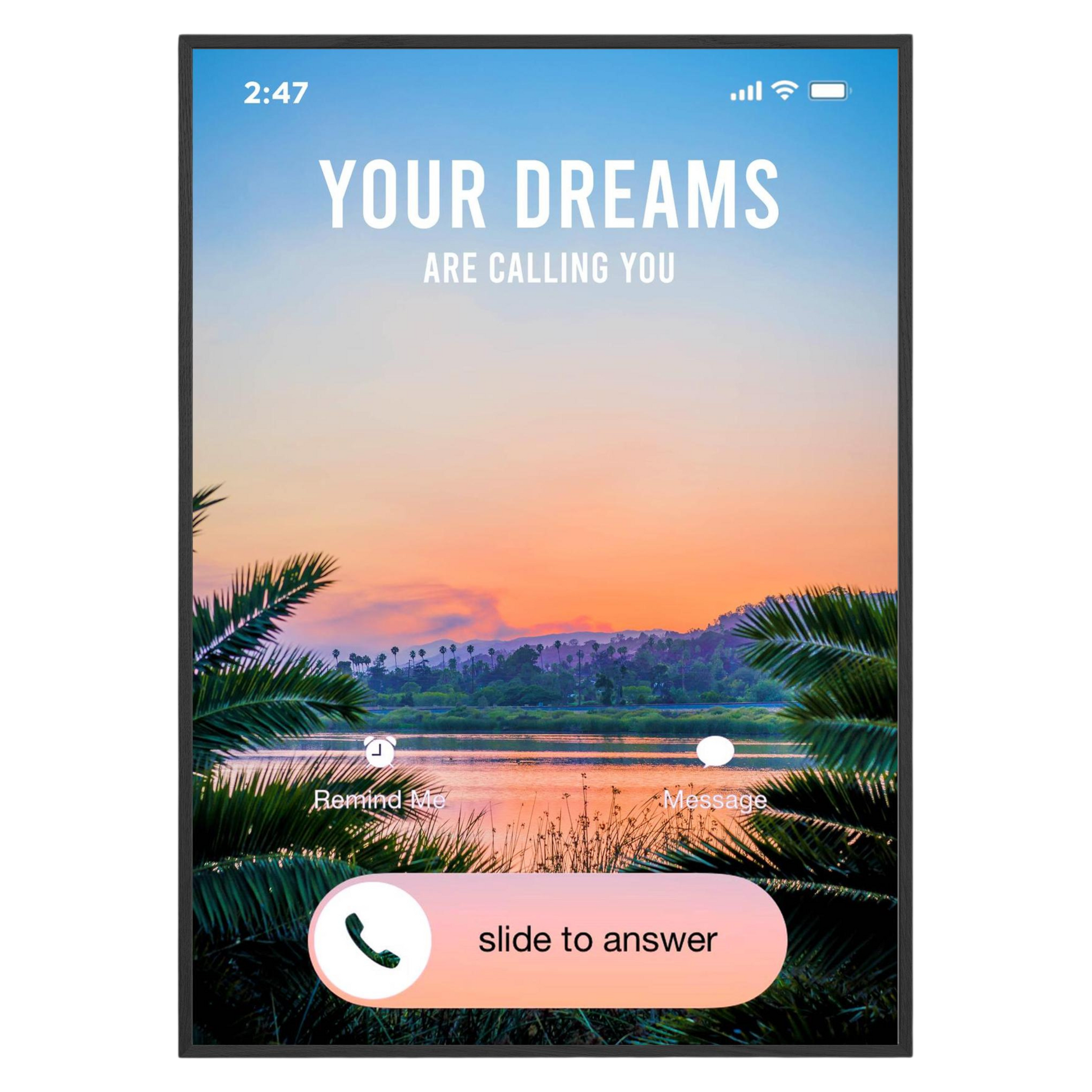 Answer the call of your aspirations with this vibrant "Your Dreams Are Calling You" framed poster ! Designed like a smartphone notification , this playful art piece encourages you to embrace your passions and follow your dreams. Perfect for bedroom or office decor, it inspires creativity and excitement . Elevate your wall art decor with this reminder that your dreams