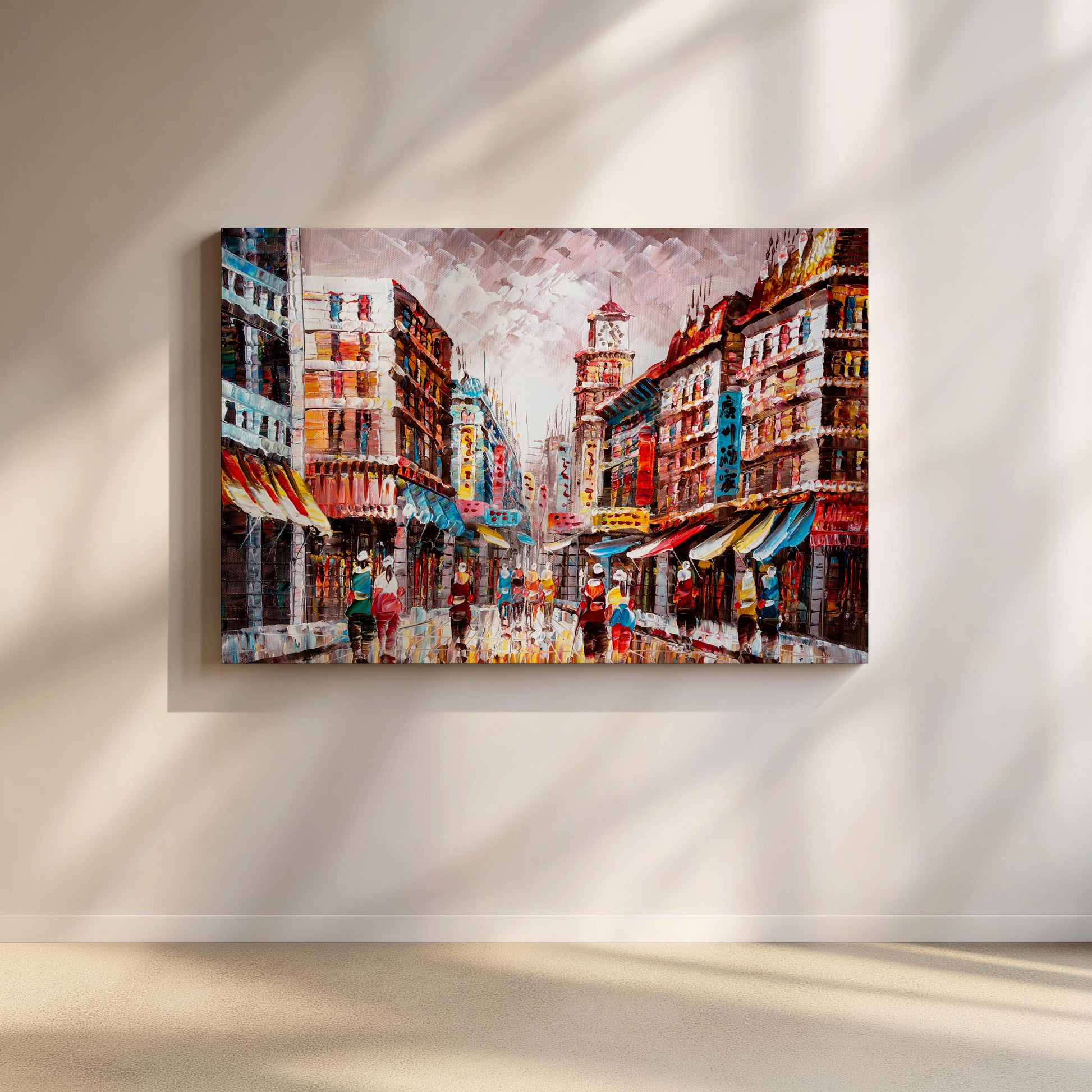 Step into the heart of a bustling market street, brilliantly captured in this vibrant framed canvas. Each brushstroke brings to life the eclectic architecture and the vibrant activity of city life, from shoppers bargaining to vendors displaying their colorful wares. Perfectly framed to enhance its urban appeal, this piece not only decorates your space but also celebrates the dynamic spirit of city life.