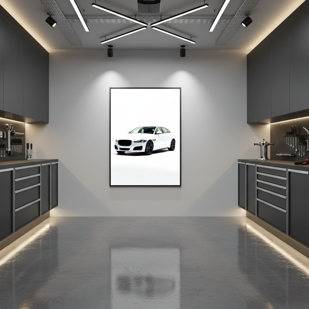 Add a touch of class to your decor with "Dynamic Presence, " featuring a sophisticated white sedan that combines innovation and elegance. This framed poster art serves as a subtle yet impactful statement piece for your living room or office . Infuse your space with sophistication and let your wall decor inspire a sense of achievement !