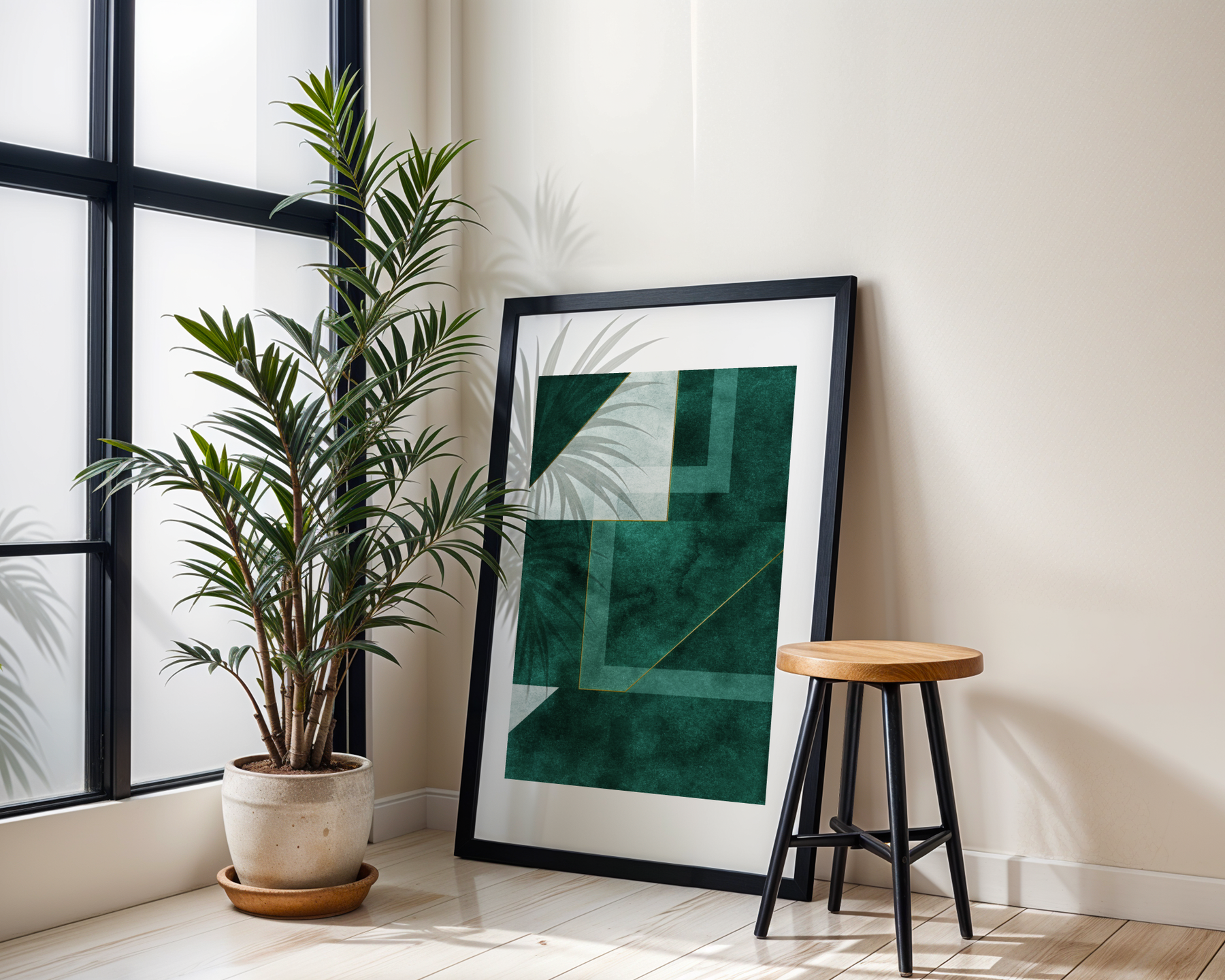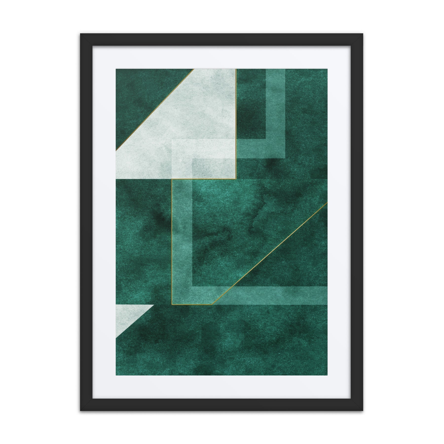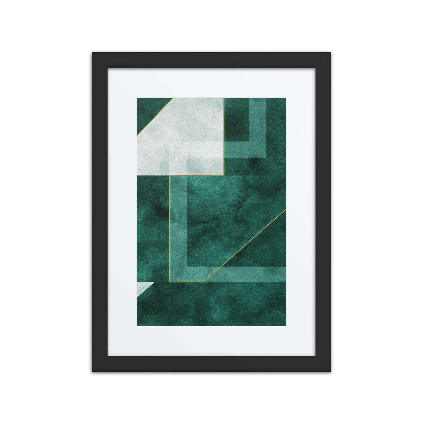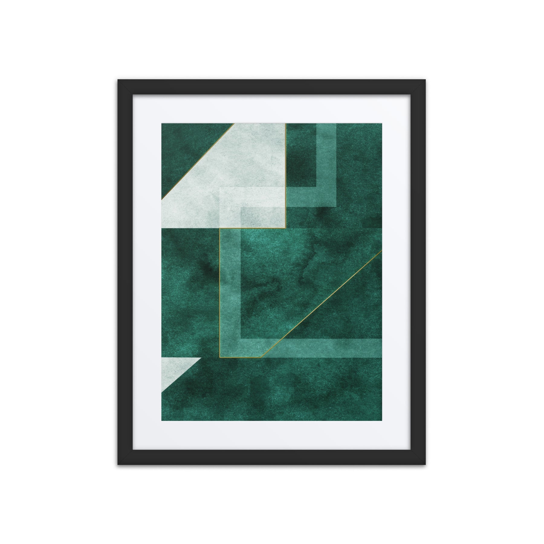 Bring sophistication to your space with this elegant framed poster. The deep green hues and soft textures create a calming atmosphere, while the abstract geometric elements add a contemporary flair. This piece is perfect for any setting, infusing your decor with a touch of style and tranquility.