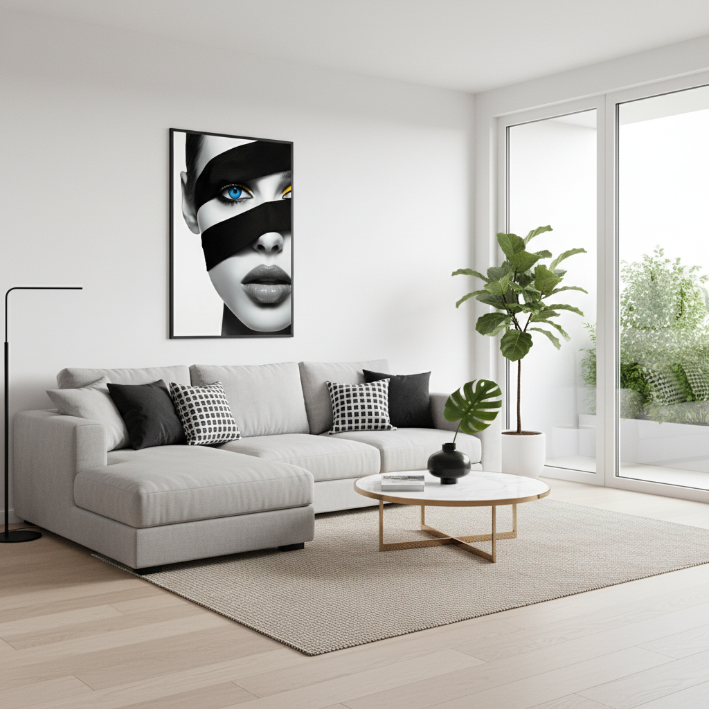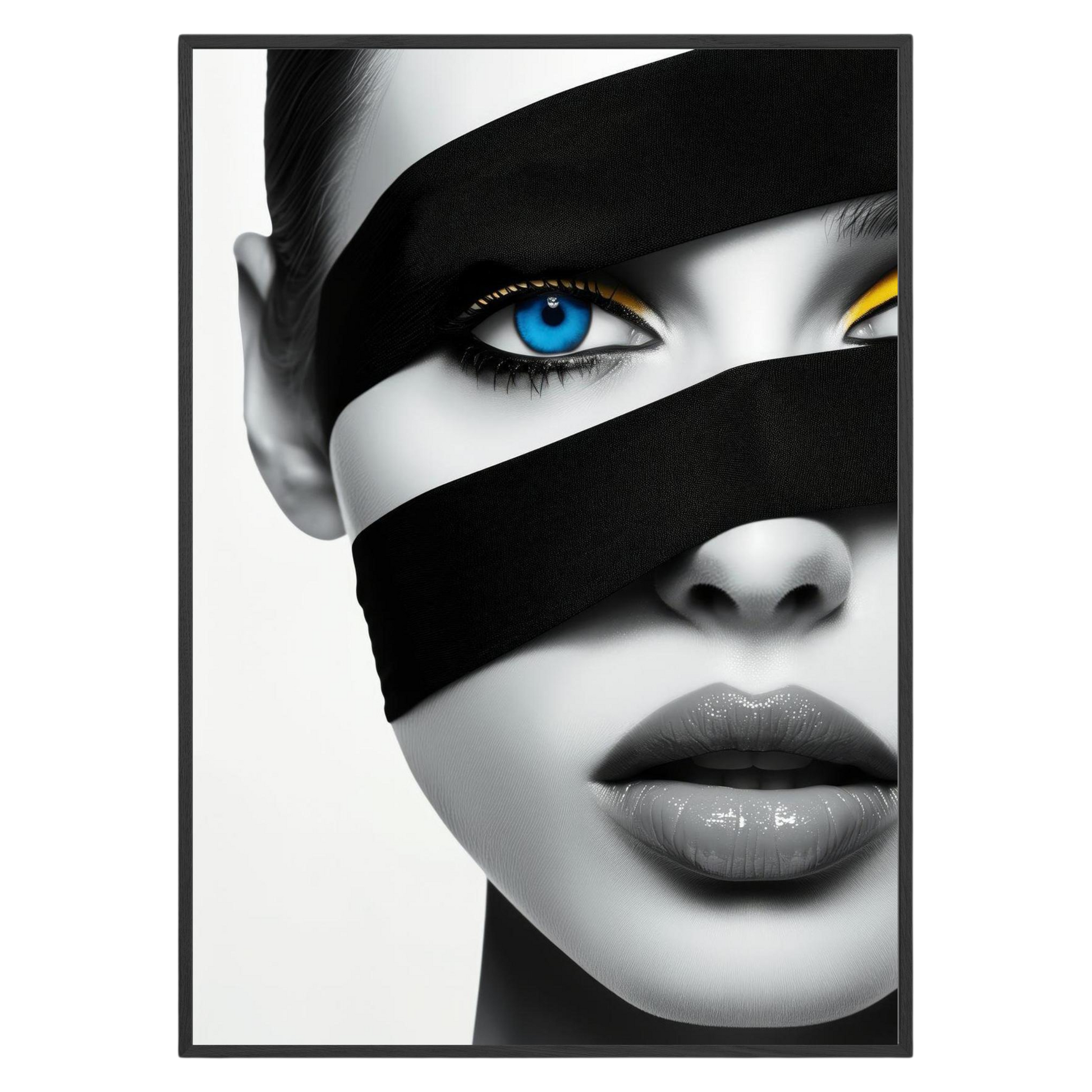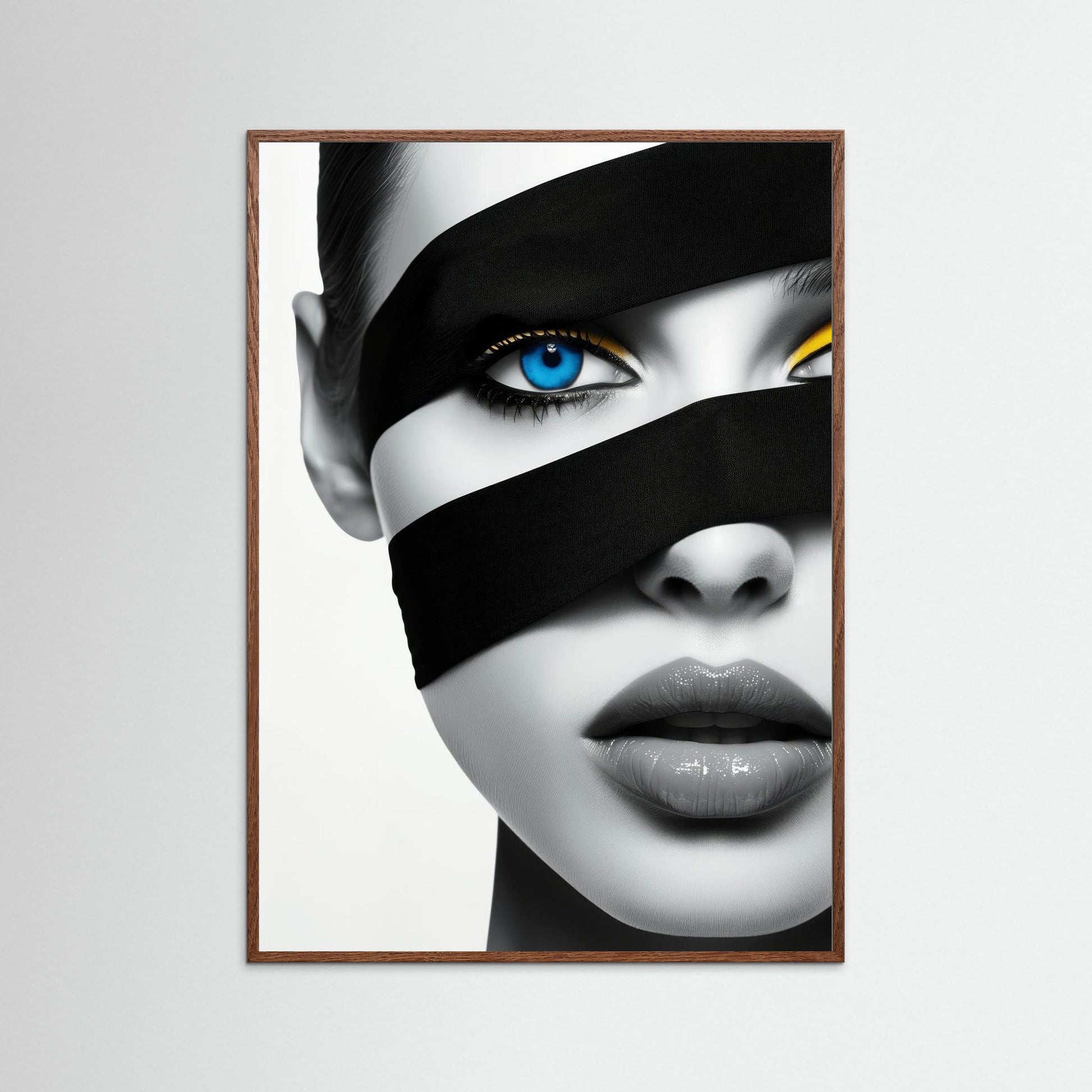 Discover mystery with "Enigma Blue." This captivating framed poster combines stark contrasts and piercing blue eyes, offering a dramatic focal point for any room. Perfect for bedrooms and offices, it's a compelling addition for those seeking unique wall art decor.