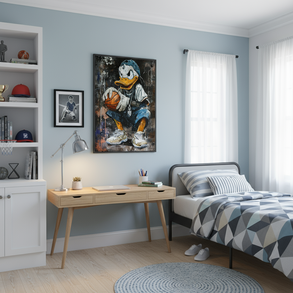 Channel the spirit of the court with "Hoops King." This lively poster wall art showcases an iconic character poised for action, making it ideal for sports fans and Gen Z renters. Enhance your bedroom or office with this bold, energetic piece from our extensive digital art gallery online.