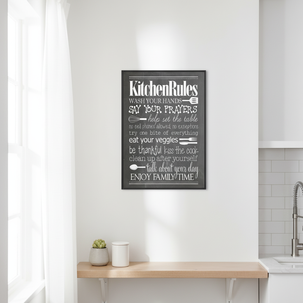 Infuse warmth and fun into your kitchen with this whimsical "Kitchen Rules" framed poster ! Featuring delightful reminders about family, food, and love, this wall art decor is perfect for creating a joyful atmosphere during mealtime. Ideal for any home, this playful piece brings personality to your kitchen while reminding everyone of the importance of togetherness . Elevate your home decor with this charming addition !