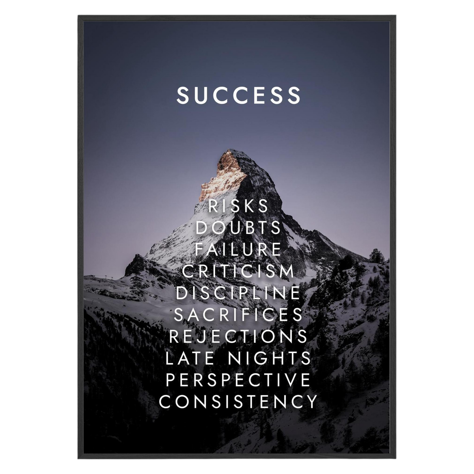 Reach new heights with this inspiring "Success" framed wall art! Showcasing a stunning mountain backdrop , it highlights the key traits necessary for success: risks, discipline , and perseverance. Ideal for any living room or workspace , this piece not only beautifies your decor but also fuels your ambition . Let it inspire you to conquer your dreams every day!
