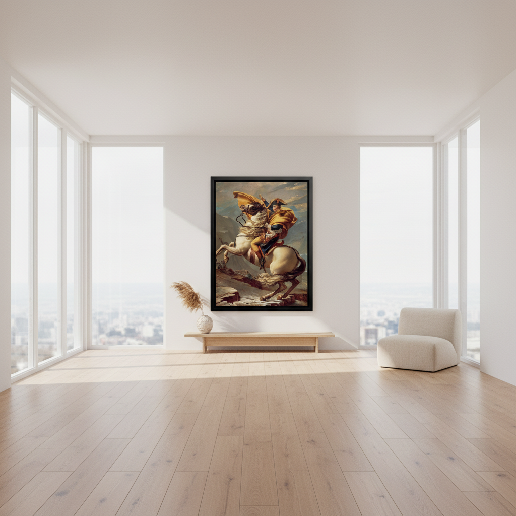 Printed on museum-grade canvas with vibrant, UV-resistant inks, every detail — from the folds of the flowing cloak to the gleam of the horse’s mane — is brought vividly to life. Set in a sleek black wooden frame, this piece makes a bold statement in living rooms, offices, or libraries.