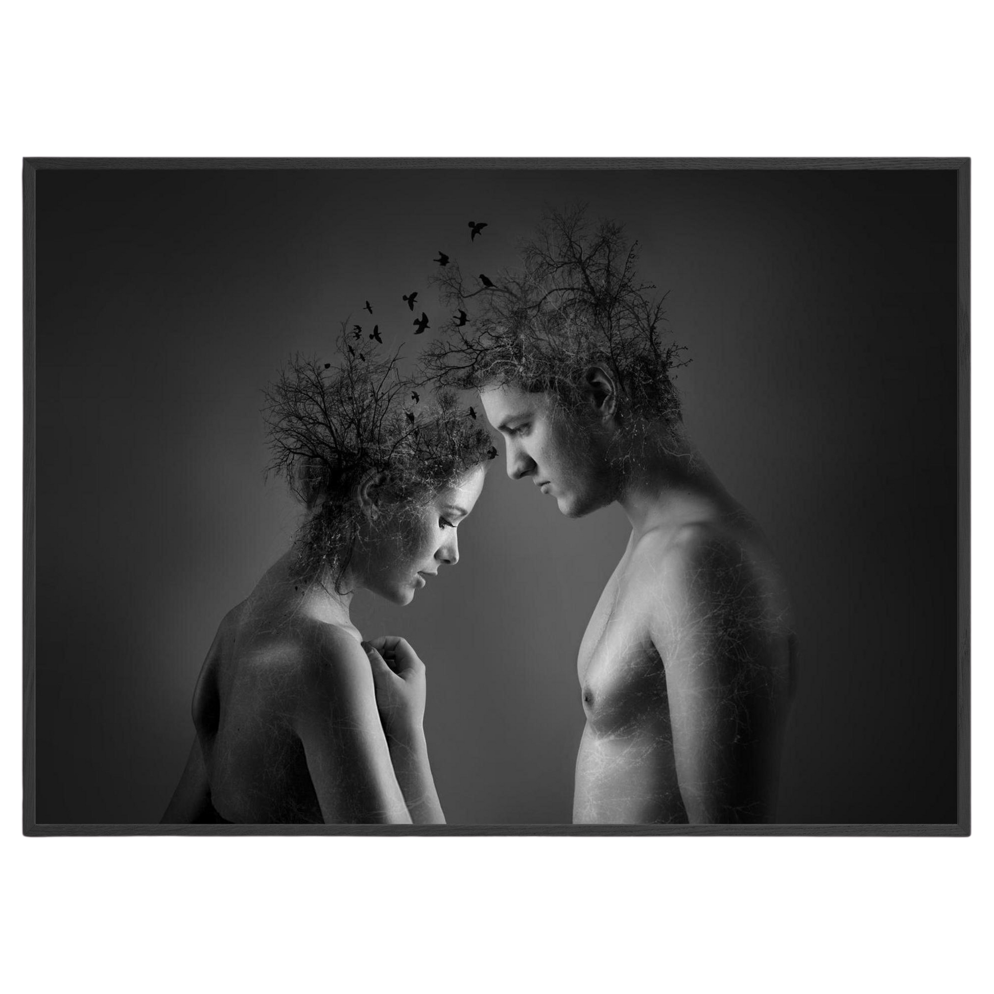 Explore the beauty of connection with "Nature's Embrace." This captivating black and white framed poster highlights the unity of nature and humanity, adding depth and emotion to any decor. A stunning choice for interior design aficionados seeking thought-provoking digital art prints for home enhancement.