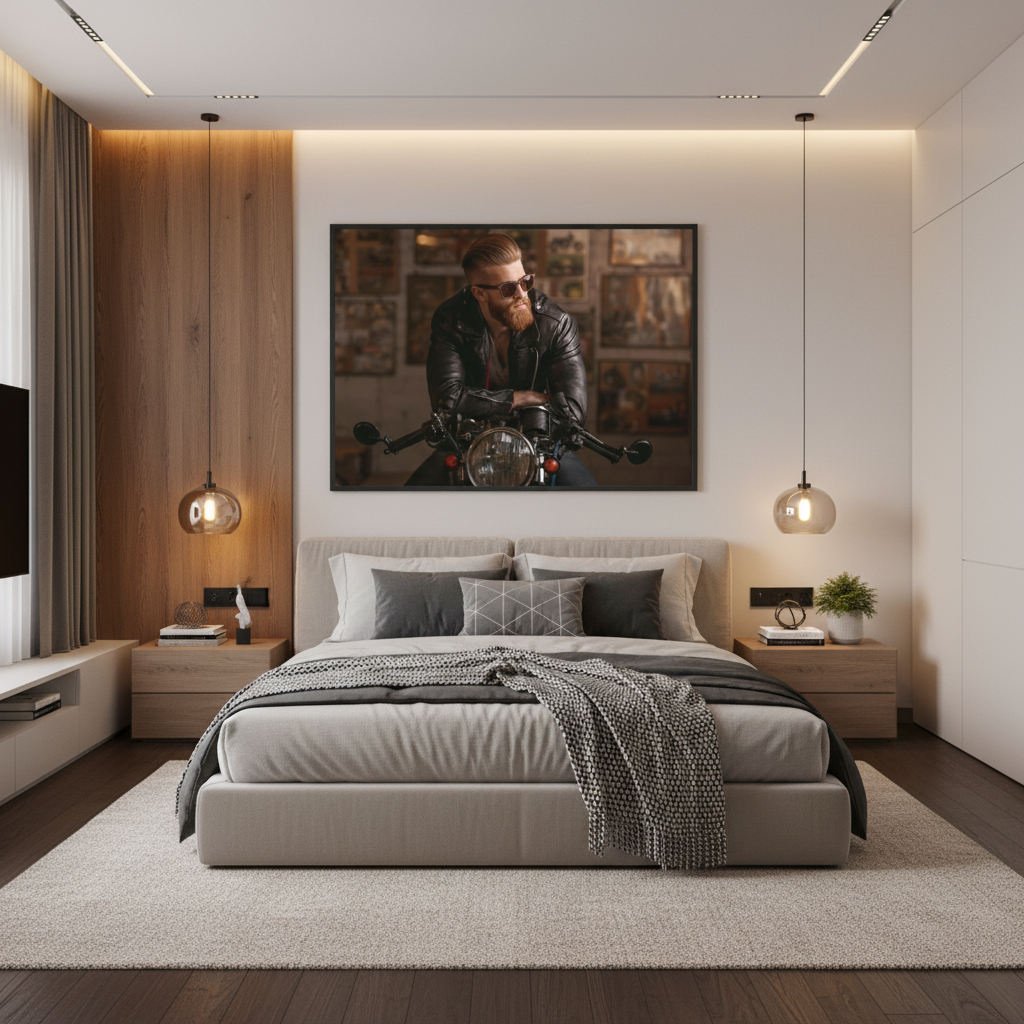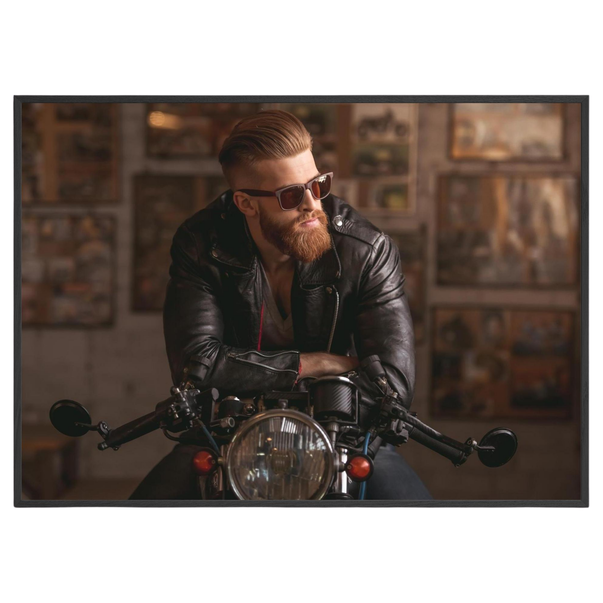 Channel your inner rebel with "Rebel Ride." This edgy framed poster showcases a cool biker aesthetic, ideal for adding a rugged touch to living rooms or garages. Perfect for gift buyers and those seeking unique digital art prints for home decor, it’s a standout piece that fuels adventure and individuality.