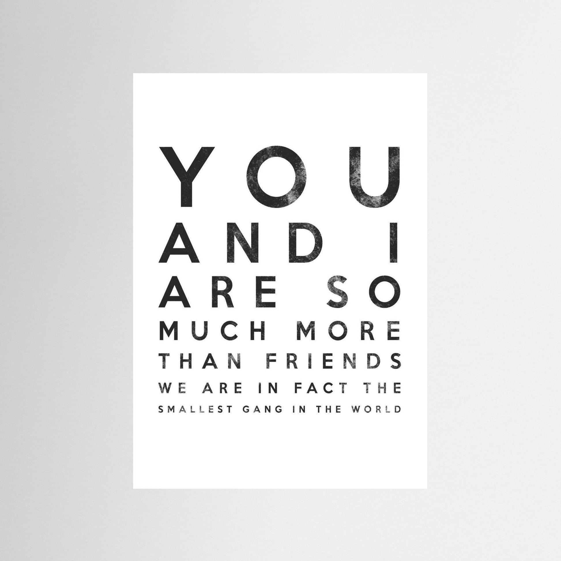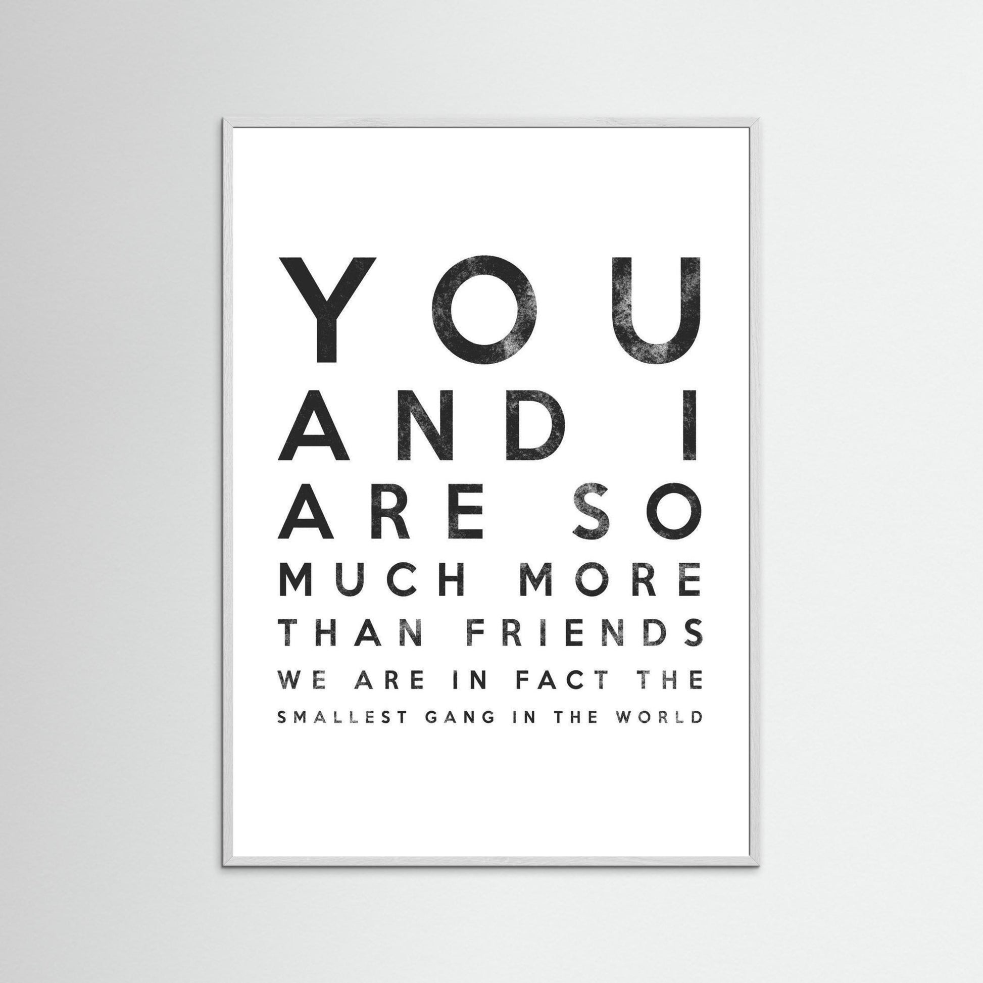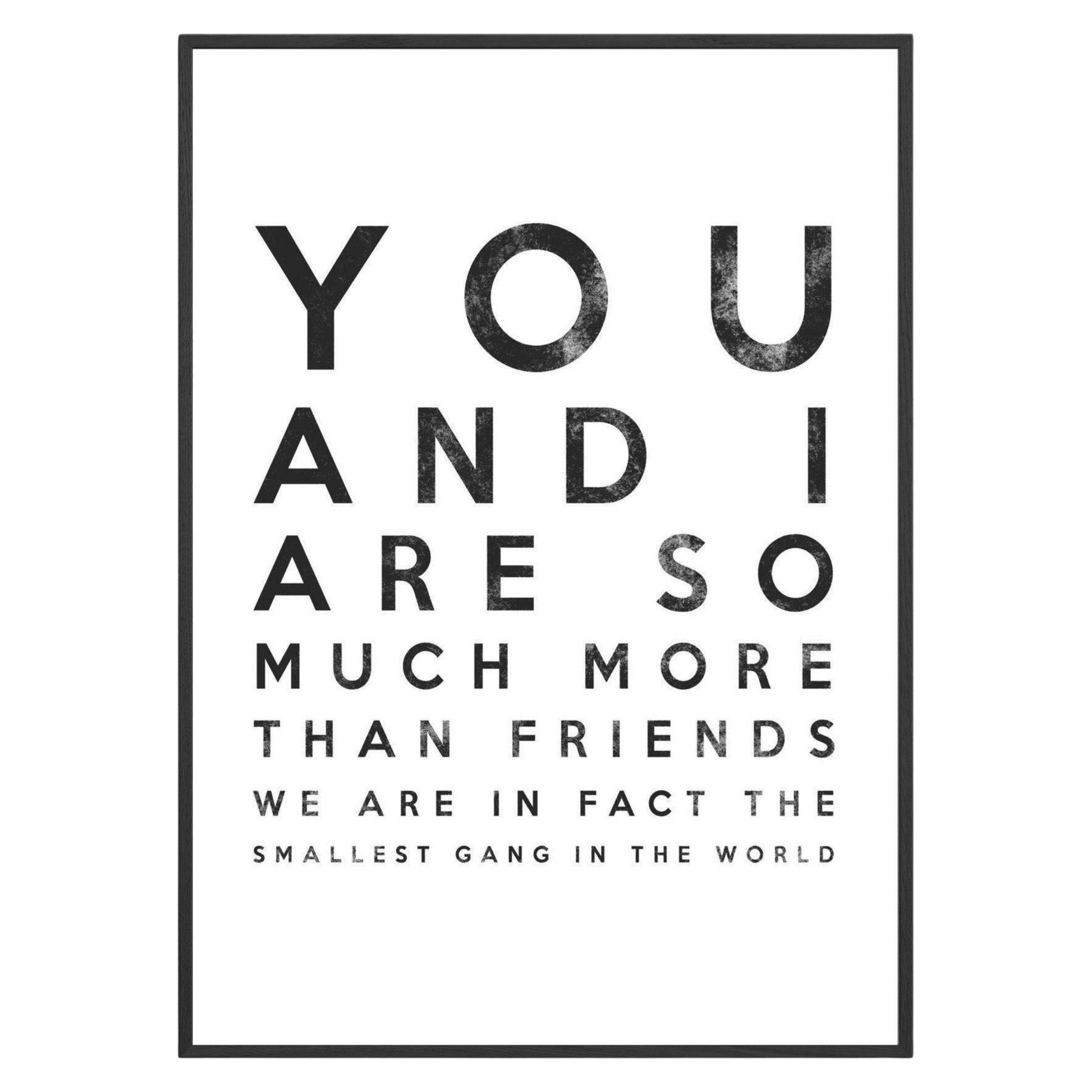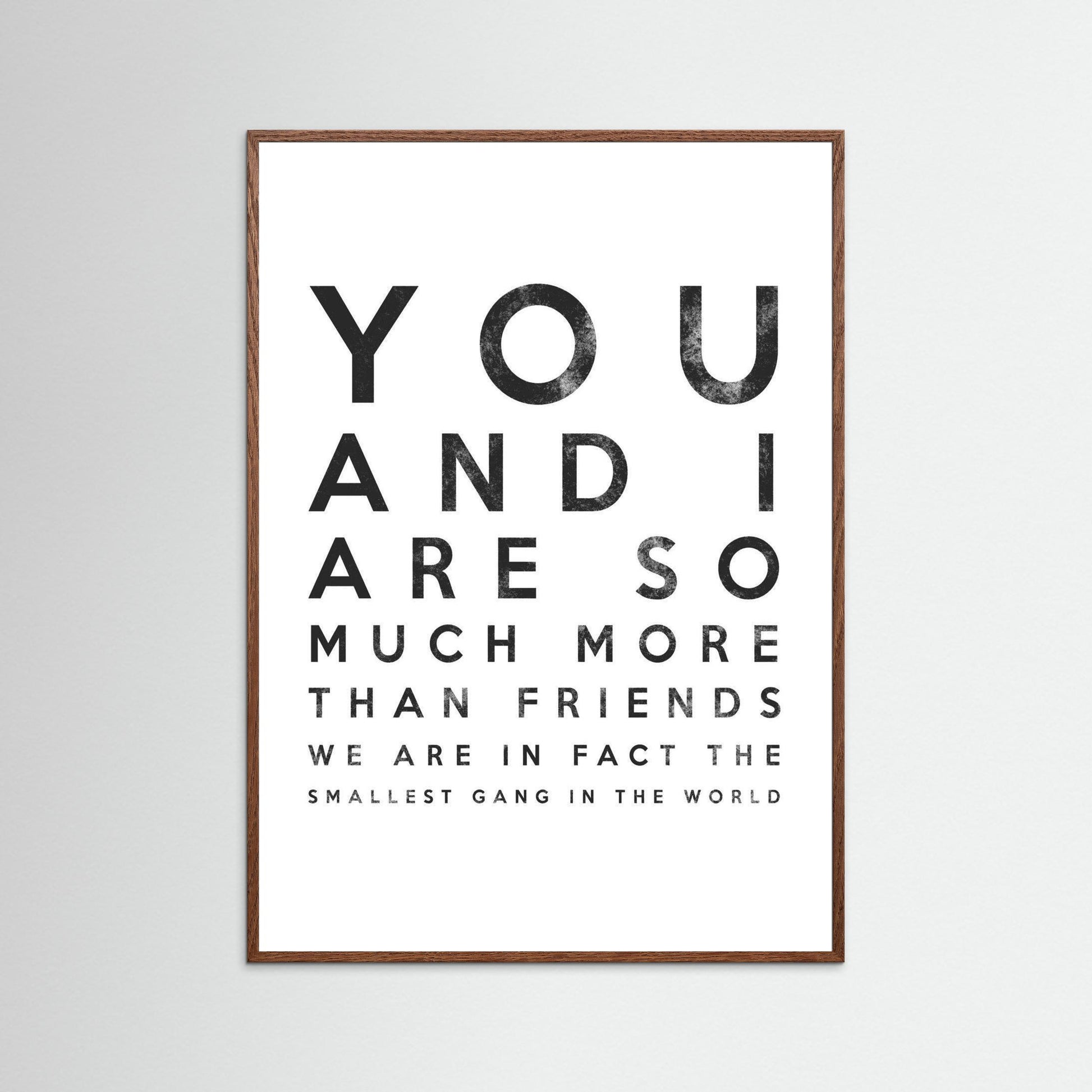"You and I are so much more than friends ; we are in fact the smallest gang in the world." This heartfelt design adds a personal touch to any living room or bedroom , making it a perfect gift for loved ones. Let your wall art decor resonate with love and friendship , turning your space into a sanctuary of