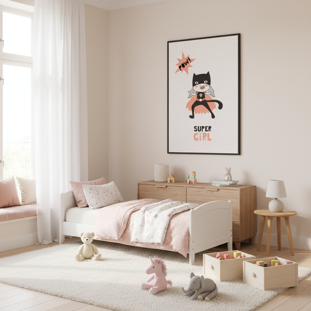 Unleash the hero within with our vibrant Kids Framed Poster Art showcasing a fierce feline superhero ! This playful design adds flair and empowerment to any child’s room, inspiring confidence and creativity . It’s a perfect gift for aspiring little heroes and a bold addition to your affordable poster frames collection . Transform your decor with this engaging artwork that