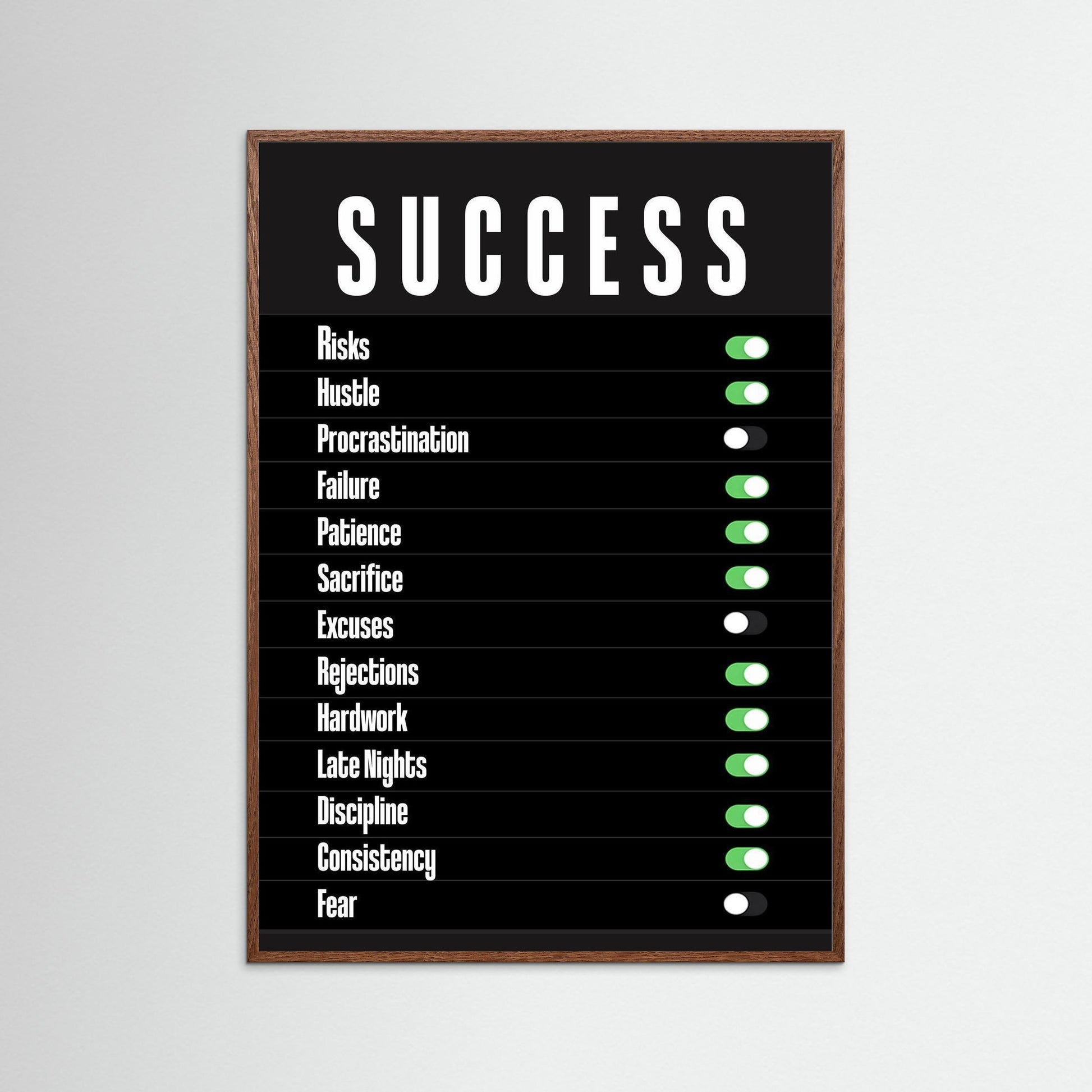 Illuminate your path to achievement with this striking "Success" framed poster art! Featuring a fun toggle switch design, it emphasizes key traits such as hustle, discipline , and patience , reminding you that success is within reach. Perfect for your office or living room, this wall art decor not only enhances your space but also inspires determination . Transform your home decor into a motivational masterpiece !